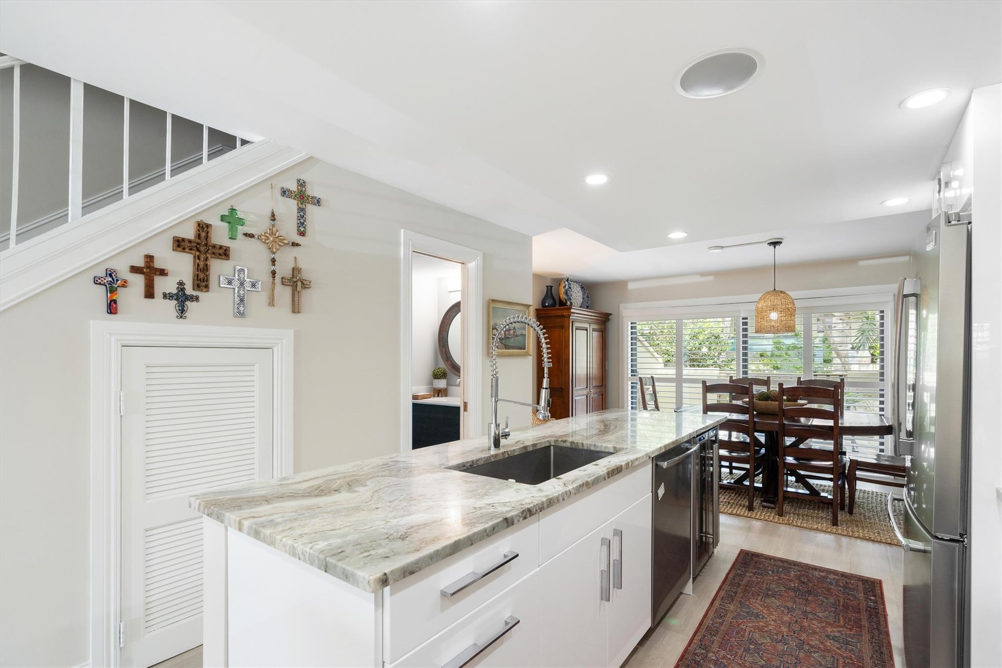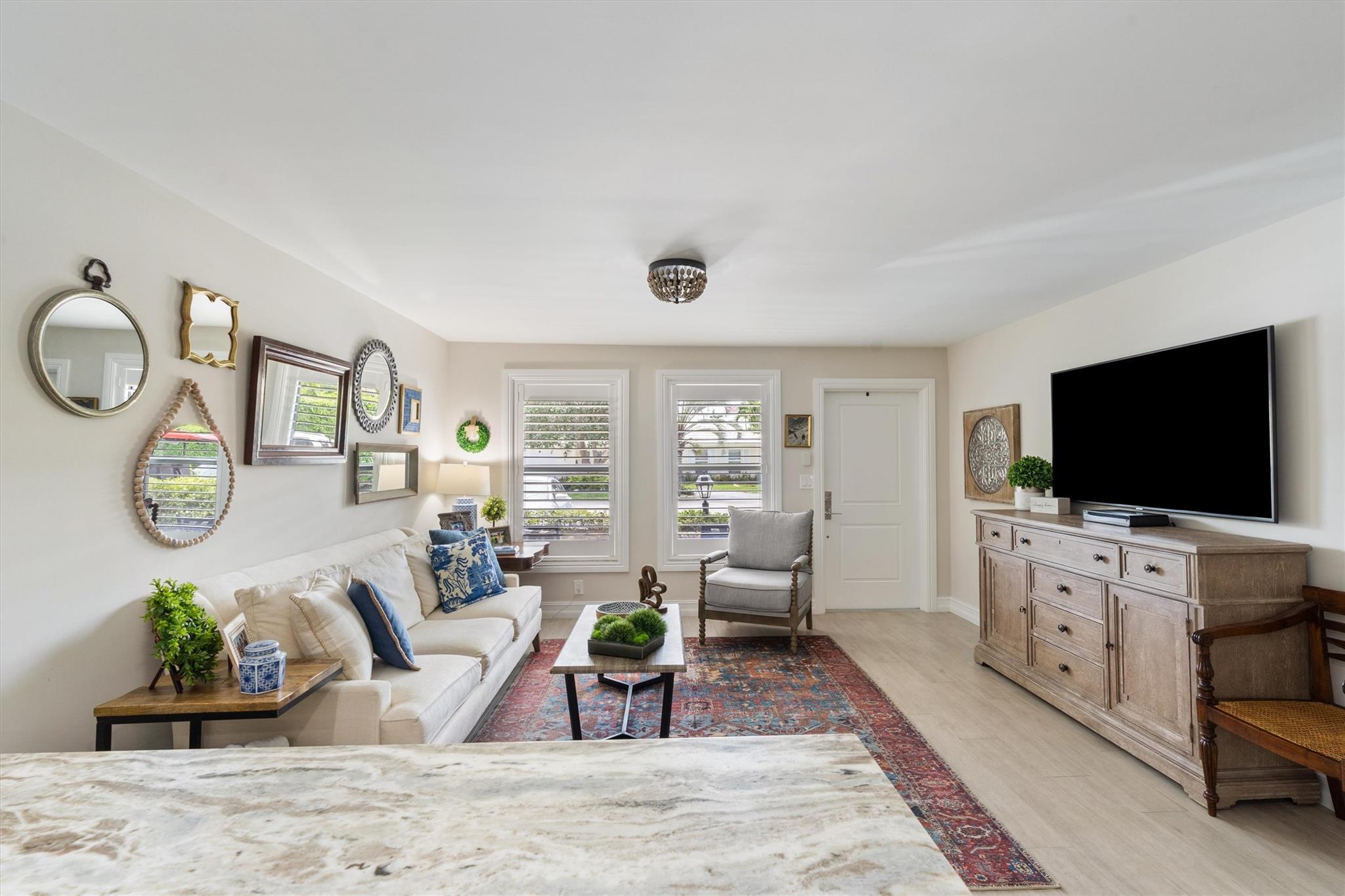 Meticulously renovated and move-in ready, this east side, two-story townhome is nestled between the prestigious Bay Colony and Lake Estates neighborhoods. This immaculate residence boasts two spacious bedrooms w/custom closets, en suite bathrooms (plus additional ground level half bath), impact windows and woodgrain tile throughout. Stunning kitchen renovation includes counter seating, elegant marble countertops, white cabinetry, LED lighting, stainless Frigidaire appliances and wine cooler. Tranquil, private courtyard w/travertine pavers and garden views, perfect for year-round FL entertaining. Community pool, clubhouse, bike room, and assigned storage. Covered front porch steps from 2 designated parking spaces. Walking distance to restaurants, shops and yoga or short drive to beach.