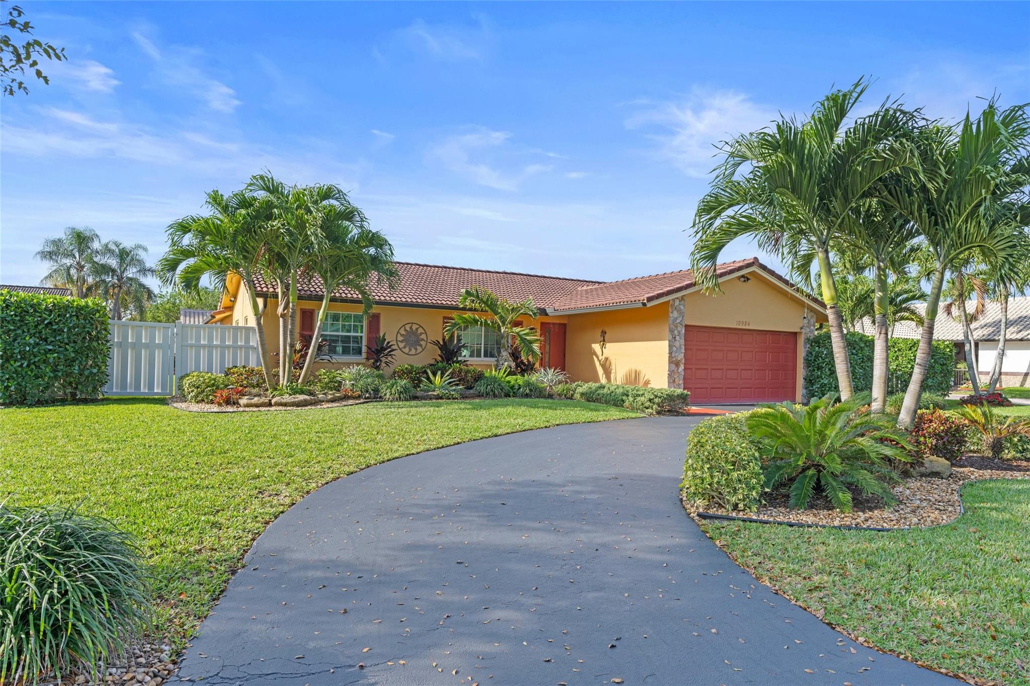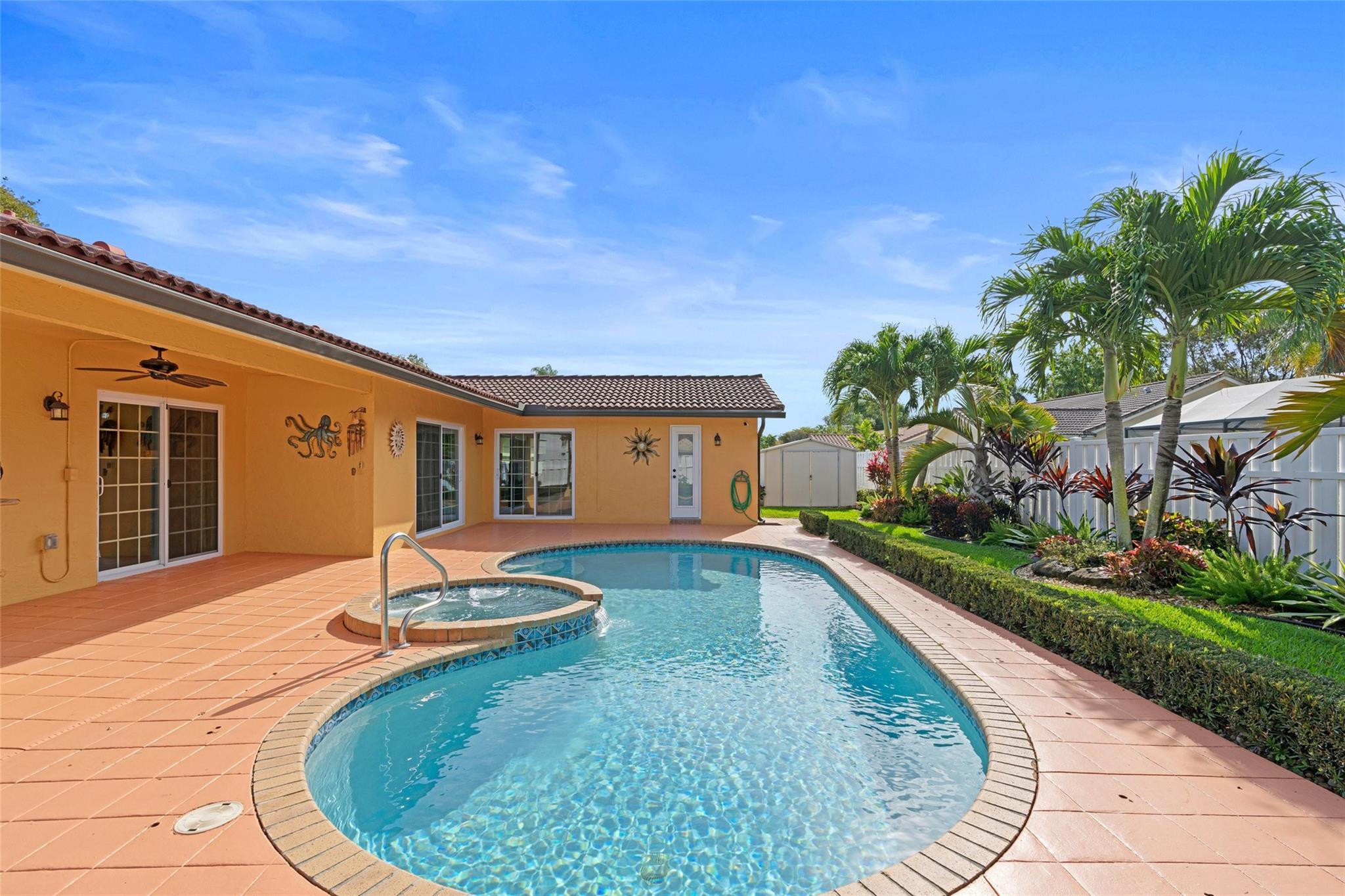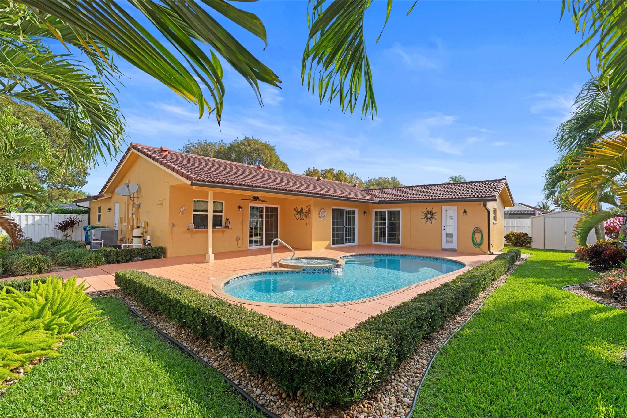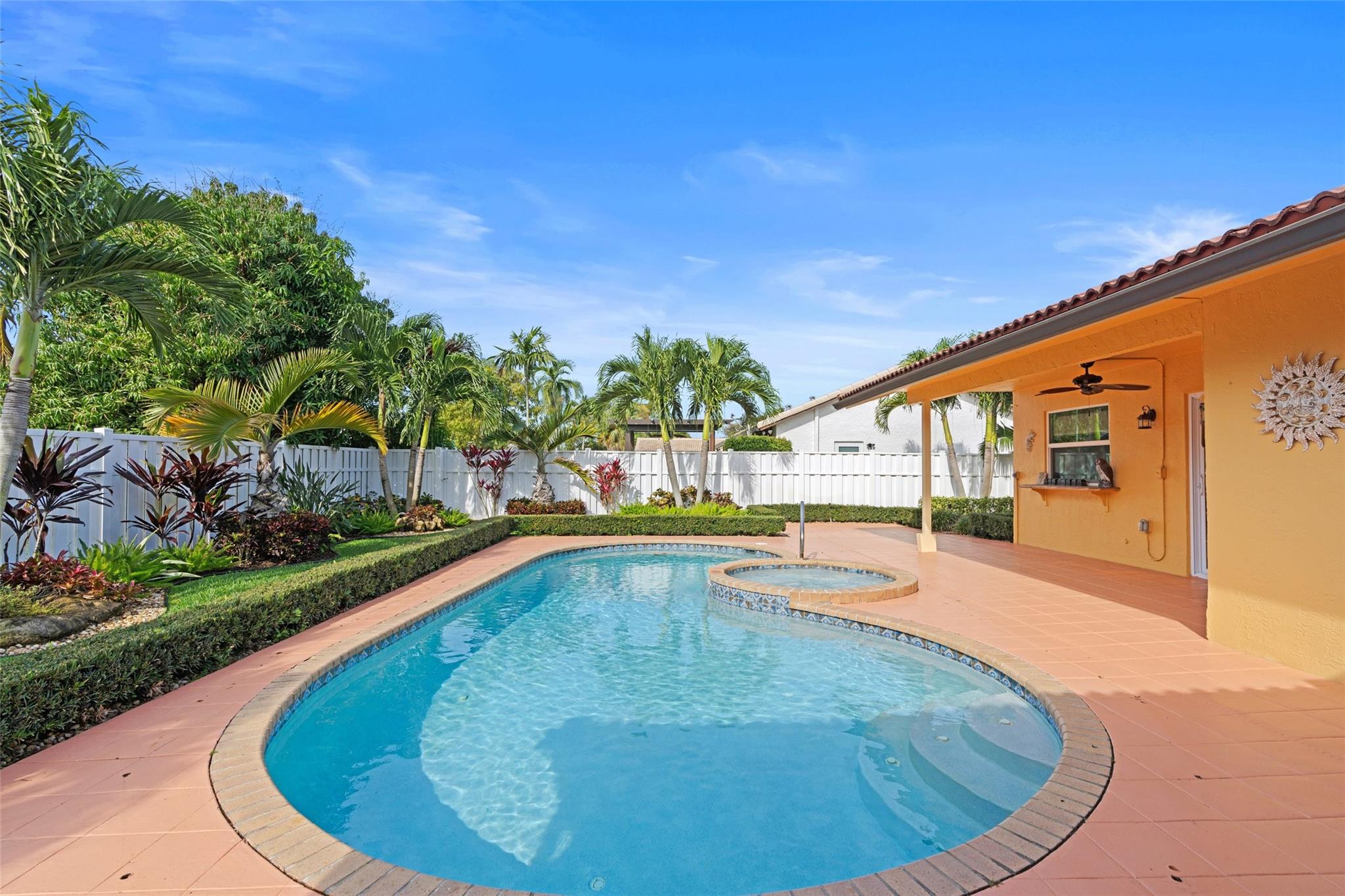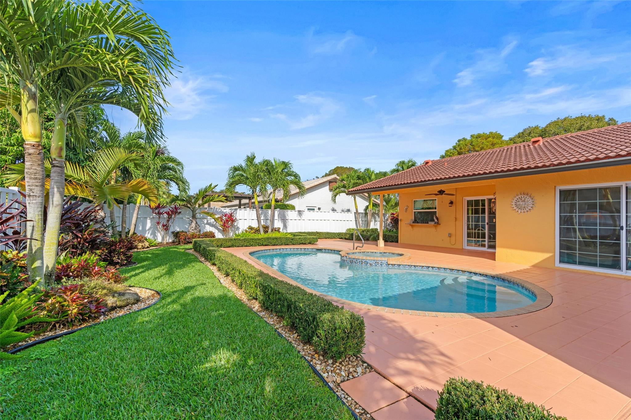 Stunning 3 bedroom single-family home with a private pool & jacuzzi. Open floor plan, vaulted ceilings, remodeled baths Outdoor oasis with lush tropical landscaping a covered patio & fully fenced yard great for entertaining. Freshly painted, new impact windows/doors, security system with cameras. AC with UV light. Circular driveway with 2 car garage. Great schools & parks close by!
