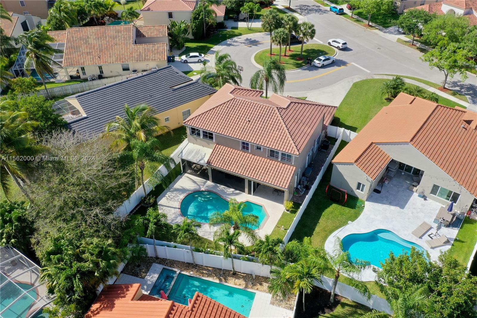 Beautiful Family Home on a cul-de-sac in prestigious North Lakes, Weston! Immaculate ideal layout for a large family with A+ Schools. 4 Bedrooms plus Den and 3 full Baths. Boasting 2-car garage, stunning tiled floors & hardwood upstairs, Kitchen is a chef's delight with SS appliances, spacious countertops, pull-out pantry drawers & breakfast nook. High vaulted ceilings in living area and formal dining room. The private backyard features a saltwater pool, new pump, screened porch, new fence & retractable awning. Additional highlights include plantation shutters, high-hat lighting, separate laundry room & accordion hurricane shutters. This home promises luxury, peace of mind & comfort. Conveniently located near Bonaventure, Weston Town Center Shops, Restaurants, Parks & access to highways.