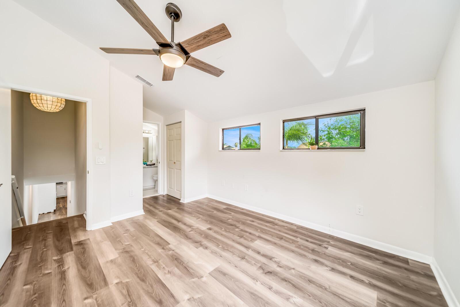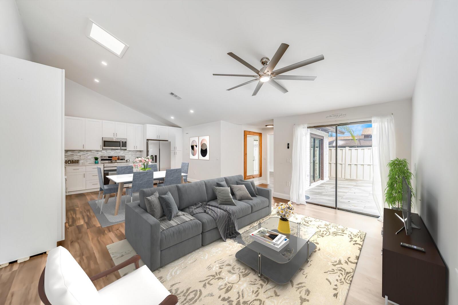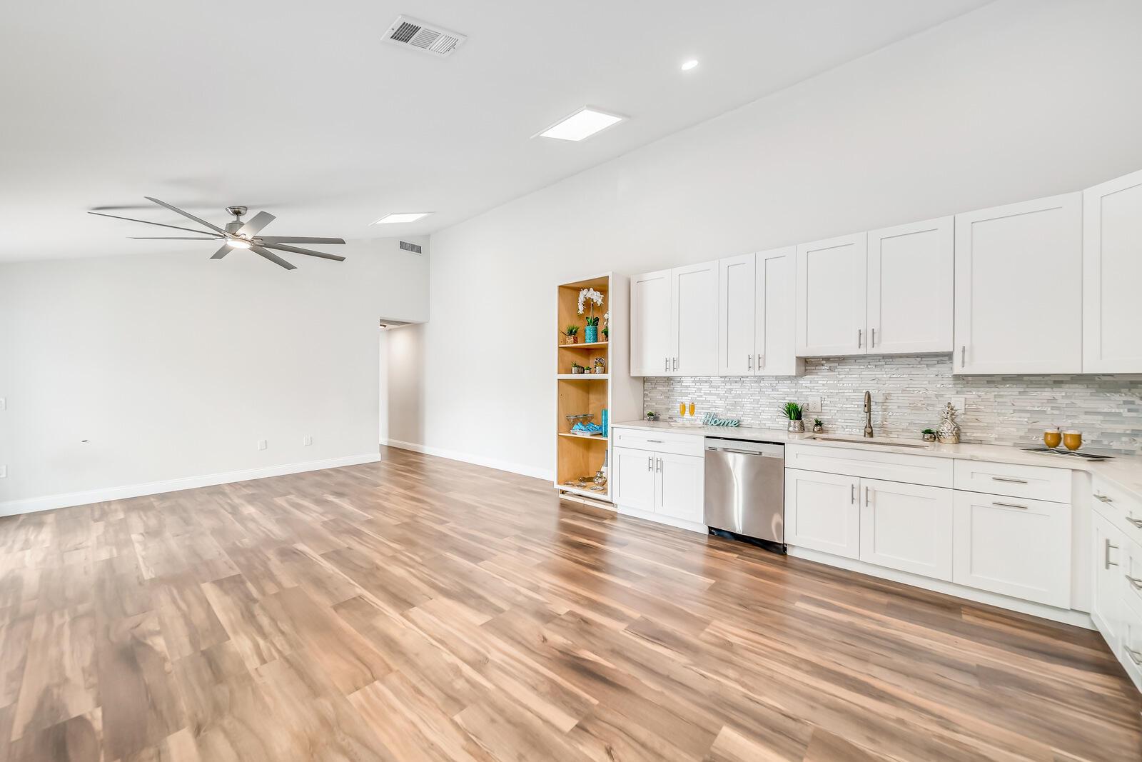 Totally updated, open and bright with soaring vaulted ceilings this townhome features three bedrooms, three-and-a-half-bathrooms, a one-car garage, attached driveway, an assigned parking spot, and guest parking. Private fenced in 800 square feet expansive courtyard entry with tile flooring is perfect for relaxation and entertaining! Luxury vinyl flooring throughout. Gourmet kitchen features newer modern updates including quartz counter tops, glass tile backsplash, stainless appliances, white shaker wood cabinetry, a huge stainless farmhouse sink and more! All bedrooms have there own En Suite bathrooms & all 4 bathrooms are updated. Guest/Cabana bath is convenient for swimmers.