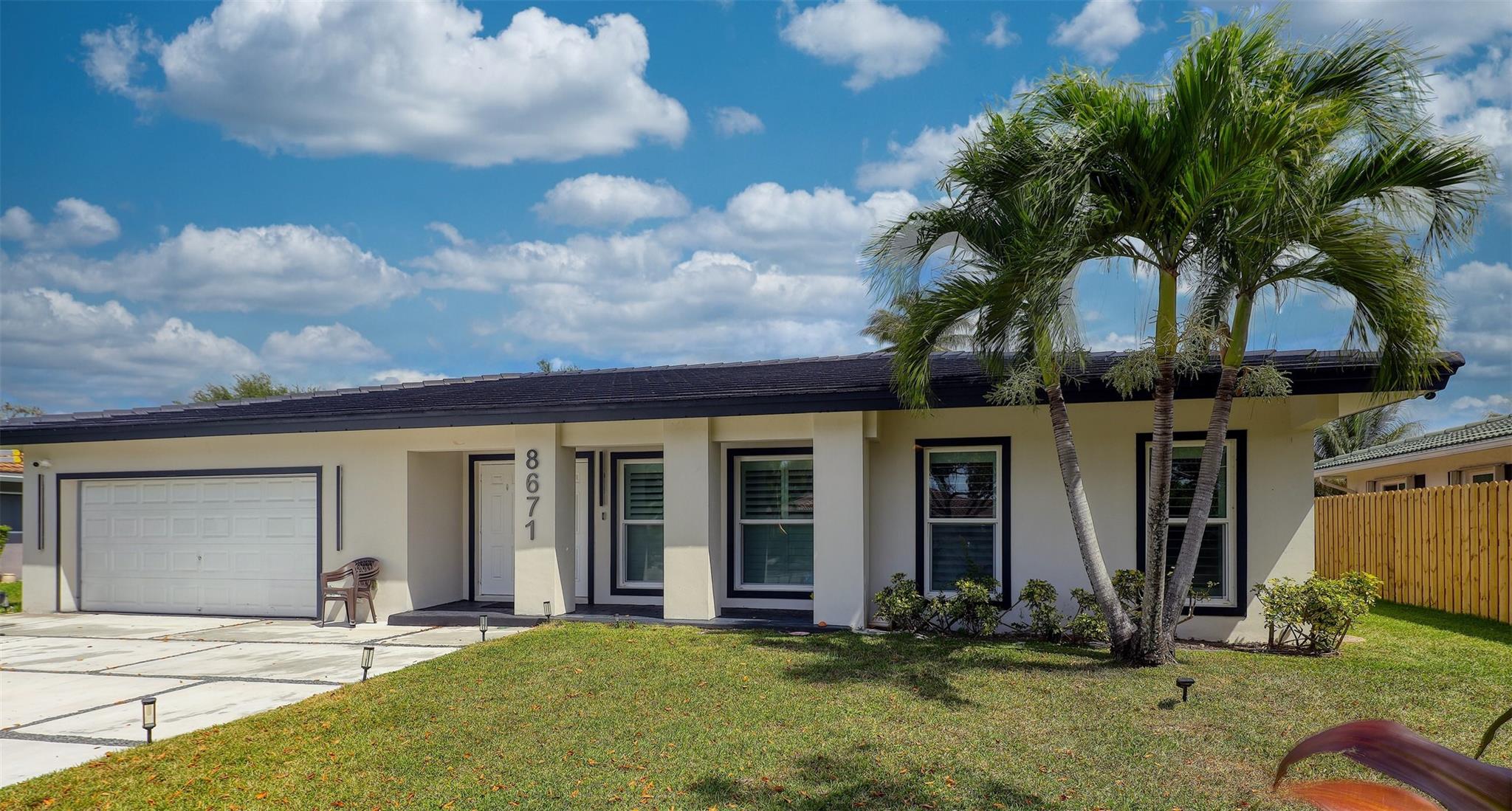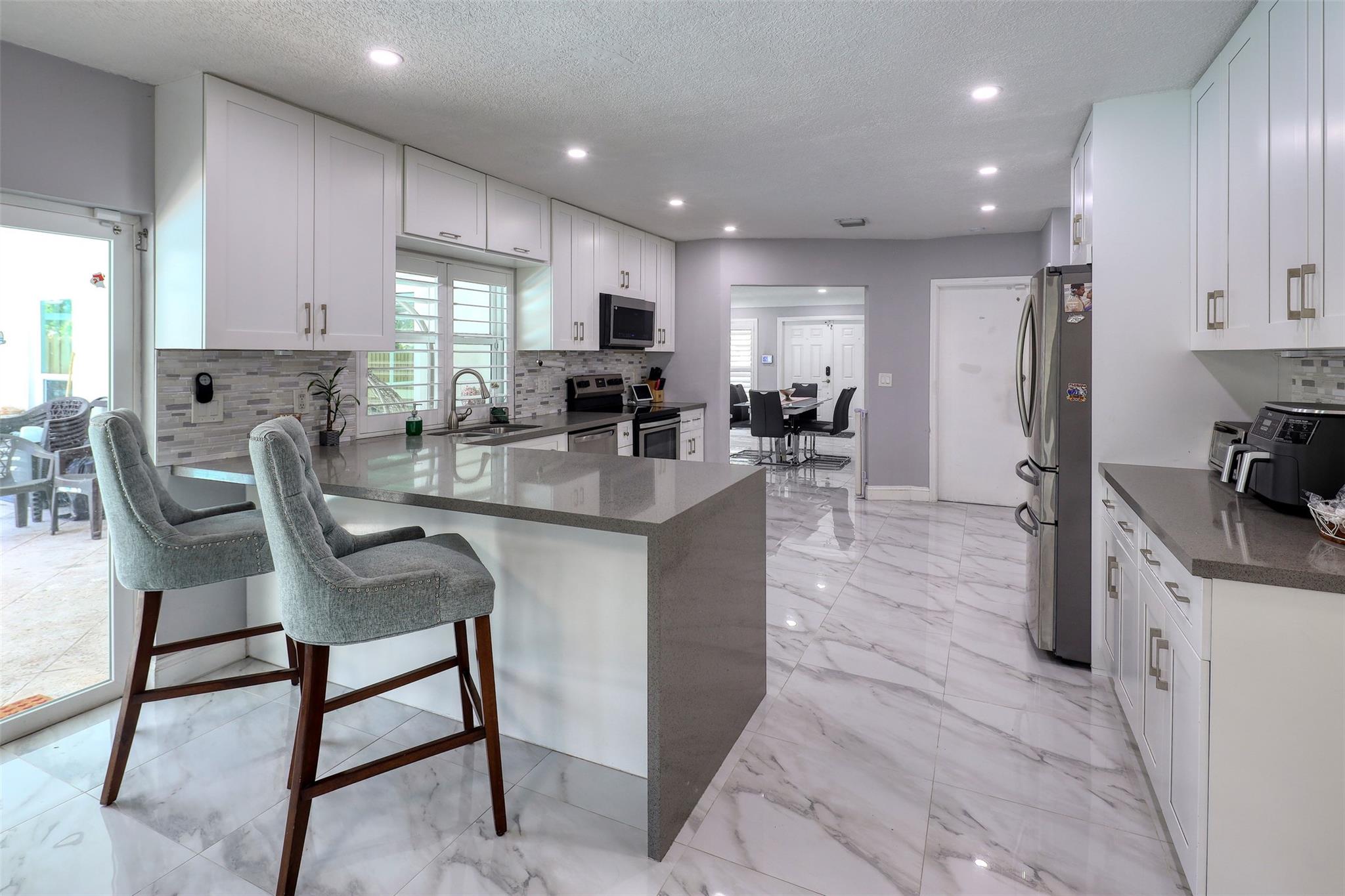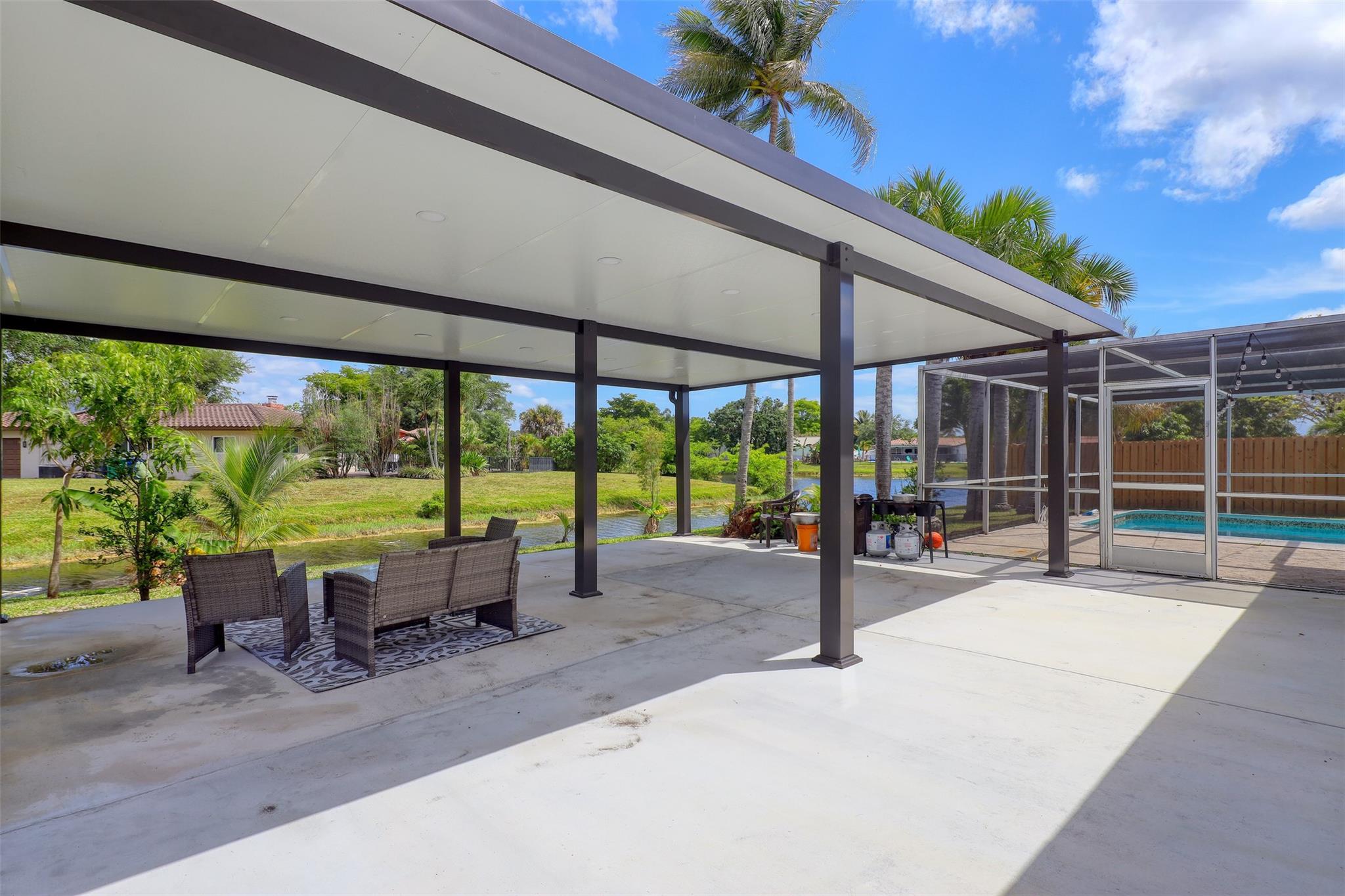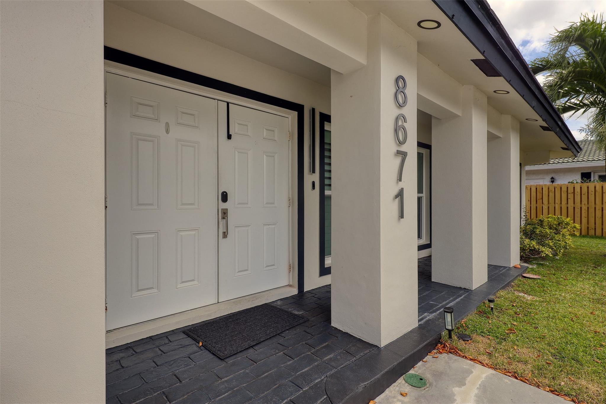 Entertainer's paradise in Coral Springs. This beautifully remodeled home boasts impact doors and windows, ensuring both safety and tranquility. Upon entering, you'll be greeted by tasteful upgrades such as recessed lighting and plantation shutters, along with bright porcelain flooring that spans the split floor plan layout. The home's inviting flow guides you seamlessly from the living room through the kitchen to the family room. The bathrooms are a highlight, featuring curb-less showers and lighted mirrors. Step outside through one of the two sets of sliding doors to the pool area, where you'll find a cabana bath, ample covered space with lights and fans, and a screened-in heated pool with a view to impress. Enjoy the serene ambiance of mature palm trees and peaceful water views. No HOA.