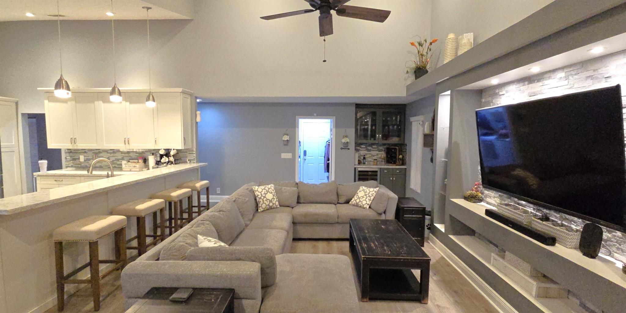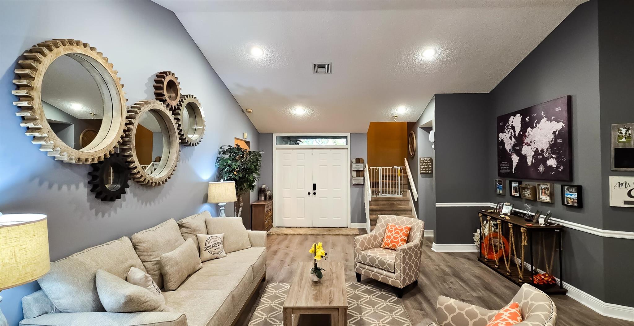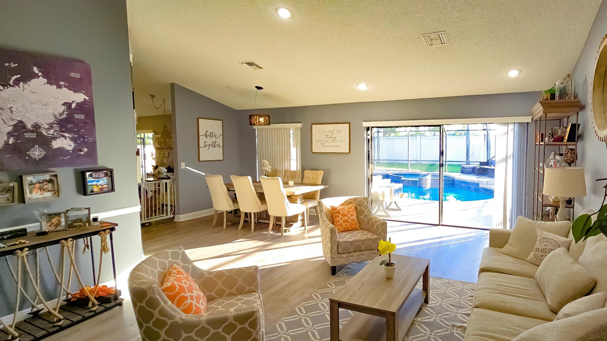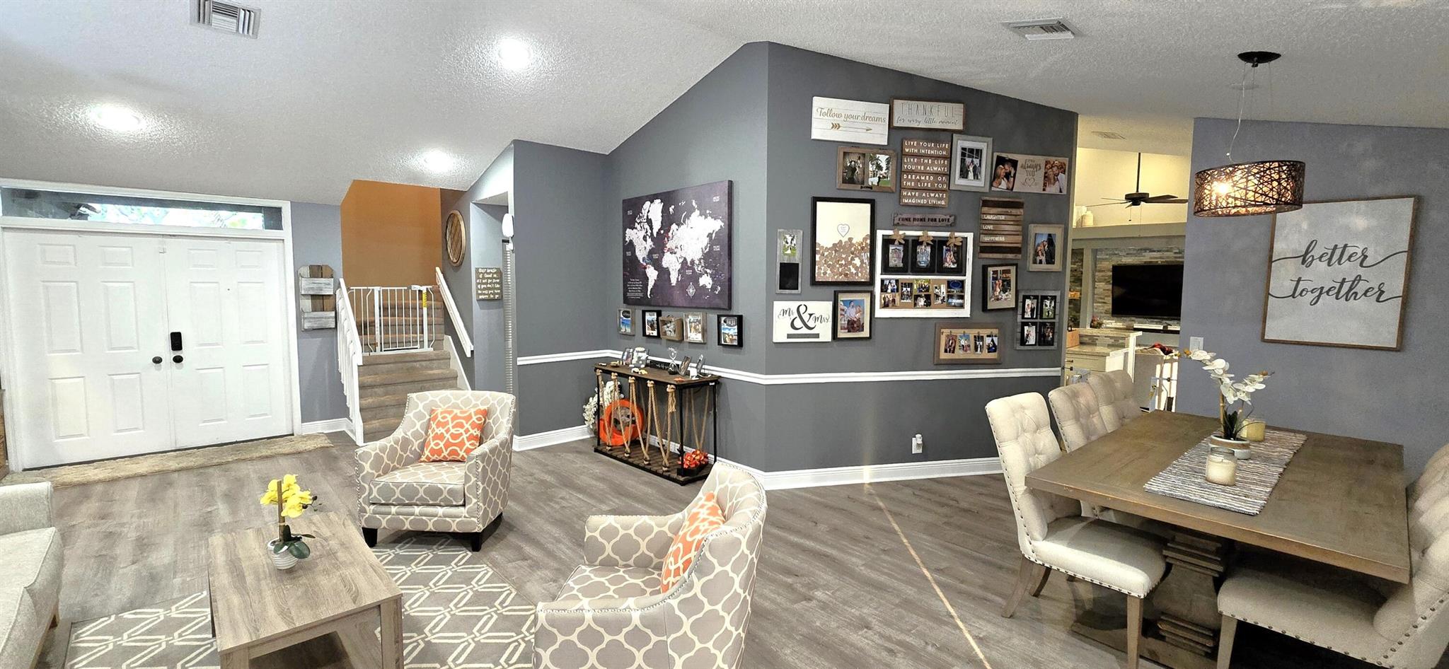 This stunning 4-bedroom, 3-bathroom pool home rests on one of Fox Run's largest lots, offering a rare opportunity in this prestigious community. With over 2500 square feet of living space, this two-story gem has been tastefully updated. High-end vinyl plank flooring graces the first-floor living areas, creating an elegant ambiance. Upon entry, a spacious formal living and dining room welcome you. The expansive master suite, located on the first floor, boasts its own private entrance, a screened-in patio, wood floors, an en-suite bathroom, and a walk-in closet. Another bedroom and full bathroom are conveniently situated on the first floor. The updated kitchen showcases white shaker cabinets, quartz countertops, and stainless steel appliances. A dry bar, complemented by a wine cooler, and