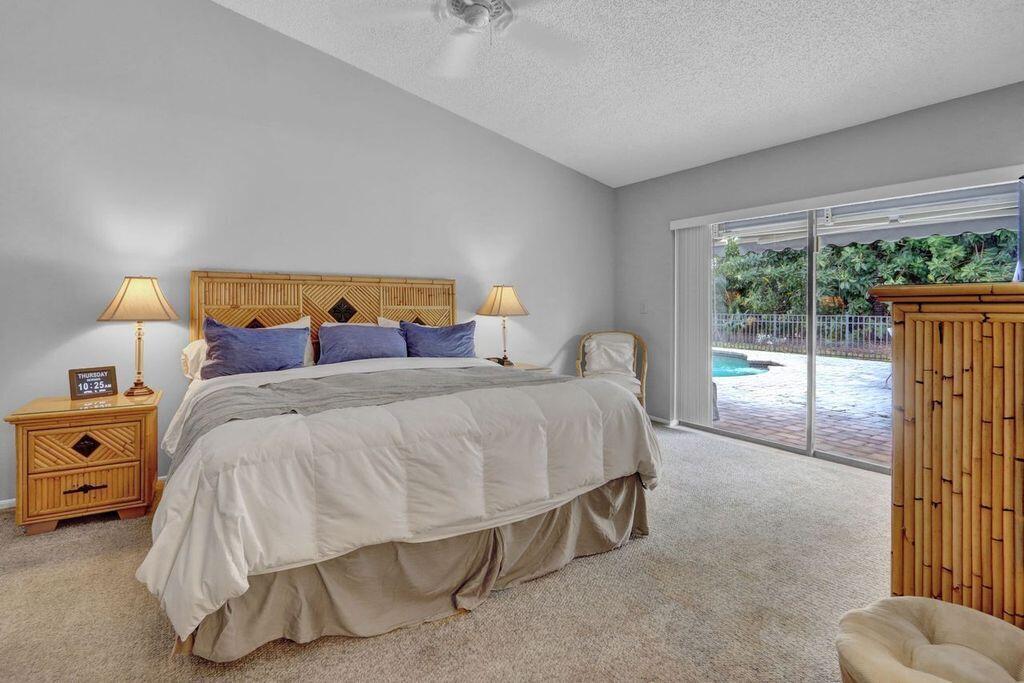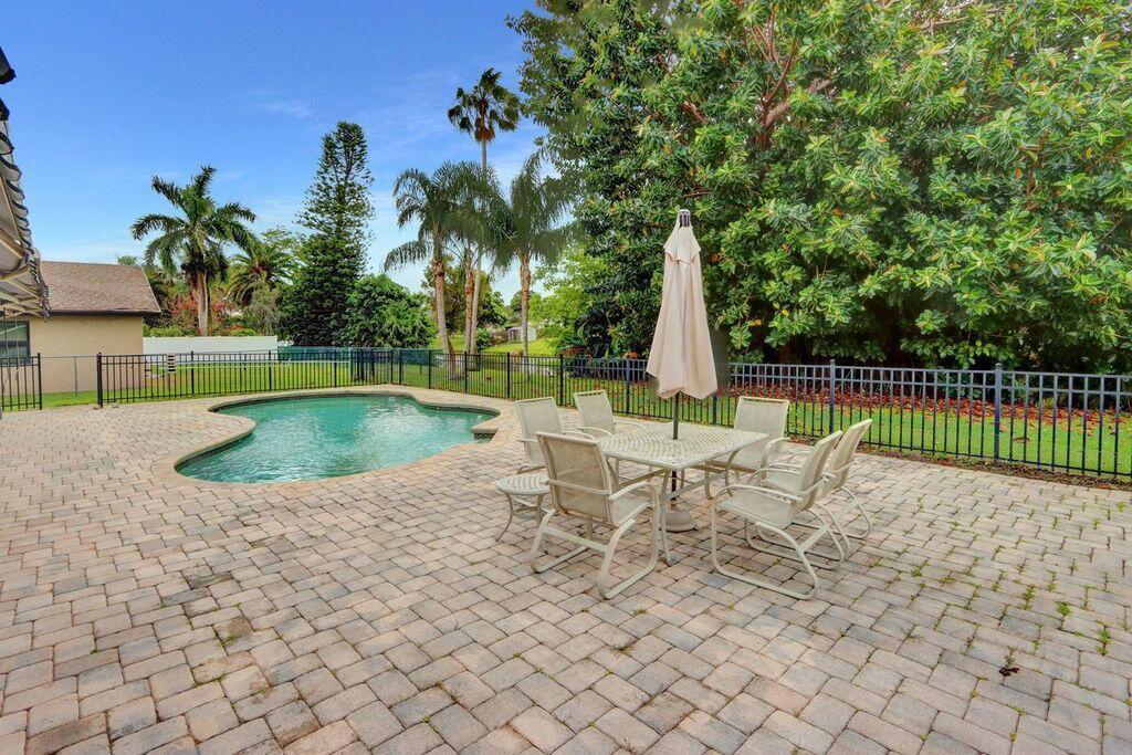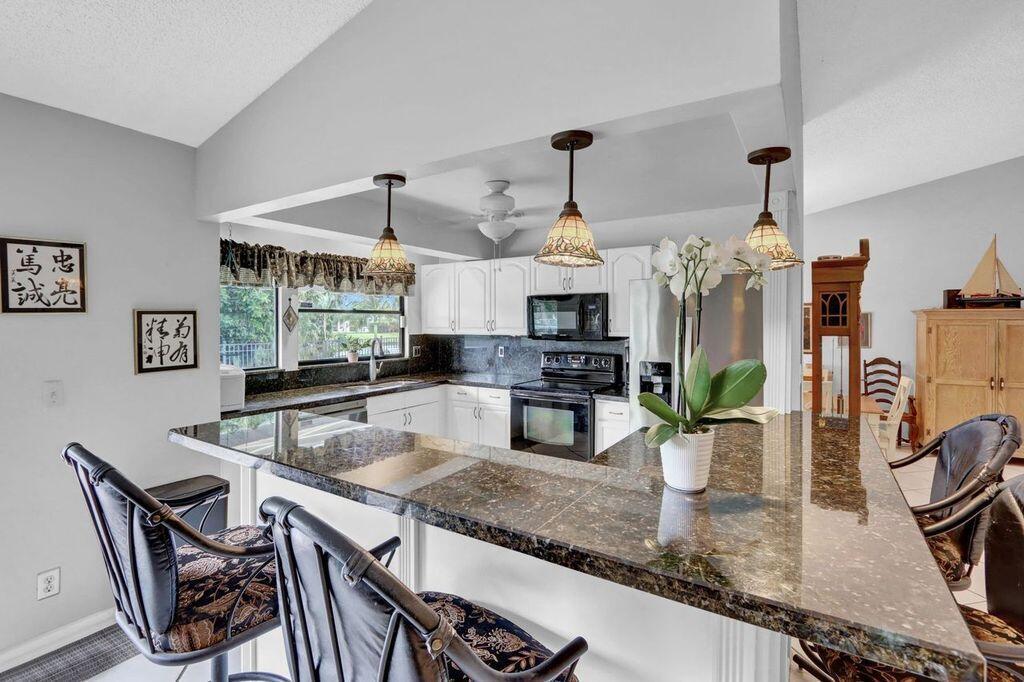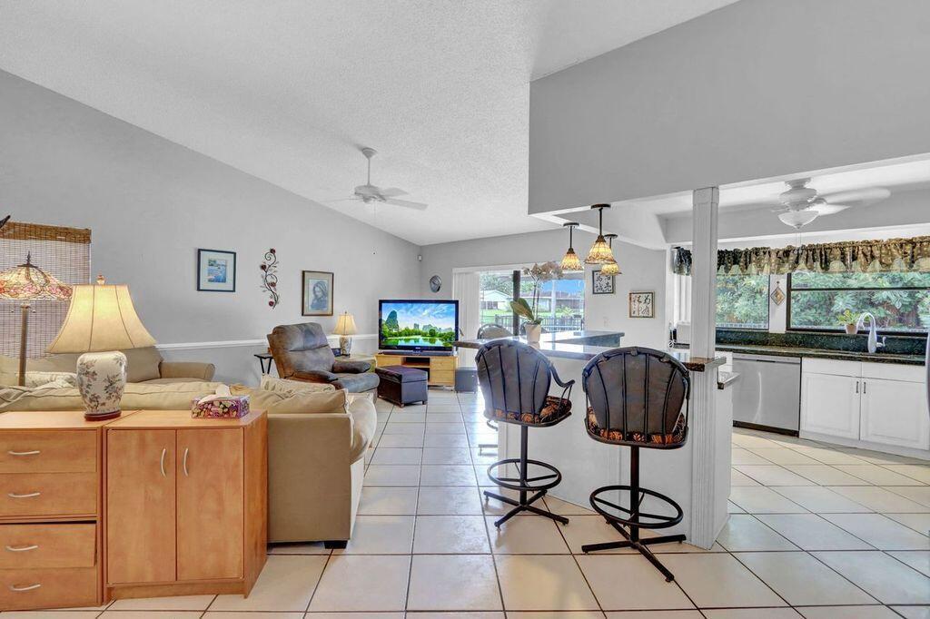 This charming one-story home of 3 bedrooms & 2 baths features an inviting backyard with tranquil lake views offering a spacious fenced-in patio with a freeform pool and retractable awning. Interior features include a lovely kitchen with white cabinetry, granite countertops & a stainless steel refrigerator & dishwasher; a sunken living room; white tile in the living areas and neutral carpeting & vinyl flooring in the bedrooms. Washer & dryer are in the garage; metal panel shutters; circular driveway & 2-car garage. Non-motorized boats permitted on the water.