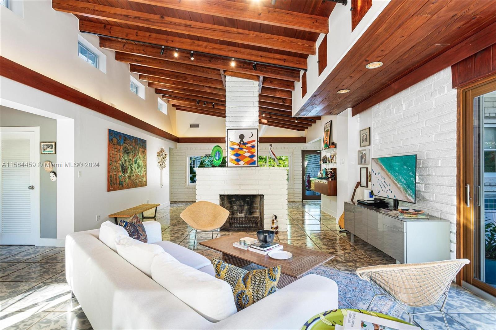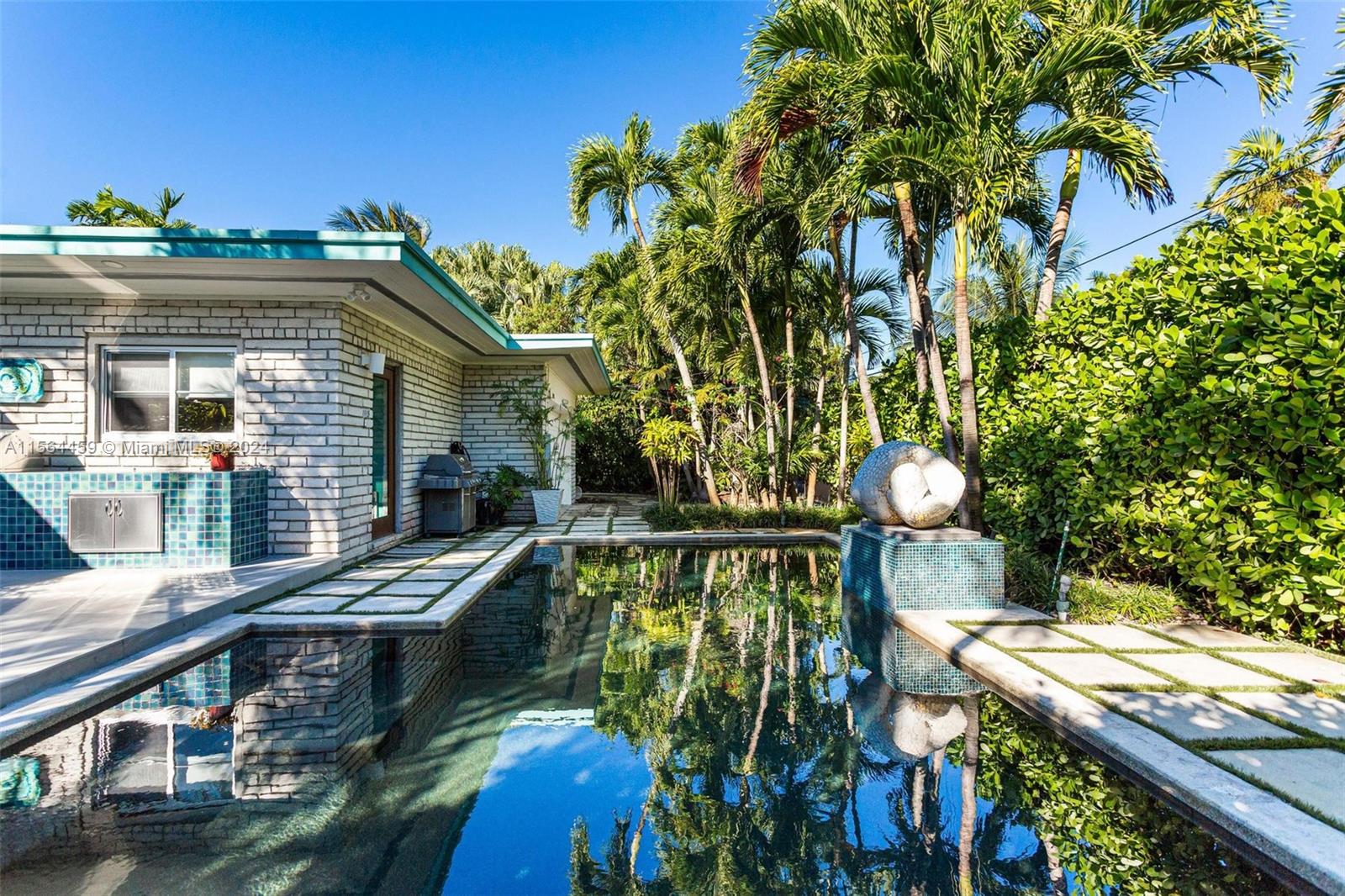 Mid-century gem by Florida tropical modern architect Alfred Browning Parker. A truly special house in Eastern Miami Shores, one block from the bay. Built in 1949, the house features original Cuban tile, cathedral ceilings, soffits, cove lighting, and concrete brick walls. Light filled with garden paradise views. 3 good sized bedrooms, 2 bathrooms. Primary is en suite. The eat-in kitchen features a large island, wood cabinets, and stainless steel appliances including a large sub zero. Outdoor kitchen, patio, and zen pool give a resort feel. Large 2 car garage with storage, laundry, and AC. Impact windows and doors, newer roof and AC units, outdoor lights and sprinklers. Front and rear 2 car driveways and gated backyard. This historically designated design-lover’s dream won't last!