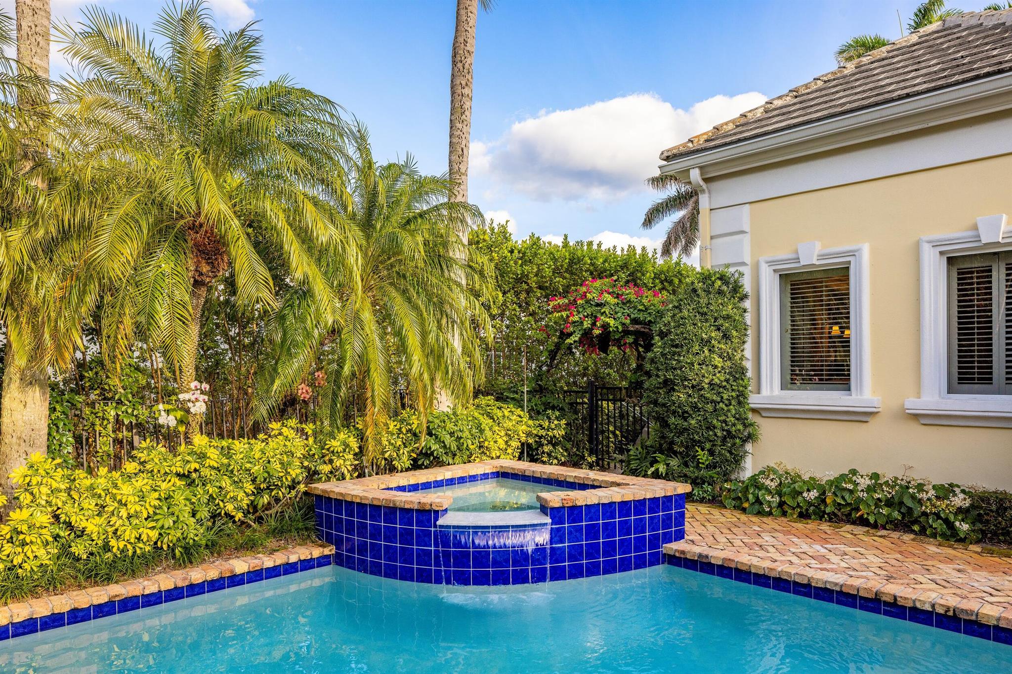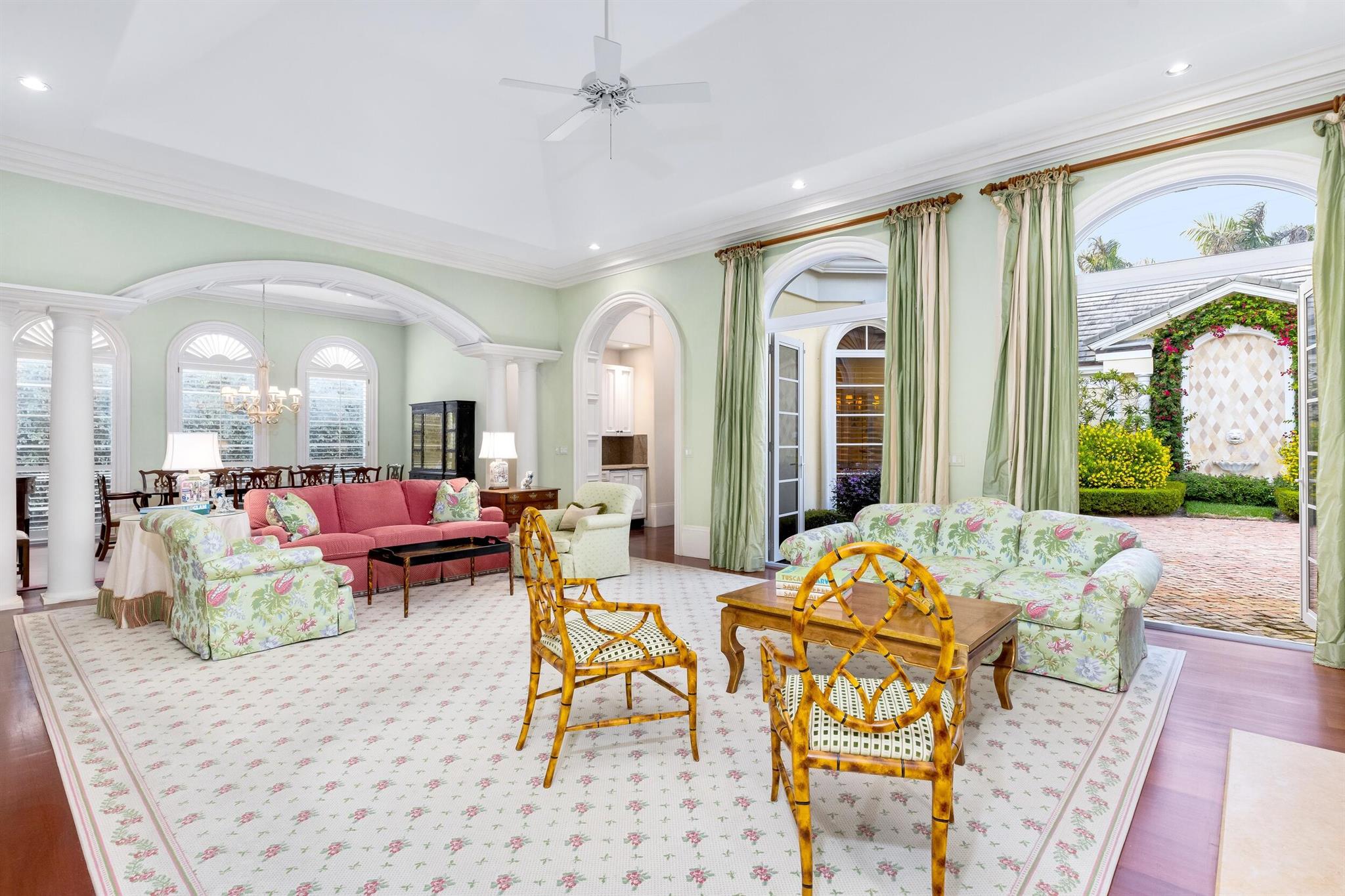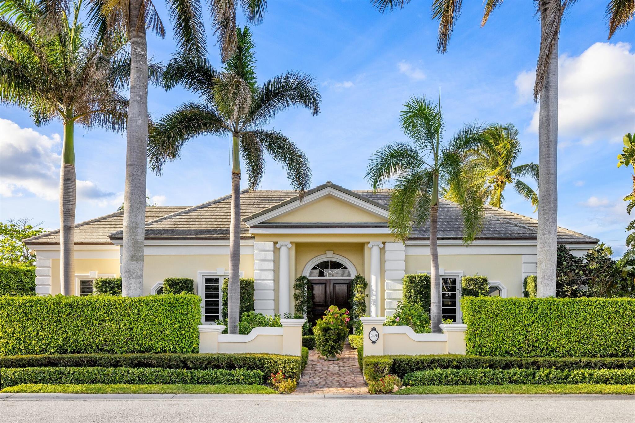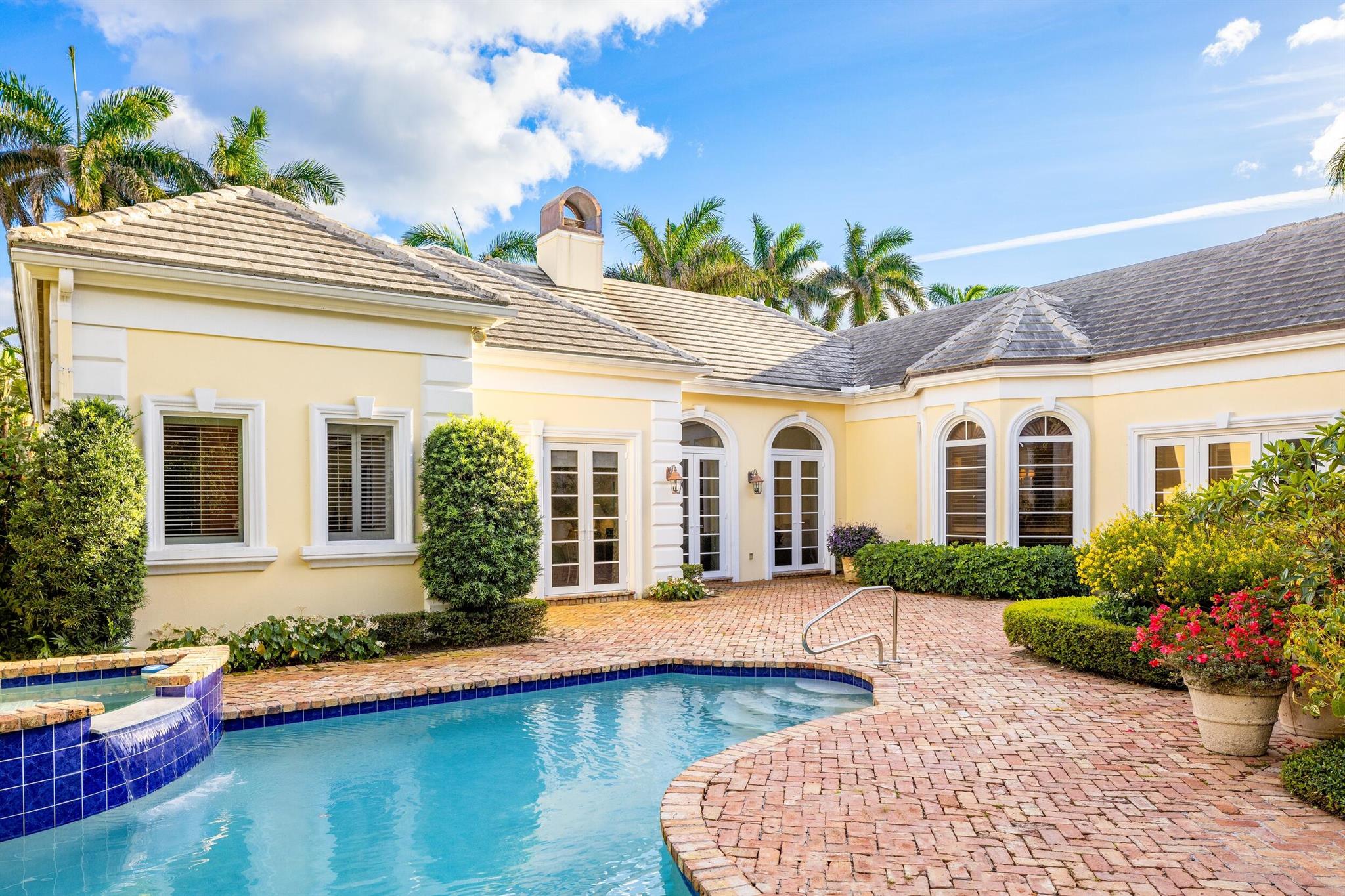 This one-story North End Palm Beach home features five bedrooms, a chef's kitchen, formal dining room, and elegant living areas with high ceilings and hardwood floors throughout. The primary wing includes a spacious luxury bathroom, walk-in closets, and an office/bedroom with its own ensuite bathroom. The family and living rooms and kitchen overlook the lush backyard and pool. A cabana/bedroom with an ensuite bath is located next to the pool behind the 2-car garage, providing privacy for guests to enjoy the backyard in peace.