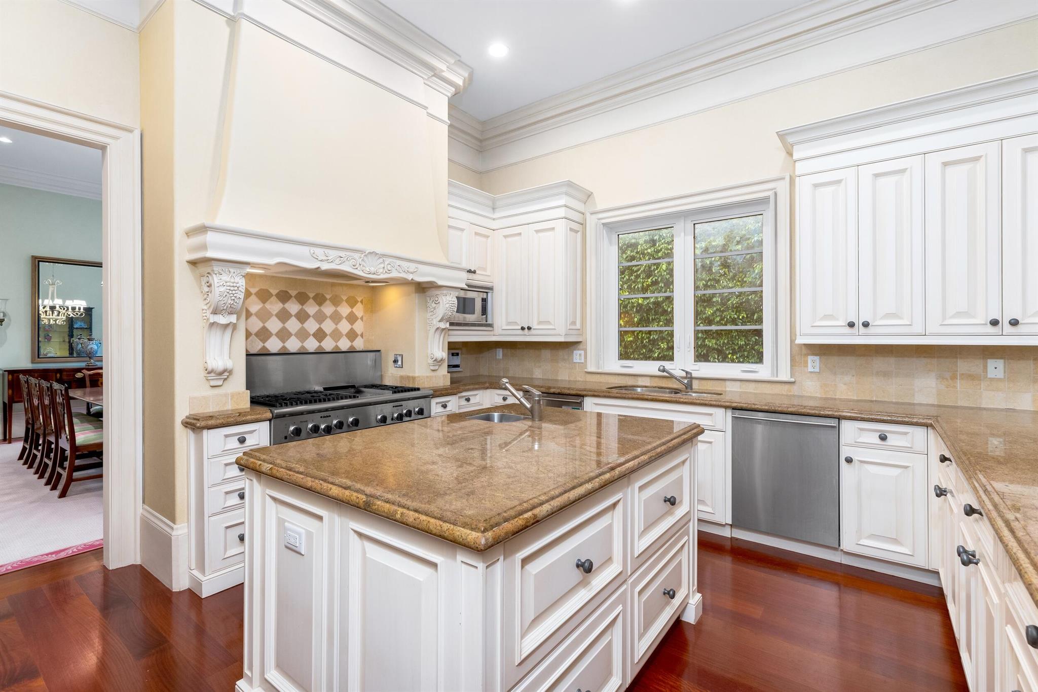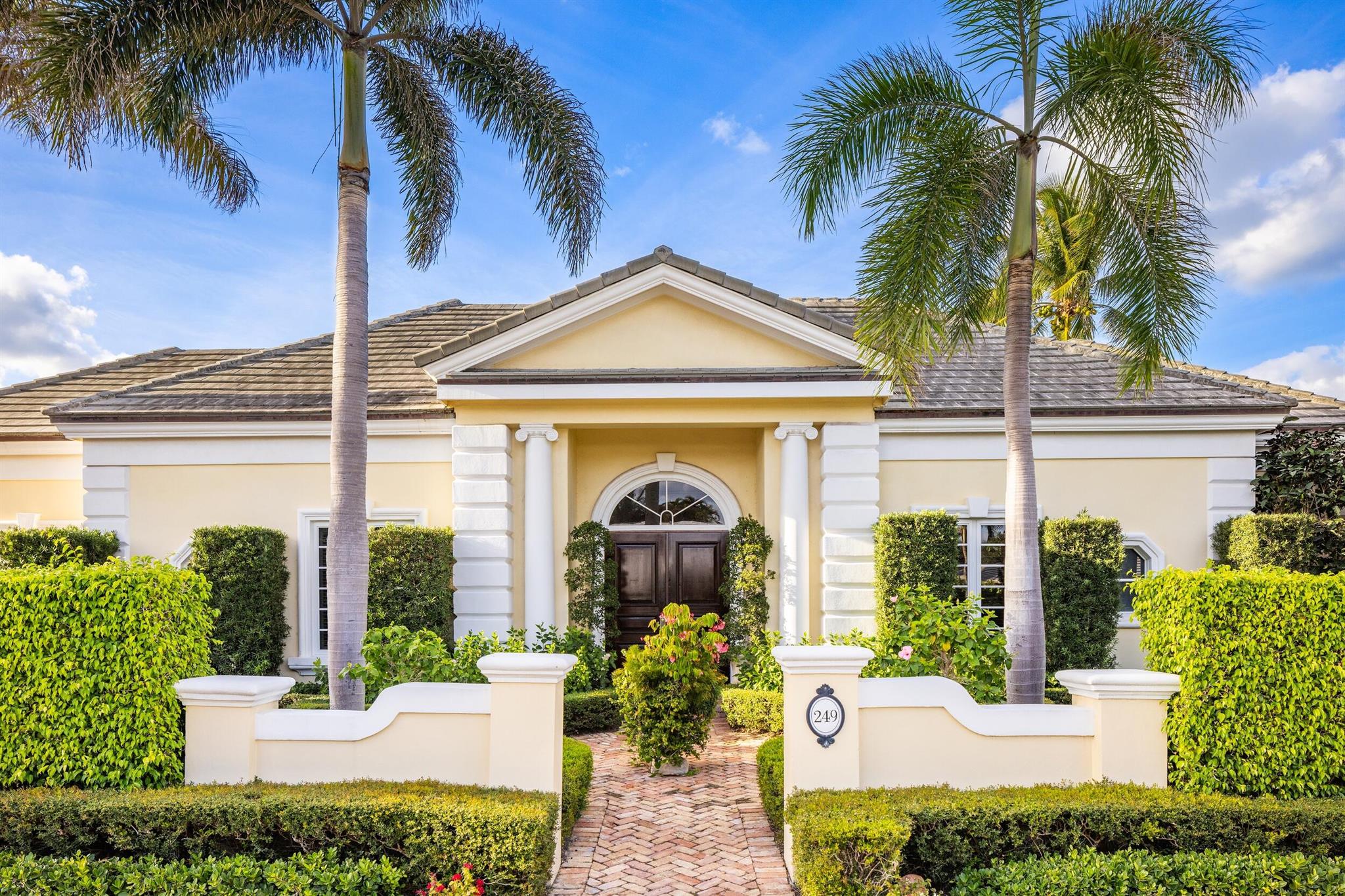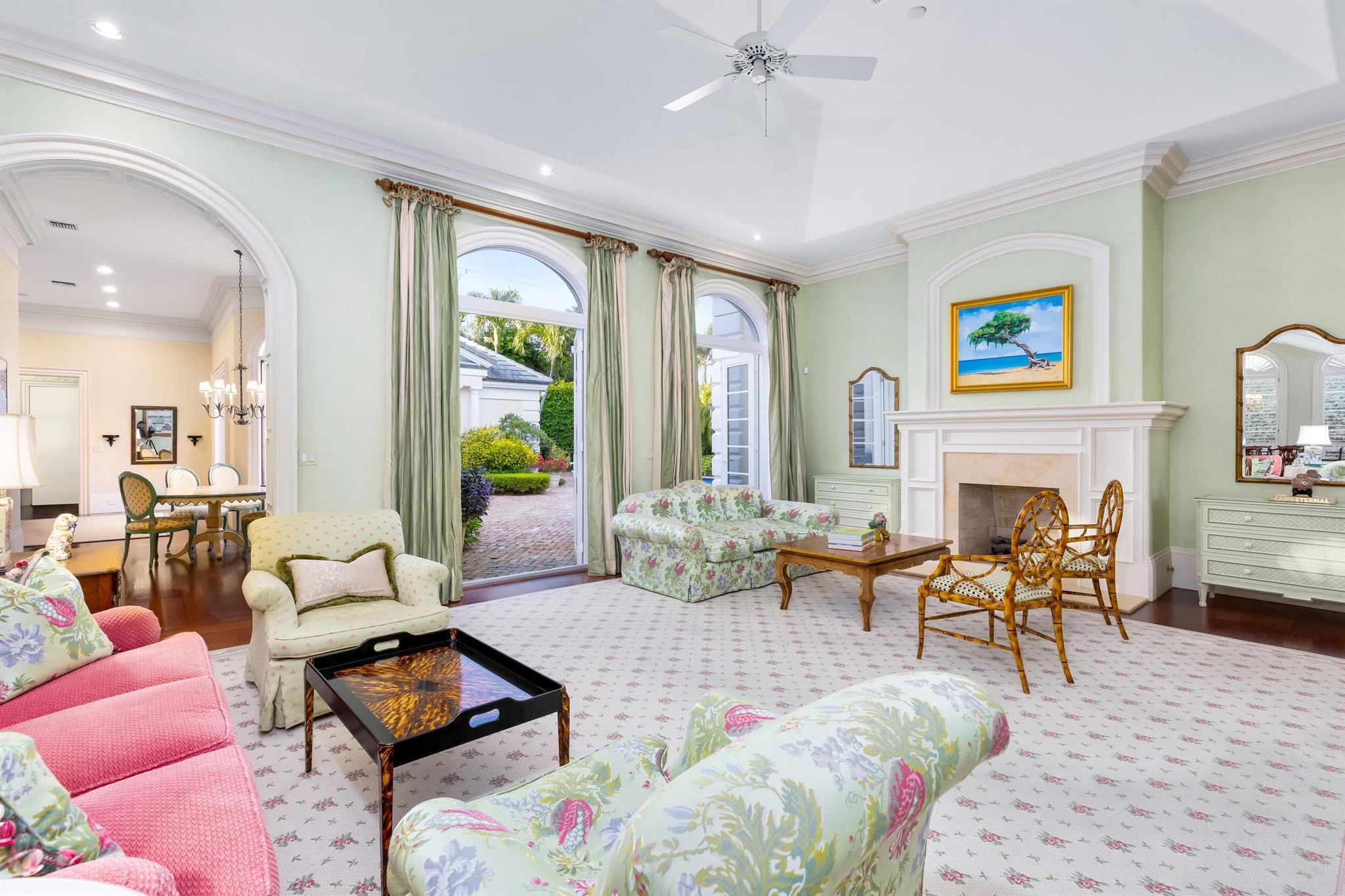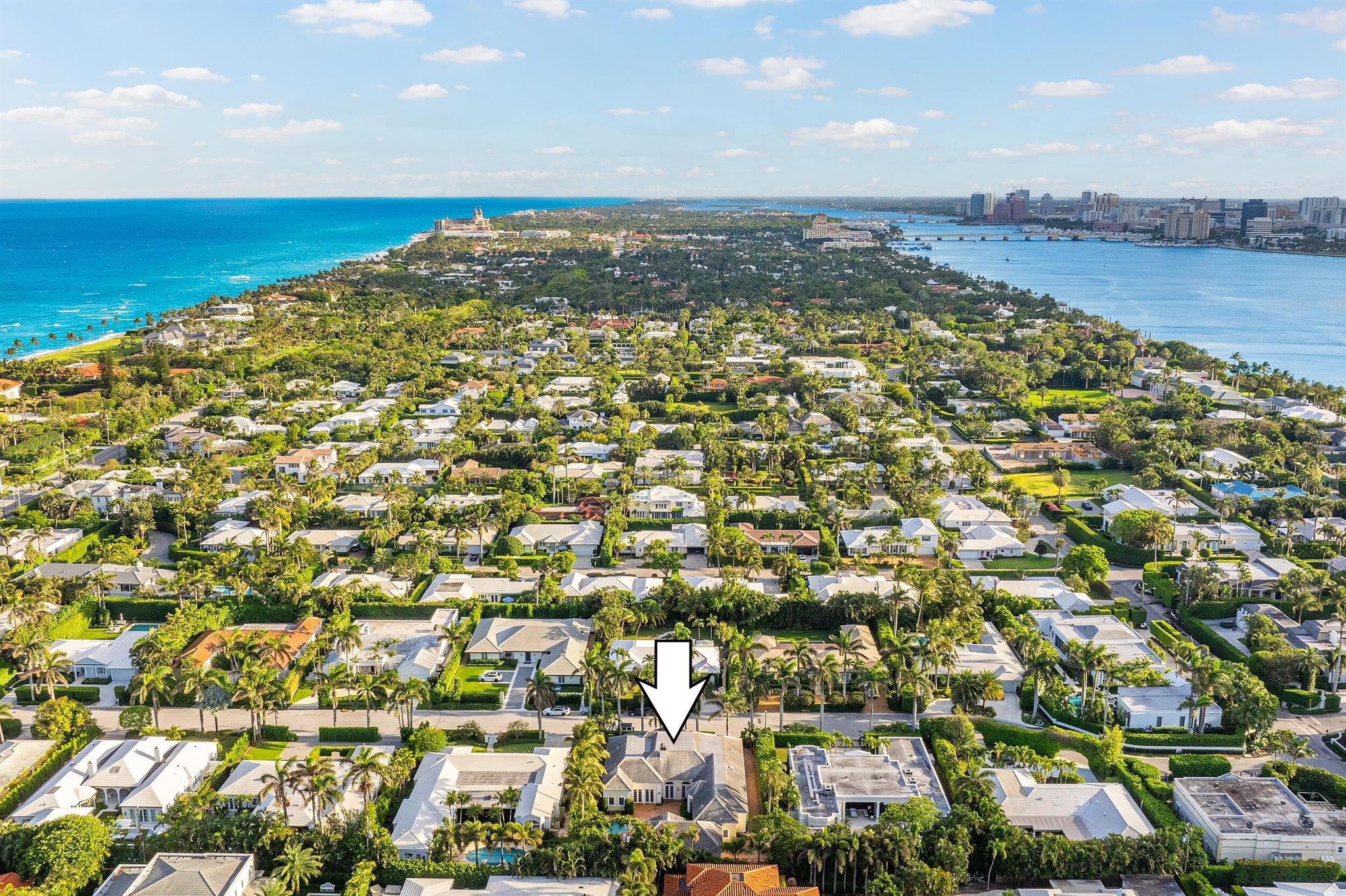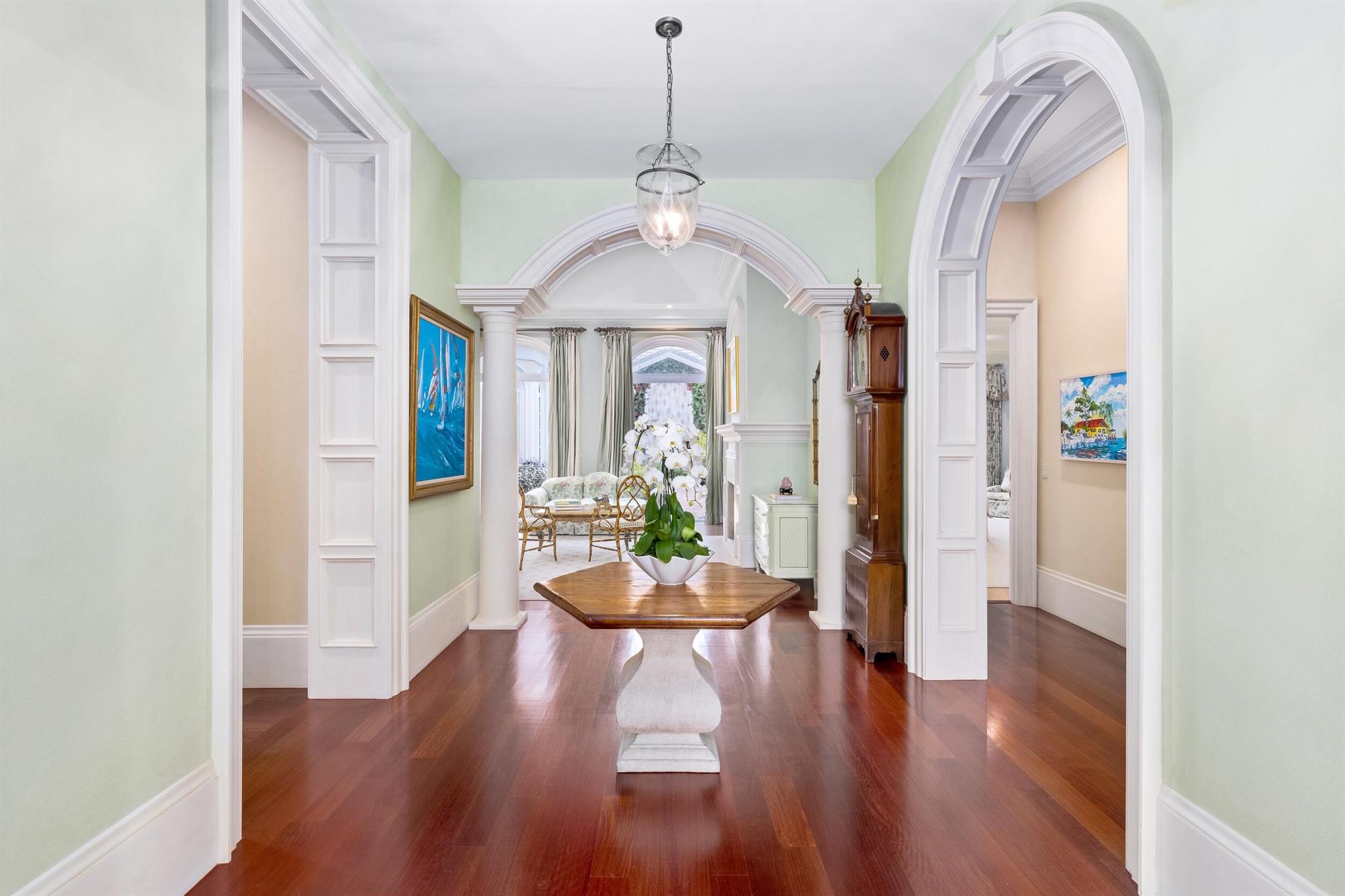 This one-story North End Palm Beach home features five bedrooms, a chef's kitchen, formal dining room, and elegant living areas with high ceilings and hardwood floors throughout. The primary wing includes a spacious luxury bathroom, walk-in closets, and an office/bedroom with its own ensuite bathroom. The family and living rooms and kitchen overlook the lush backyard and pool. A cabana/bedroom with an ensuite bath is located next to the pool behind the 2-car garage, providing privacy for guests to enjoy the backyard in peace.