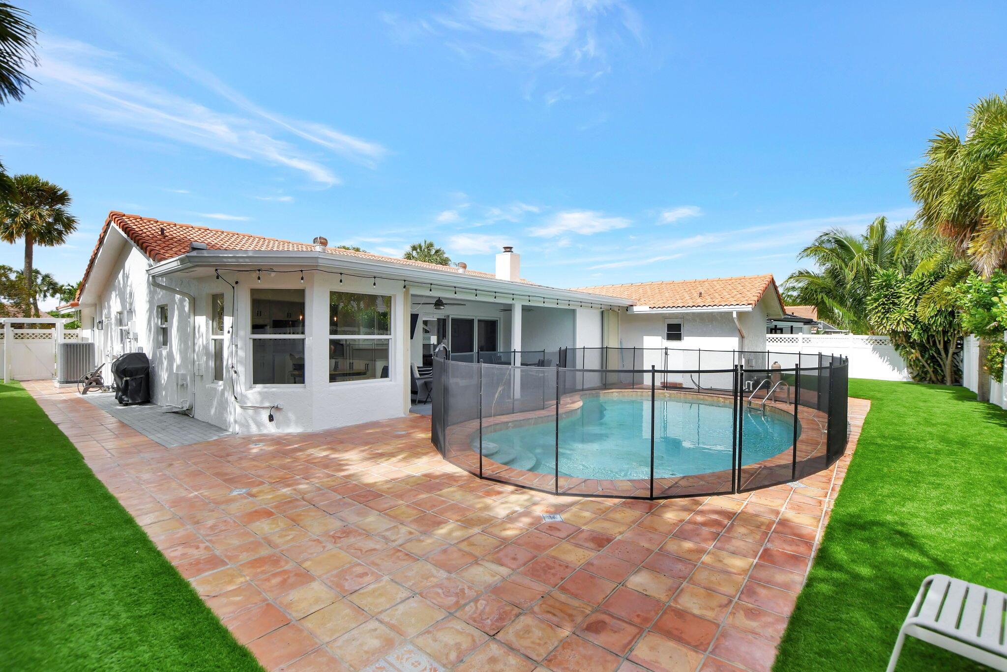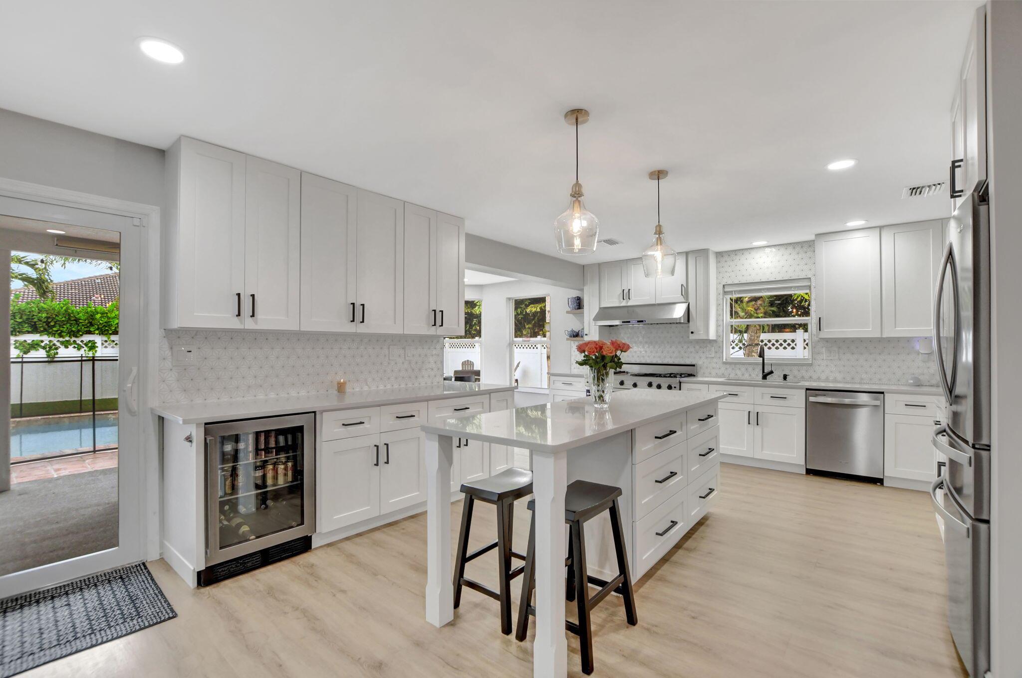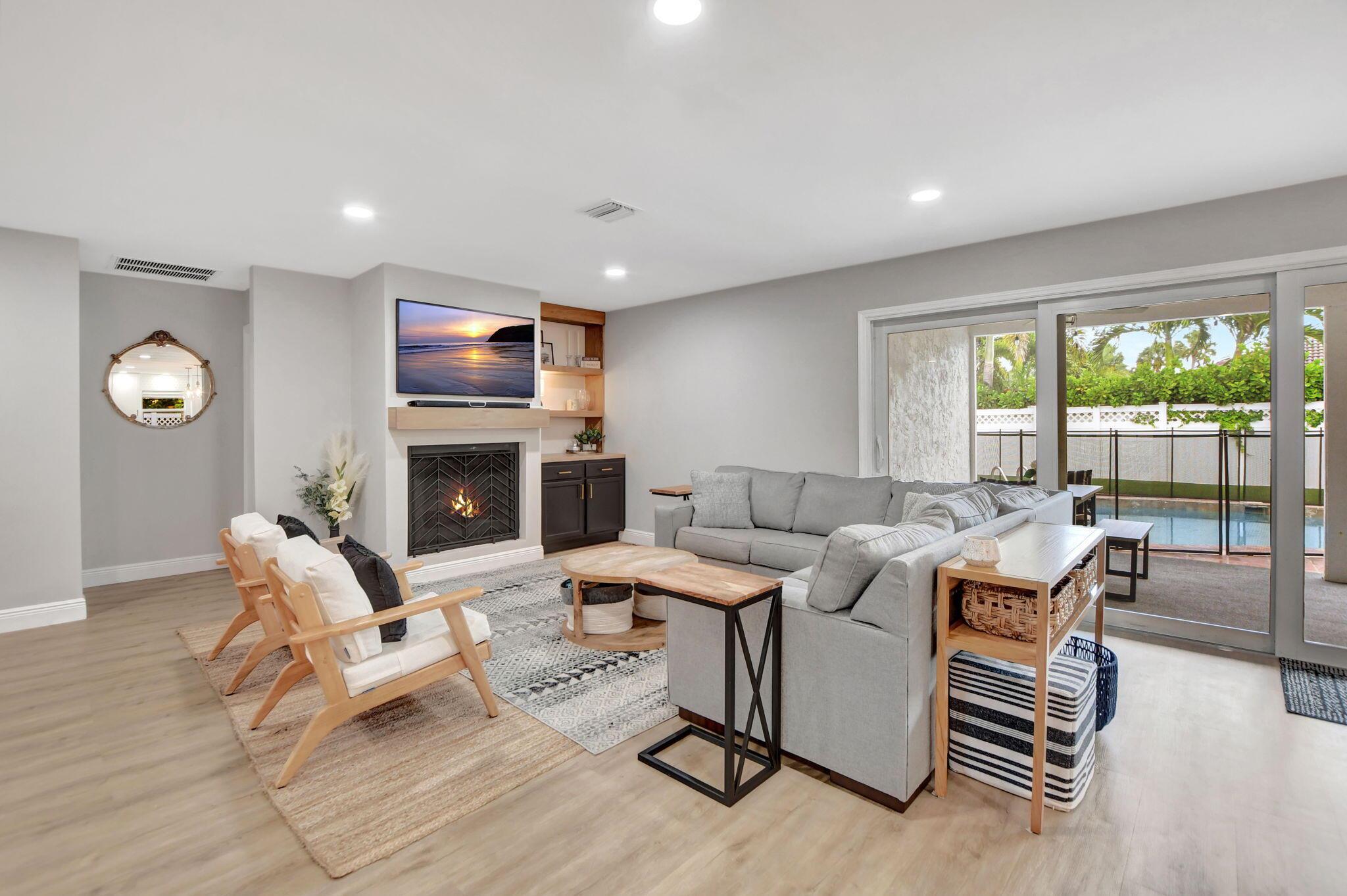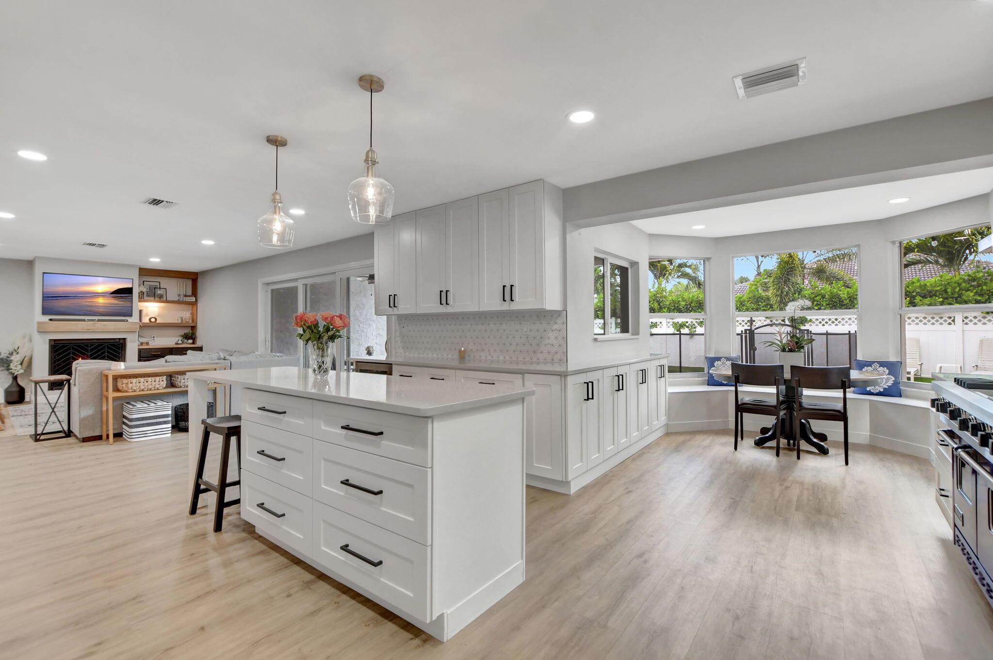 Stunningly renovated 4-bedroom, 2-bathroom plus den home with in the highly coveted community of Camino Lakes in East Boca Raton. This home features a completely updated interior with an open floor concept, immaculate finishes, and all impact windows. The new flooring throughout complements the spacious layout. The kitchen is a highlight, boasting a large island, plenty of cabinets, and bench seating around the bay window overlooking the pool and backyard. The master suite includes two large closets, making it easy to move right in. Outside, the fenced backyard is beautifully landscaped with artificial turf, and the fencing is made of white vinyl. Enjoy the luxury of a Viking gas range and a wood-burning fireplace. Additional storage space is available in the laundry room. See MORE