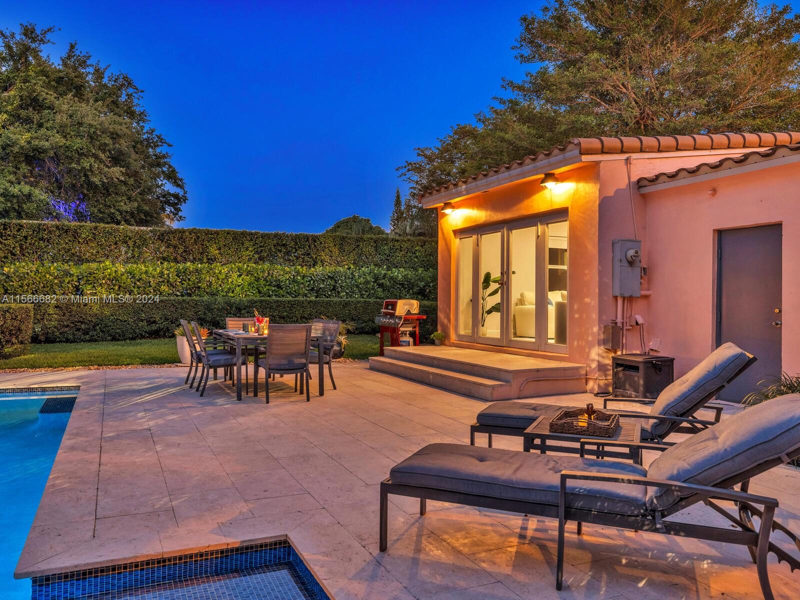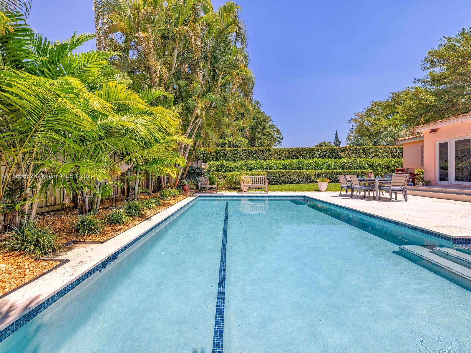 Welcome to Shores Casa Rosa! Discover peace and serenity in this nicely updated Miami Shores pool home. Enter into the light and bright, sun-drenched great open-flow plan with large formal living, dining, updated kitchen, and spacious media room opening to the spectacular tropical gardens, including a fabulous sparkling heated pool, large entertainment patio, and lush privacy landscaping throughout— your own private oasis! Unwind in the lovely main ensuite retreat with updated bath, plus a guest wing with updated bath and two spacious guest rooms. All situated on a corner lot with a side alley garage entry (spacious one-car garage), newer roof and AC, plus impact windows and doors, all in a non-flood zone, just a few blocks to Downtown Miami Shores shops and restaurants. Welcome home!