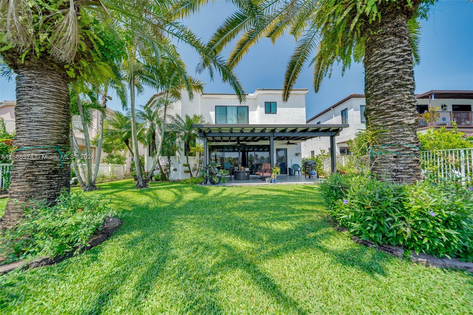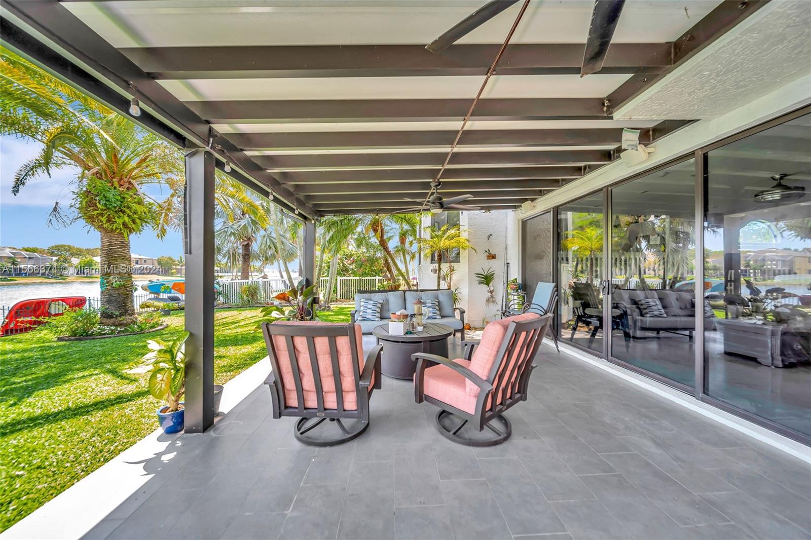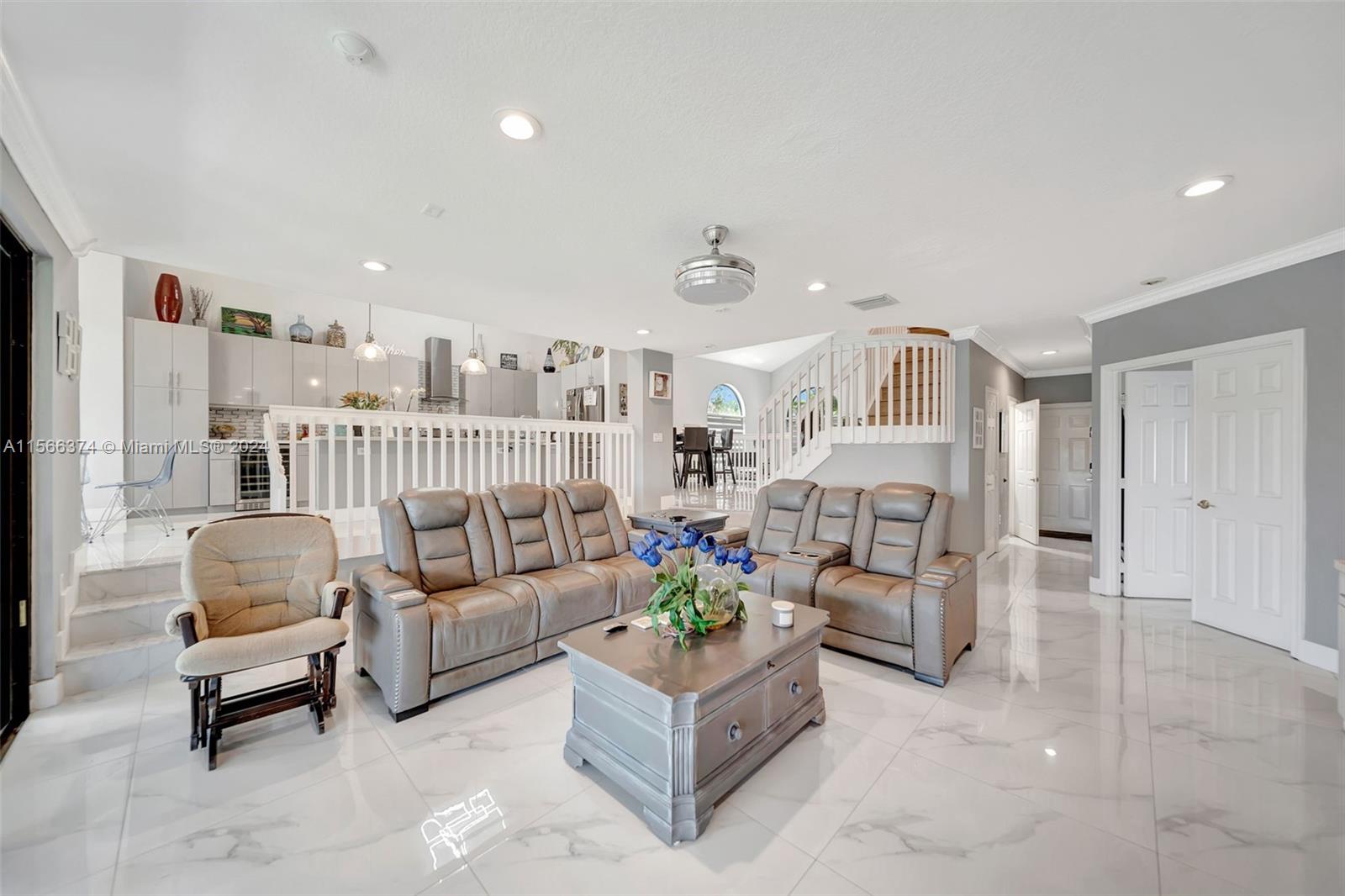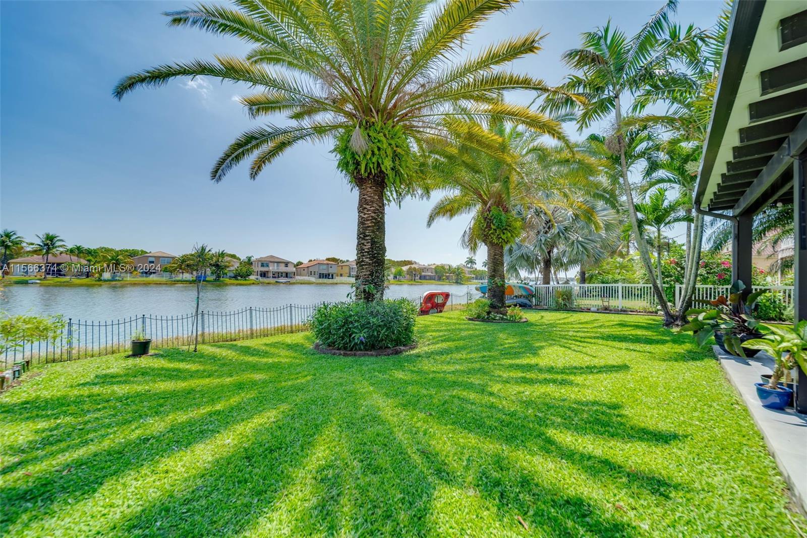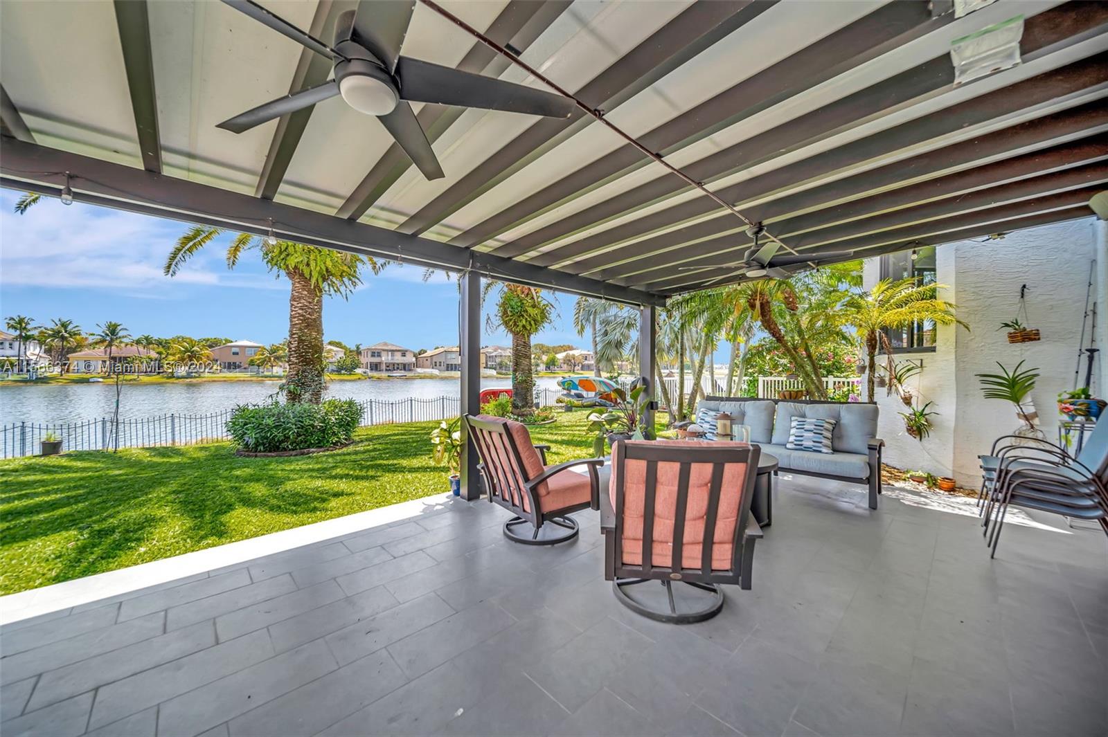 Gorgeous two story, lakefront home in Capri section of Riviera Isles Cambria Model. Very open and bright! Large, remodeled kitchen and new Porcelain tile flooring downstairs with vaulted ceilings. New Impact Windows and Doors thru-out. Original Roof. One Full bedroom & totally remodeled full bath downstairs. Formal dining room, living room and large family room are Perfect for family gatherings. Primary BR upstairs with separate sitting area. Could be office/den. New Covered Gazebo & patio in the waterfront backyard. Serene Tropical Setting. Additional upgrades include New Solar Water Heater, New Water Filter/Softener, Attic insulation & solar attic fan keep the house nice & cool. Separate Laundry Room in house. Riviera Isles has a 24/7 manned guard gate & amazing community pool.