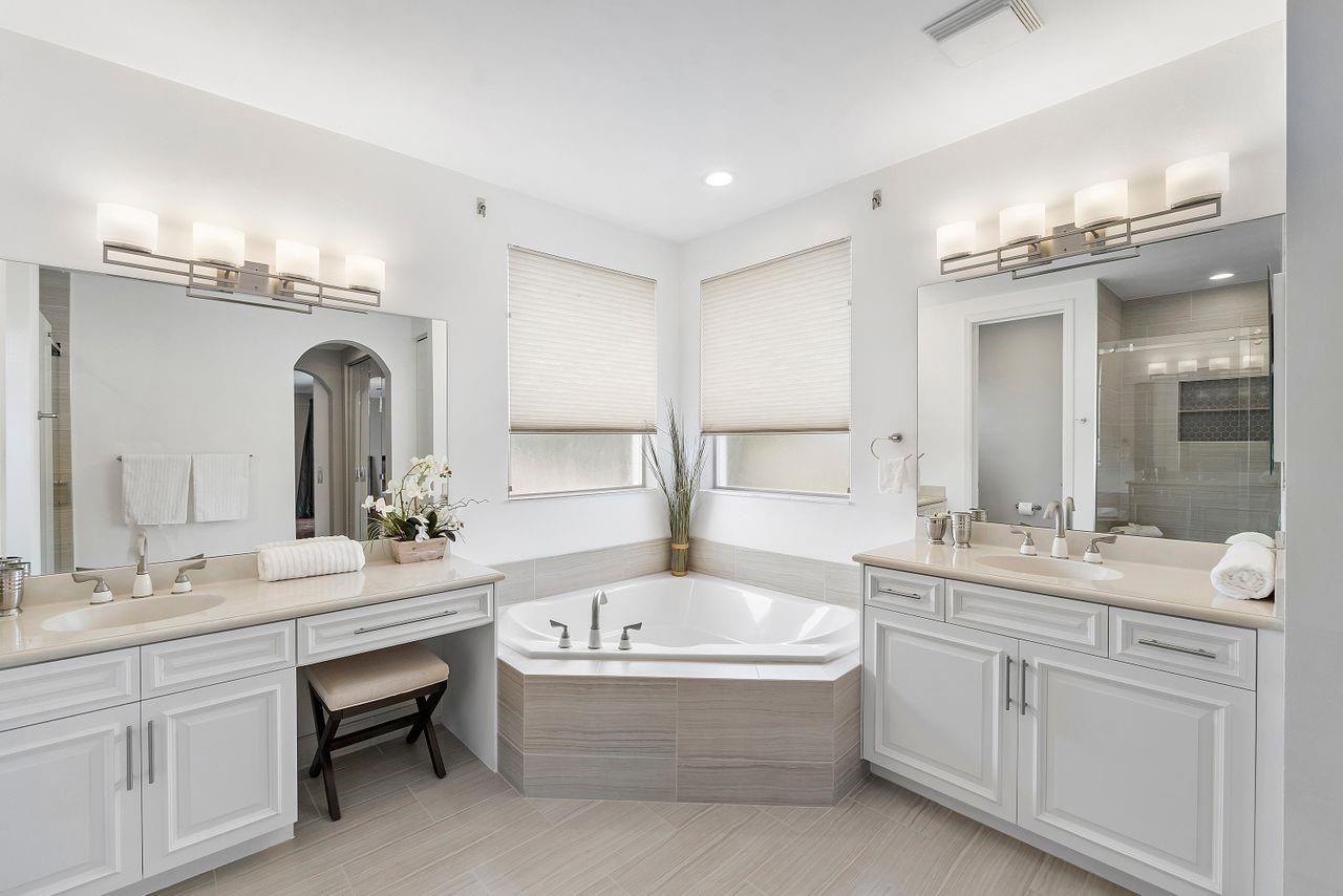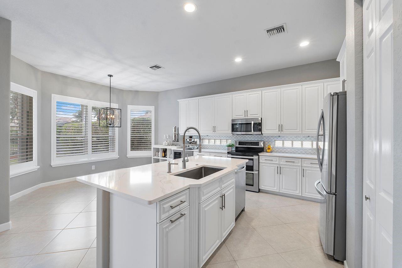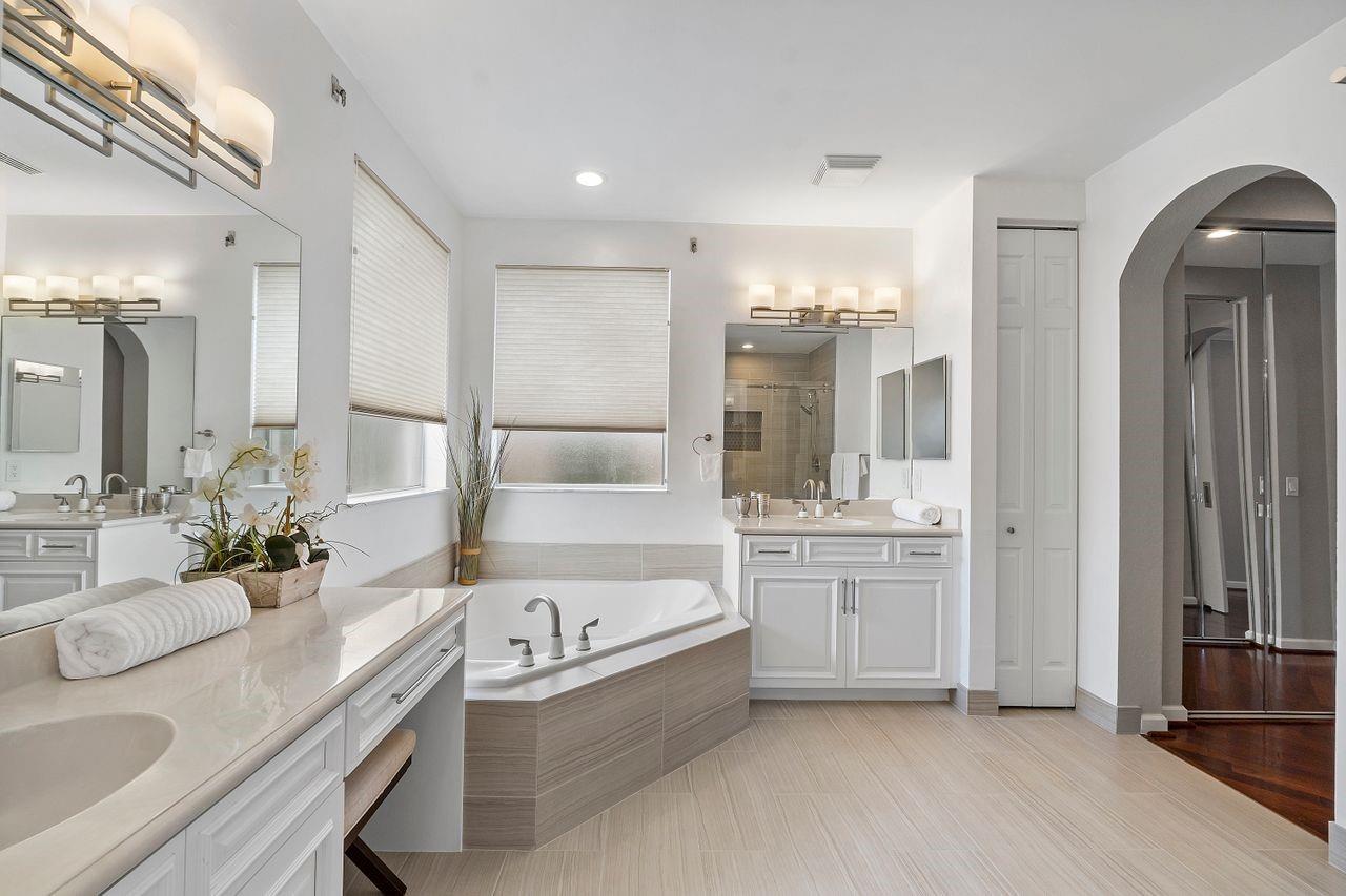 Heron Bay - Updated 2 story home in Bay Cove featuring over 3,000 sq. ft. & spectacular water views. 4 beds, 3 baths (1 bed & bath down), volume ceilings, crown molding, real wood flooring in main area & bedrms, marble flooring up, surround sound & accord. shutters & 2 zone TRANE A/C (2018). Gourmet kitchen w/ quartz counters, SS appliances, wine cooler, Plantation Shutters & stunning water views. 3 beds up inc. built-in office/murphy bed & a spacious primary suite offering dual custom closets, open balcony w/ water views & spa bath. Fully fenced yard w/ expanded travertine patio, tranquil water views & plenty of rm for a pool. Custom garage cabinetry, epoxy floors & more! Resort amenities inc. 2 pools, tennis/pickleball, playground, fitness ctr., basketball, cafe, guard gated & A schools.