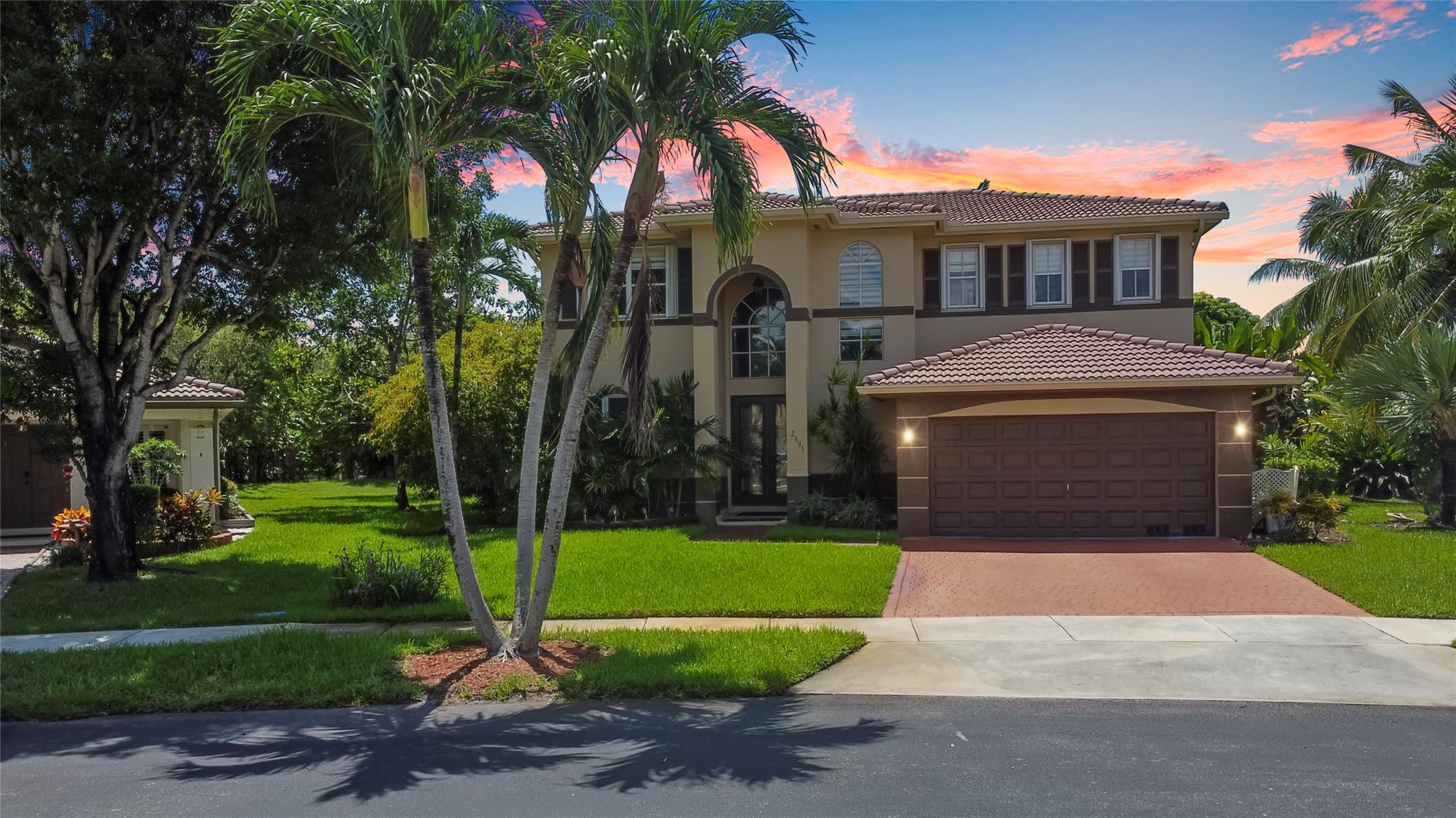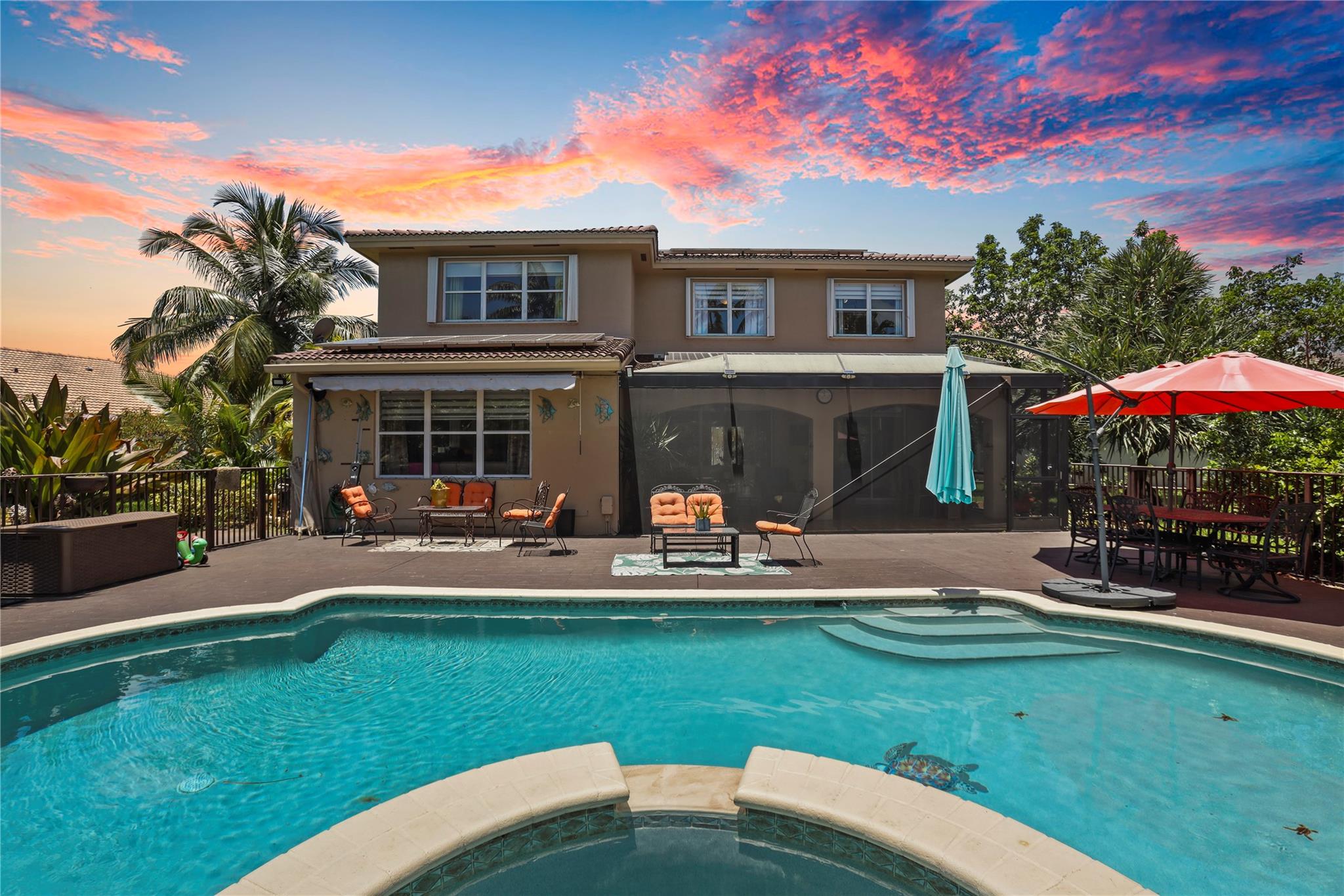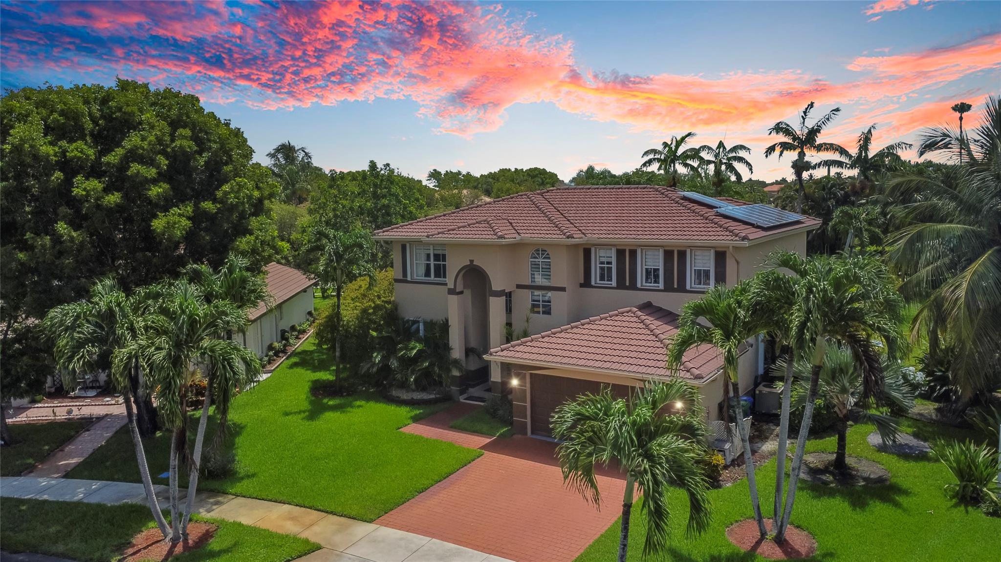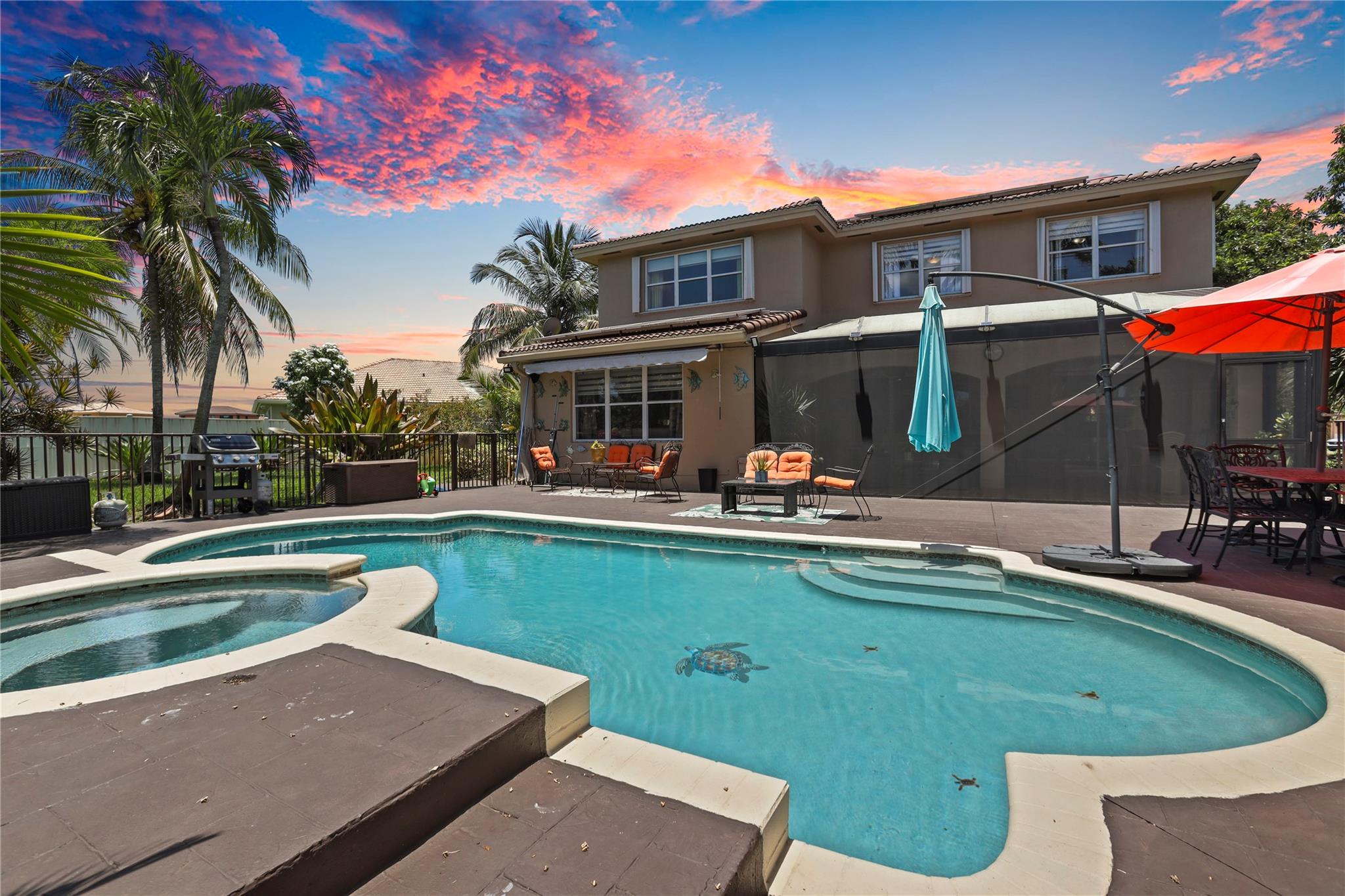 Price to sell!!! Sought-after Monarch Lakes/ Tequesta Cove gated community, this two-story gem boasts 4 beds plus a den (easily convertible to a 5th bedroom) Plus 3 full bathrooms and 1/2 Bath for guest. Situated on an expansive lot with a heated pool and jacuzzi, as well as a screened covered patio ideal for entertaining, beautifully landscaped tropical oasis complete with palm, coconut, mango and avocado trees. Featuring two master bedrooms, one conveniently located downstairs with its own private entrance and bath, this home offers luxurious touches like Zebra blinds, an alarm system, Recently renovated, the home boasts a chef's dream kitchen with double oven and gas stove, plus enjoy significant energy savings with 31 solar panels and a tankless hot water heater.