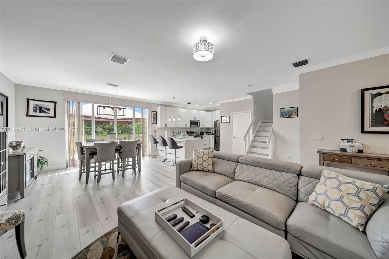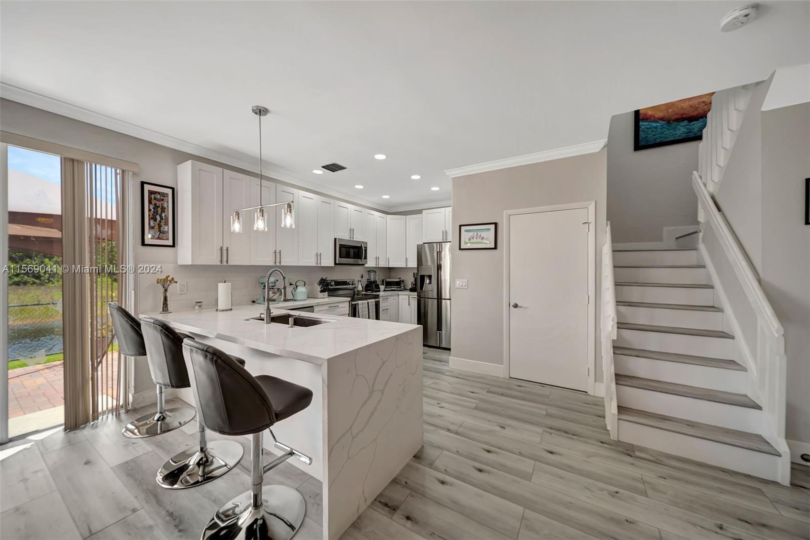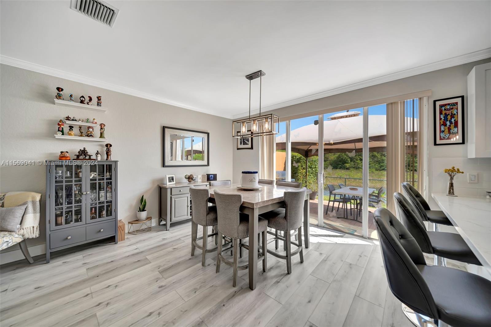 Welcome to this stunning home which features an open floor plan with a modern kitchen, sleek appliances, custom cabinetry, marble countertops and breakfast bar. The Living Room and Dining area boasts plenty of natural light which makes this an inviting space for relaxation and gatherings. This home exudes elegance and charm with every detail: crown molding, baseboards, wood laminate flooring, modern light fixtures. Relax on your patio and enjoy the serene surroundings and waterfront views. Park Crossing installed new roofs in 2023. Towngate offers many recreational options with community pools, tot lots & picnic areas. The city park has tennis courts, basketball courts, a soccer field, a baseball field, and pool. Silver Palms Elementary school is conveniently located within the community.