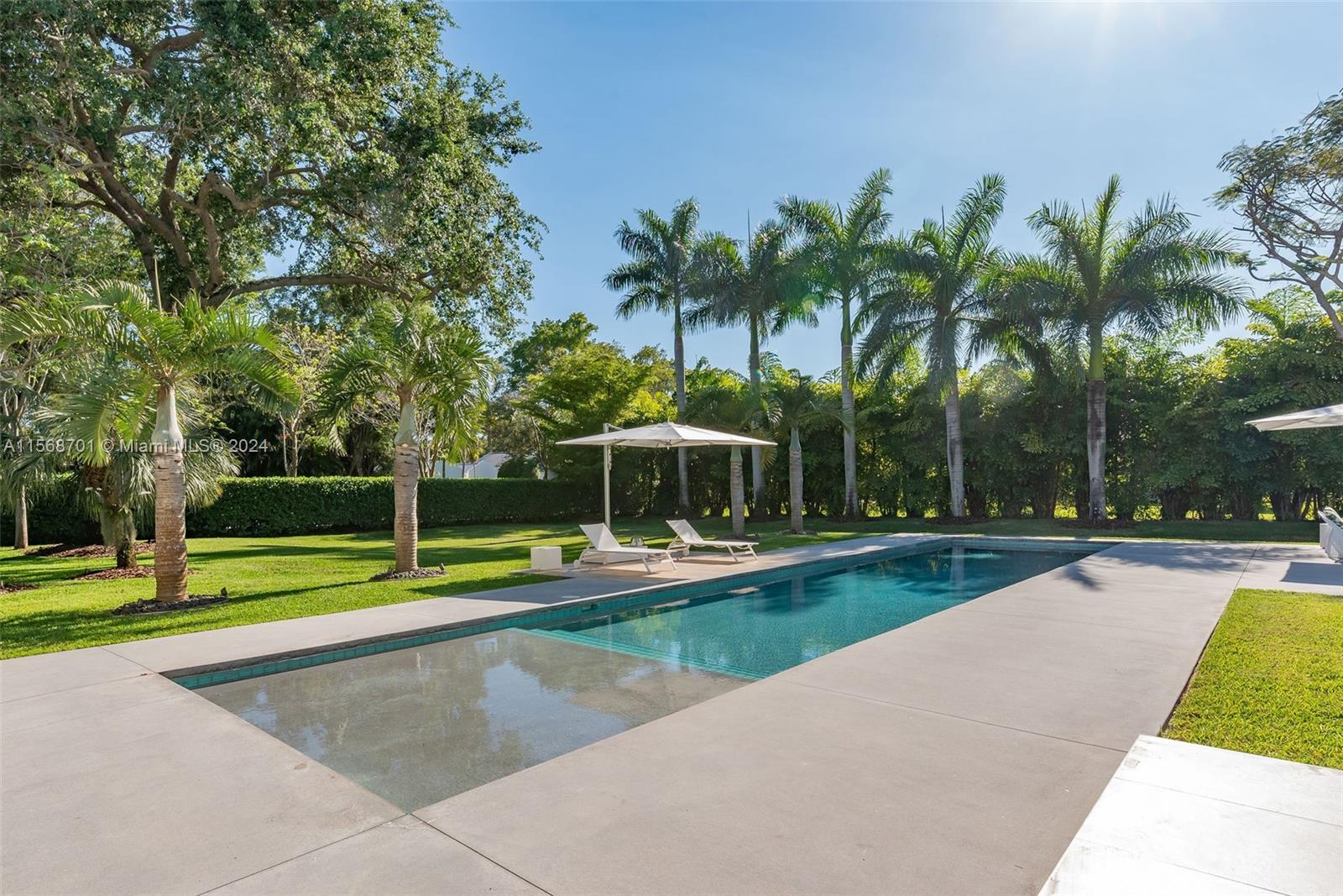 A contemporary masterpiece in the sought-after neighborhood of Pinecrest. This Bauhaus style property features glass walls that bring in natural light and offer breathtaking views of the pool, guest house, and beautiful landscape. This gem also has 6 bedrooms, 6 bathrooms, a full-sized guest house, oversized garage and a fully equipped outdoor kitchen. The living areas and German Leicht-designed kitchen are ideal for hosting. Surrounded by large trees and meticulously landscaped gardens, this private oasis offers a picturesque environment. The large covered terrace, expansive deck, and pool create a seamless indoor/outdoor experience for the perfect retreat. Square footage: Liv 5,745 (including guest house), Adj 6,327, Total 7,601.