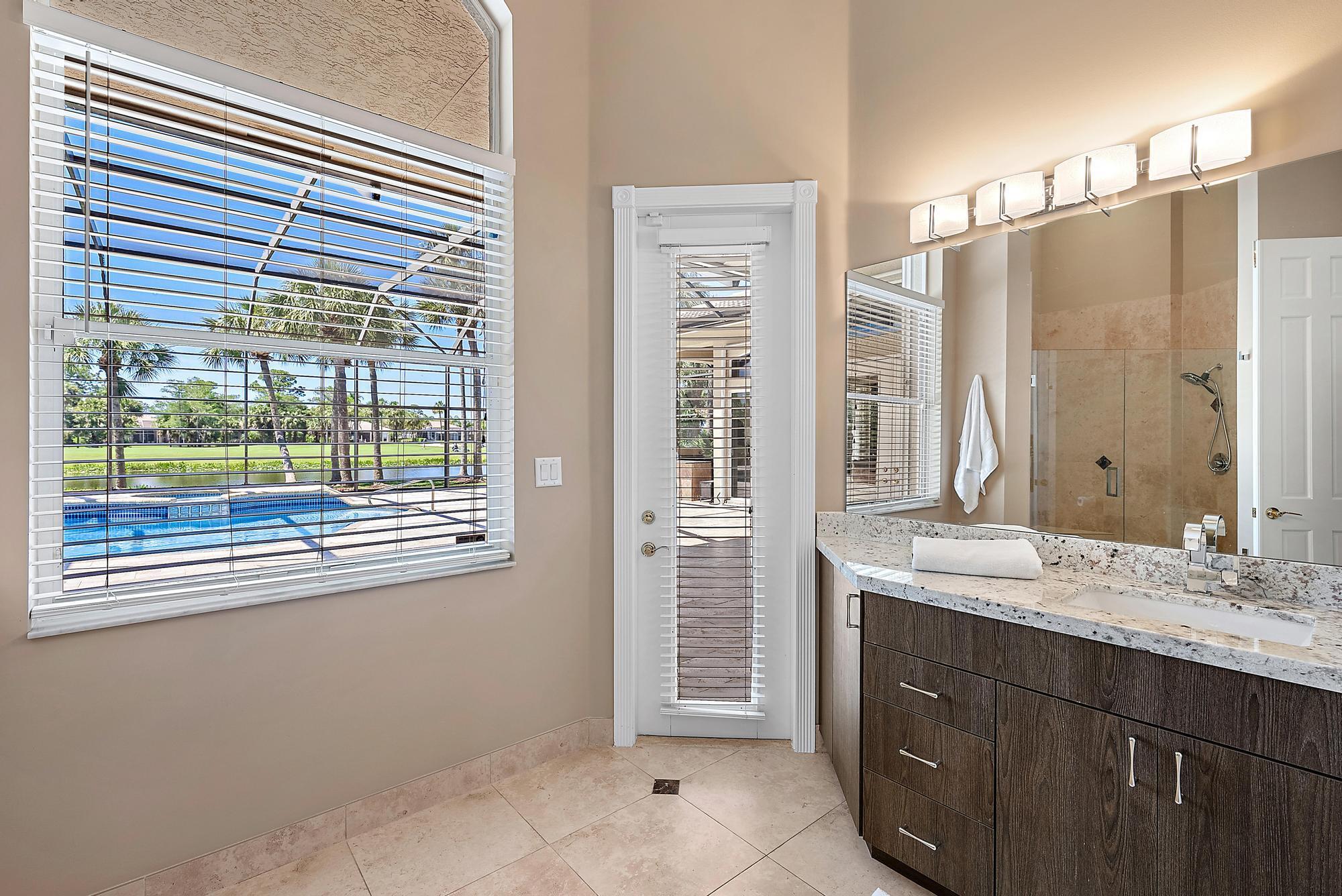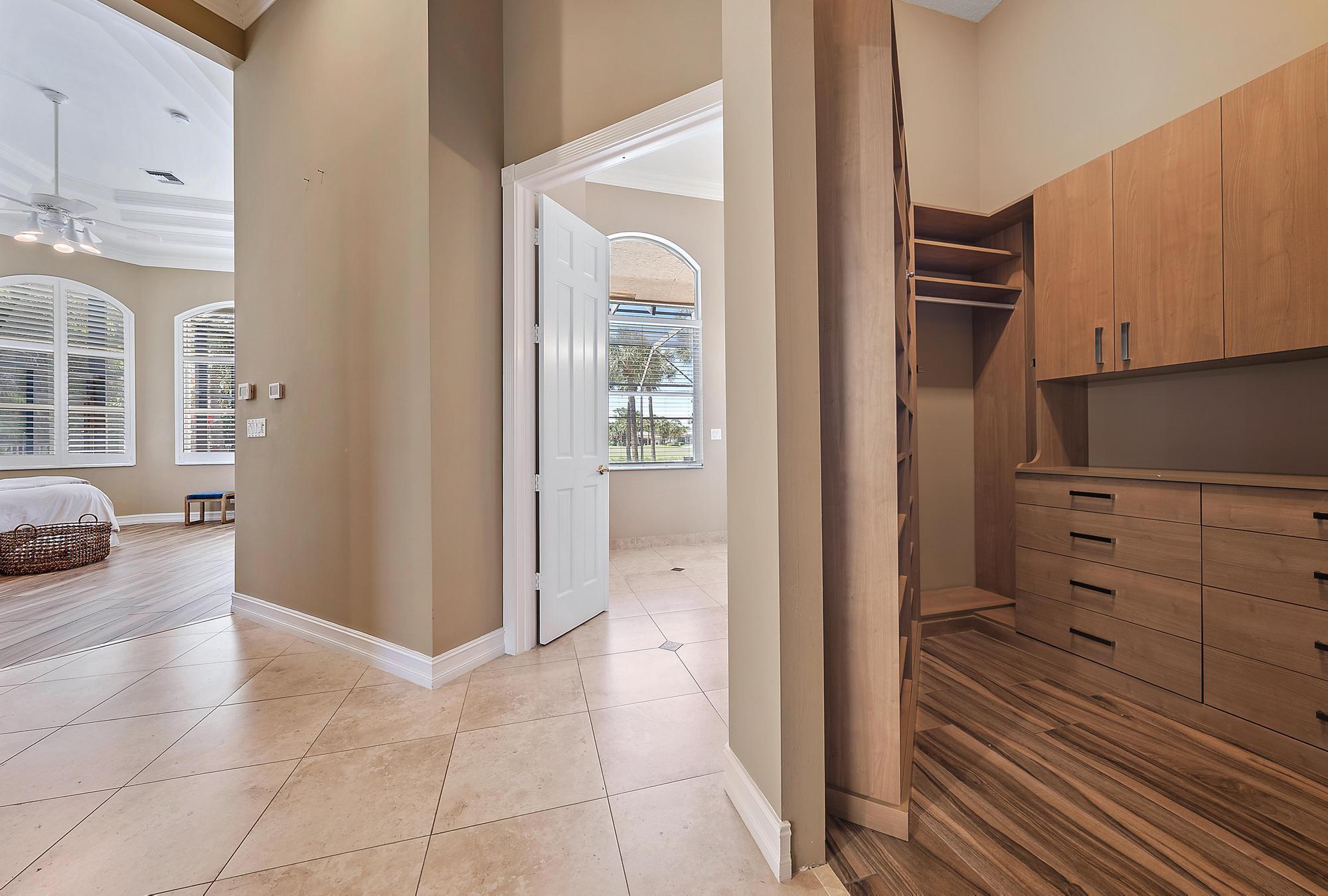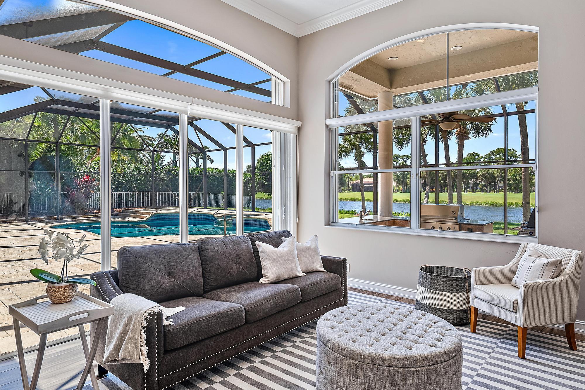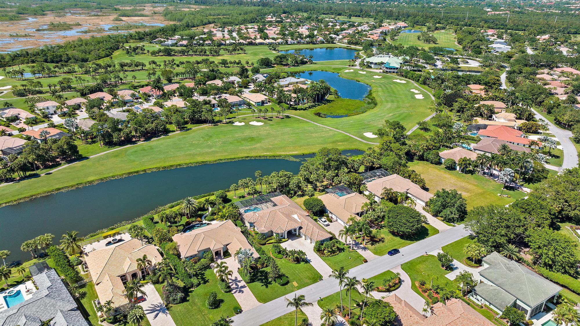 Looking for immediate (but not mandatory) golf membership and an HOA fee of only $300/month? Don't miss this opportunity! This meticulously maintained 4-bedroom home sits on nearly a half acre of lushly landscaped property overlooking the 18th fairway of the newly renovated Arthur Hills golf course. 12' ceilings and an open floor plan offer plenty of natural light and beautiful sunset views. Custom kitchen features a large center island, wall oven, wine fridge, spice drawers, lazy susan, and pantry/cabinet pullouts. Primary suite has 2 full bathrooms and 2 large walk-in closets. On the other end of the house are 2 add'l bedrooms, each with an ensuite bath. The 4th bedroom is used as an office with built-in desk, shelving, and a Murphy bed for the convenience of your guests. Outside, you