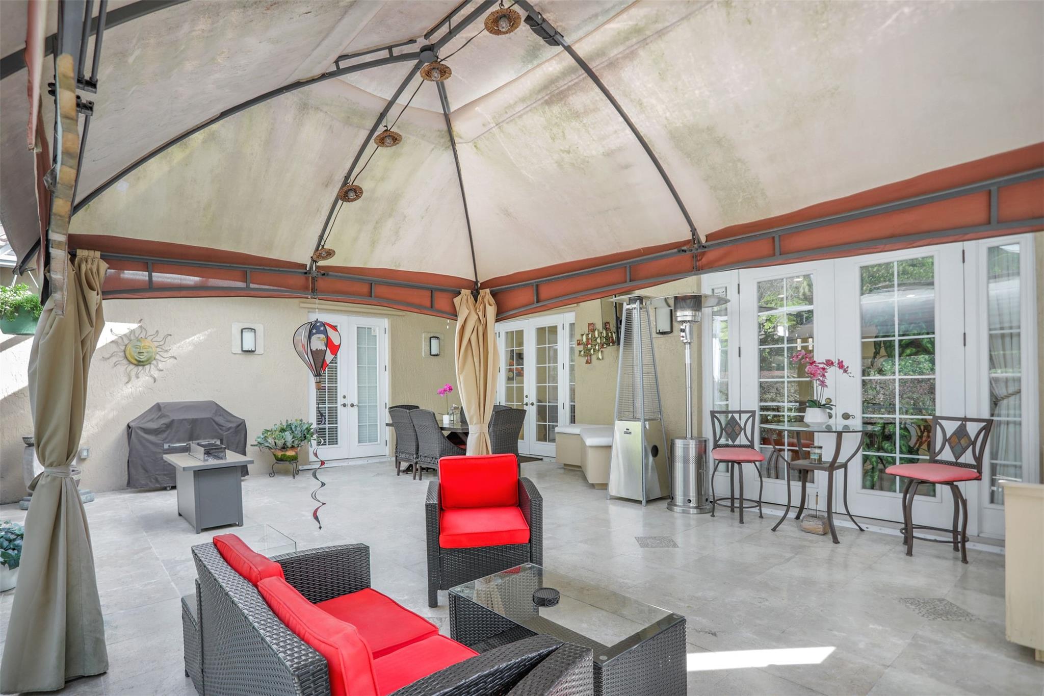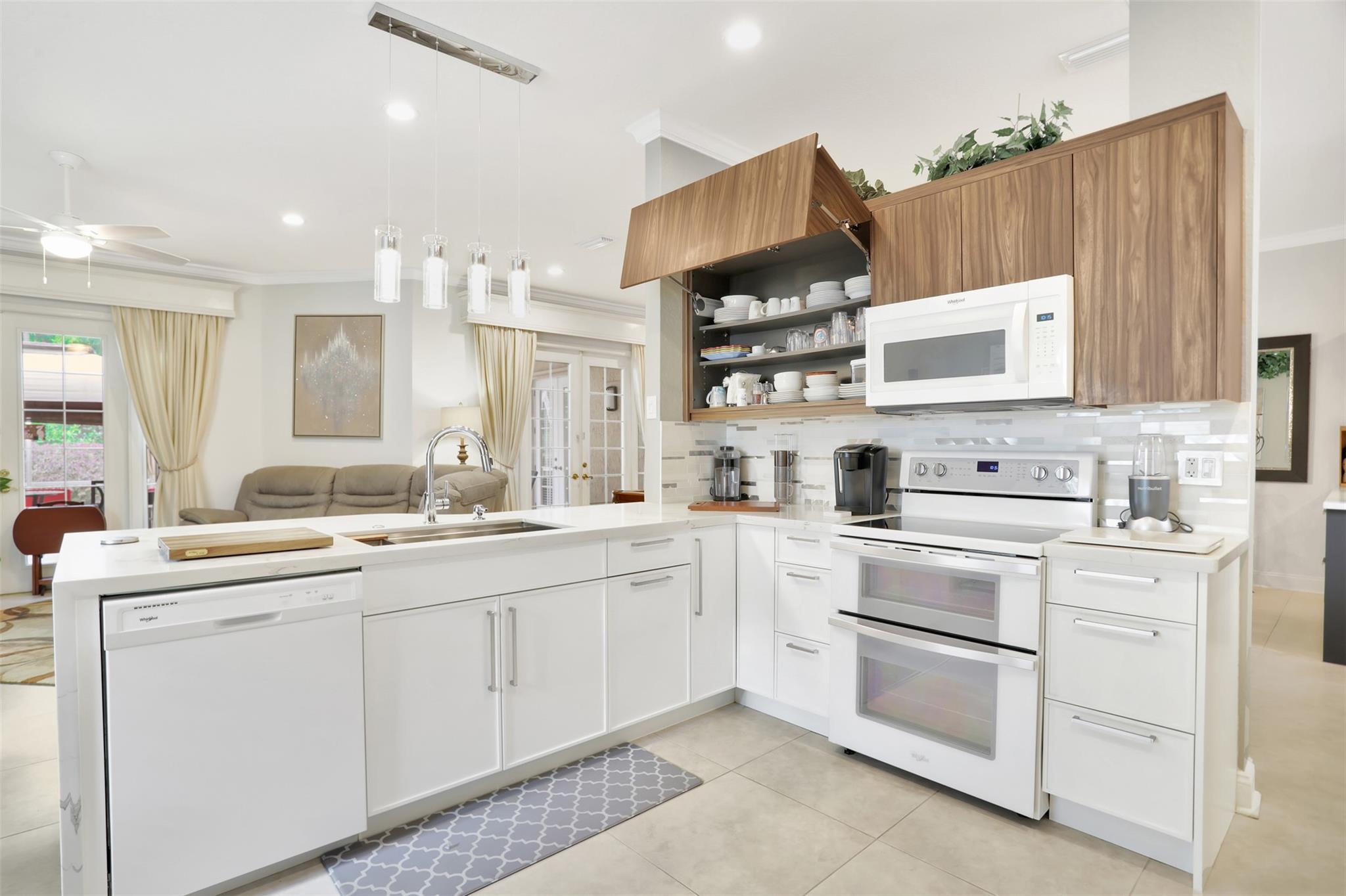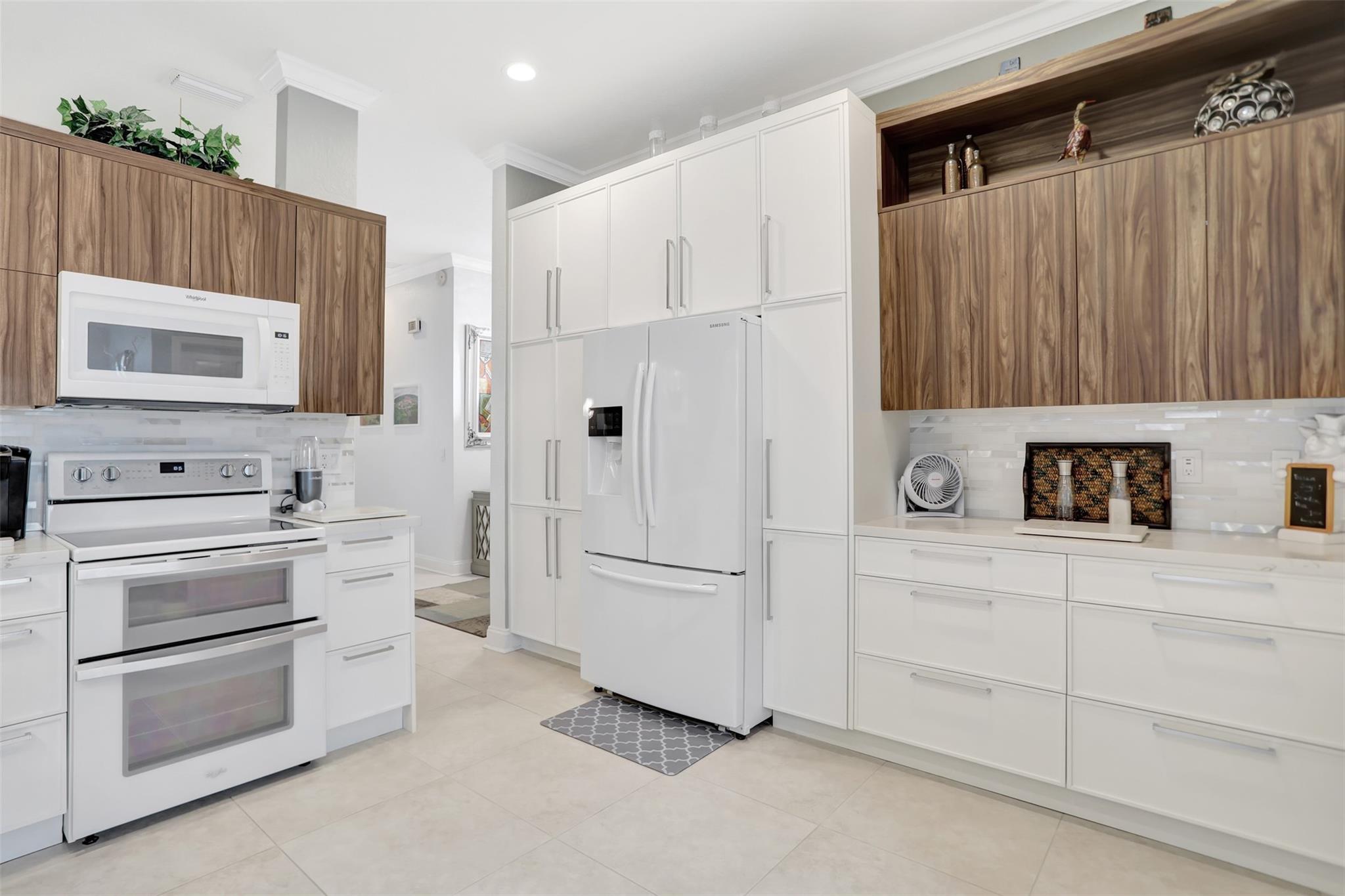 REDUCED TO SELL ! ONE OF A KIND!! Immaculate spacious 3 bedrooms, 2 bathrooms, 2 car garage house. Updated top of the line modern custom kitchen. Lots of cabinets, double pull out drawers pantry. Waterfall Quarts counter tops. Double oven. Volume ceilings. Bright open floor plan w/ lots of natural light. Freshly painted. Build-in Custom Bar. Tile & waterproof flooring. 2 Updated bathrooms. Spacious master bedroom w/ Decorative fireplace, 2 walk-in closets, large bathroom dual sink, soak-in Jacuzzi tub & shower. 2 Double French doors opens to a spacious enclosed screened porch overlooking a relaxing private preserve view. ALL IMPACT WINDOWS & FRONT DOOR. Custom cabinets in the Garage. Circular driveway. Tropical landscaping lots of Palm trees. Partially fenced back yard. MUST SEE!
