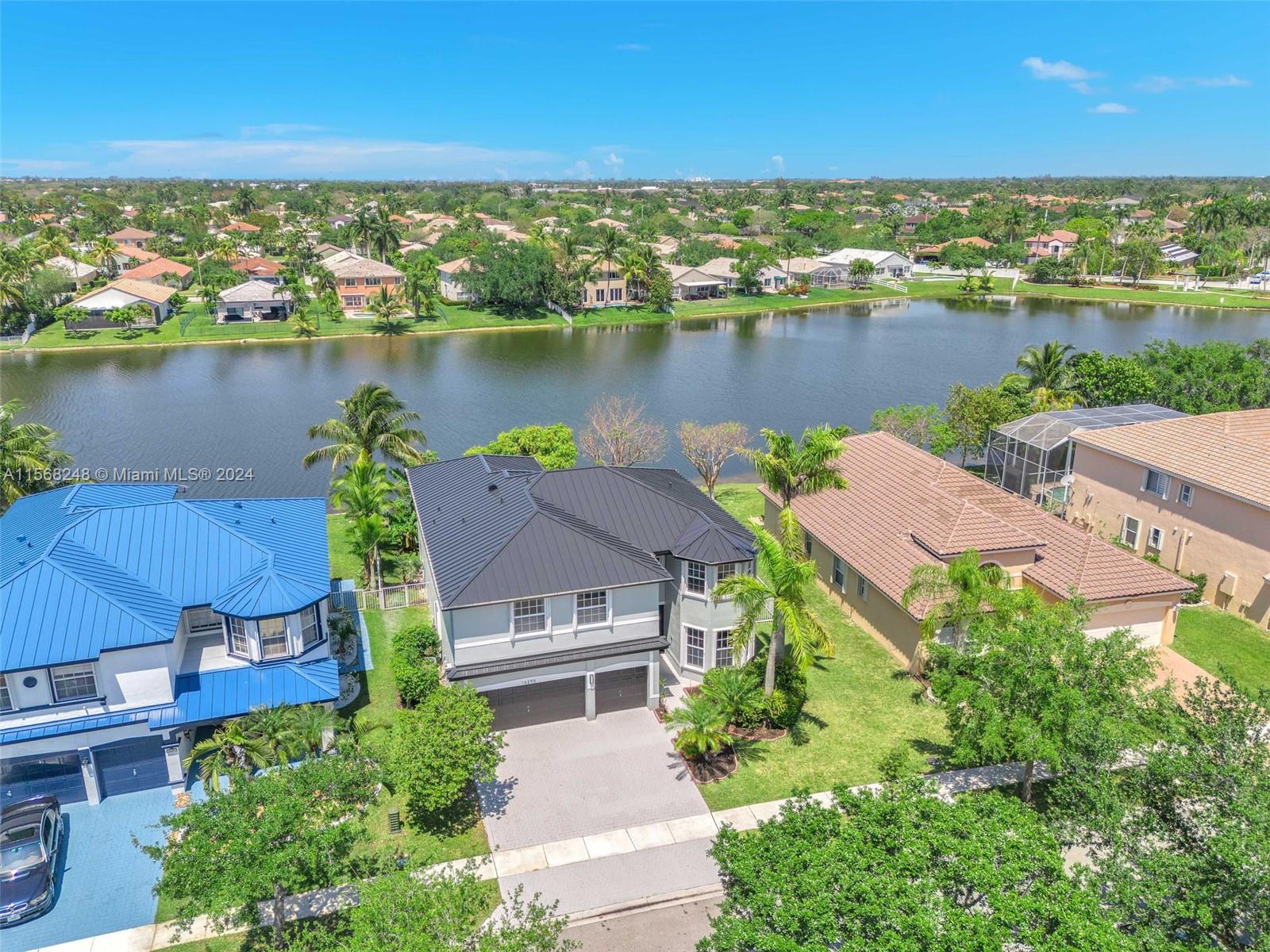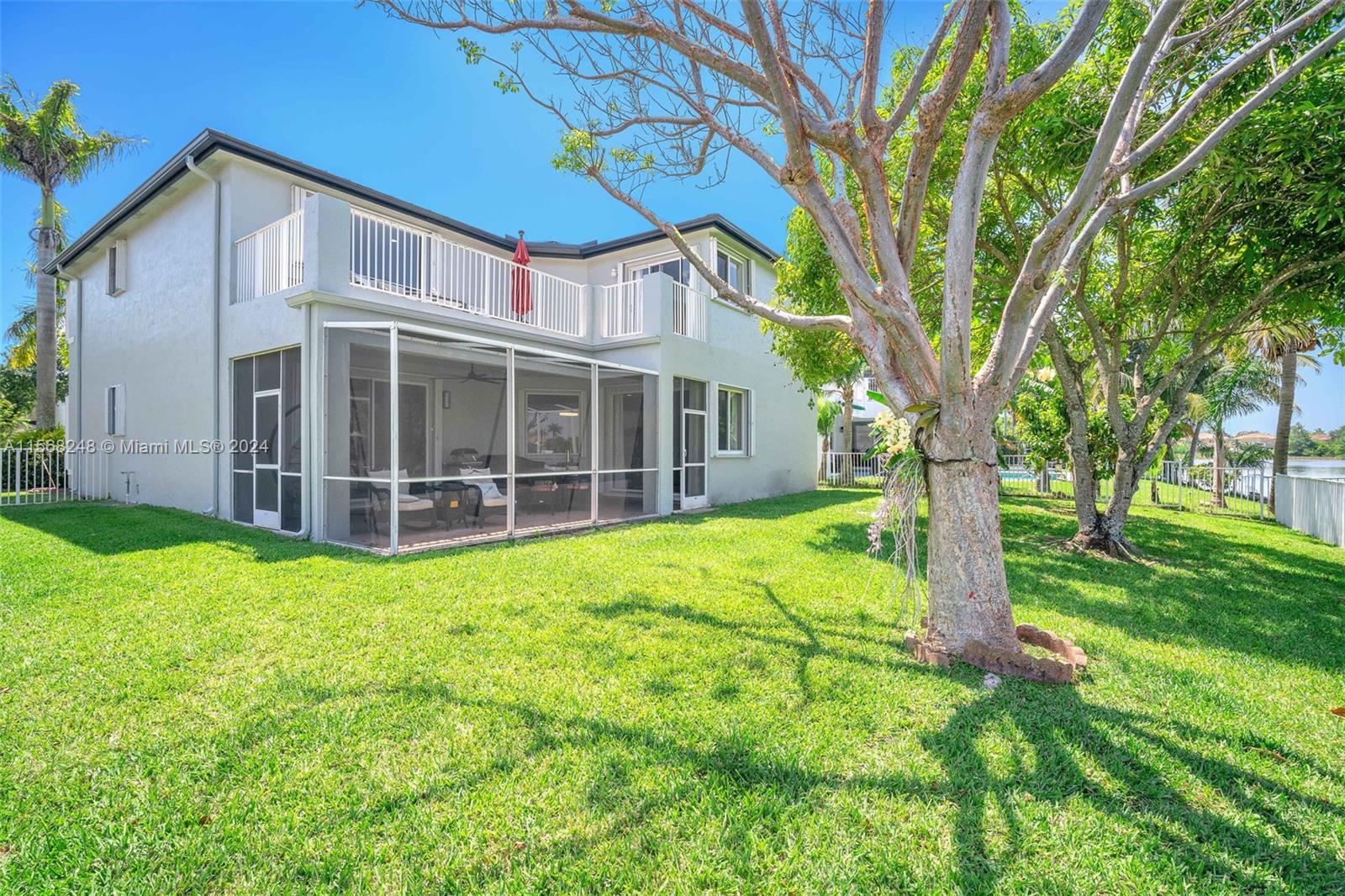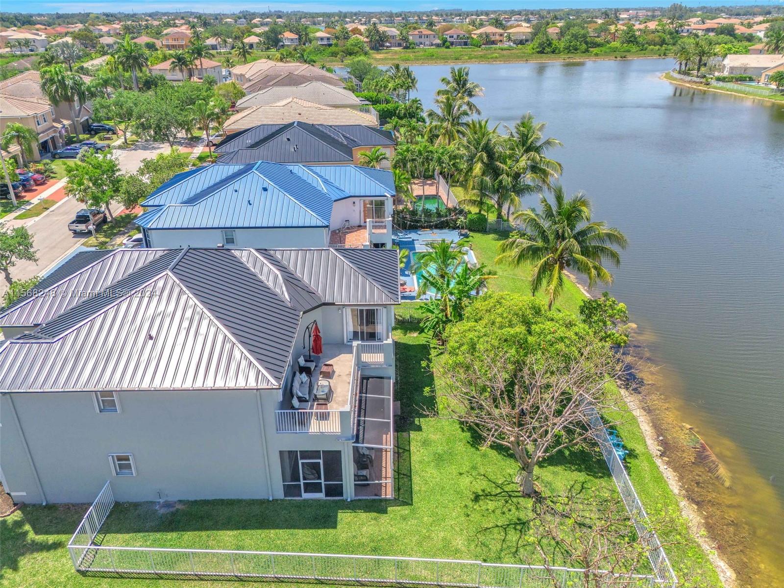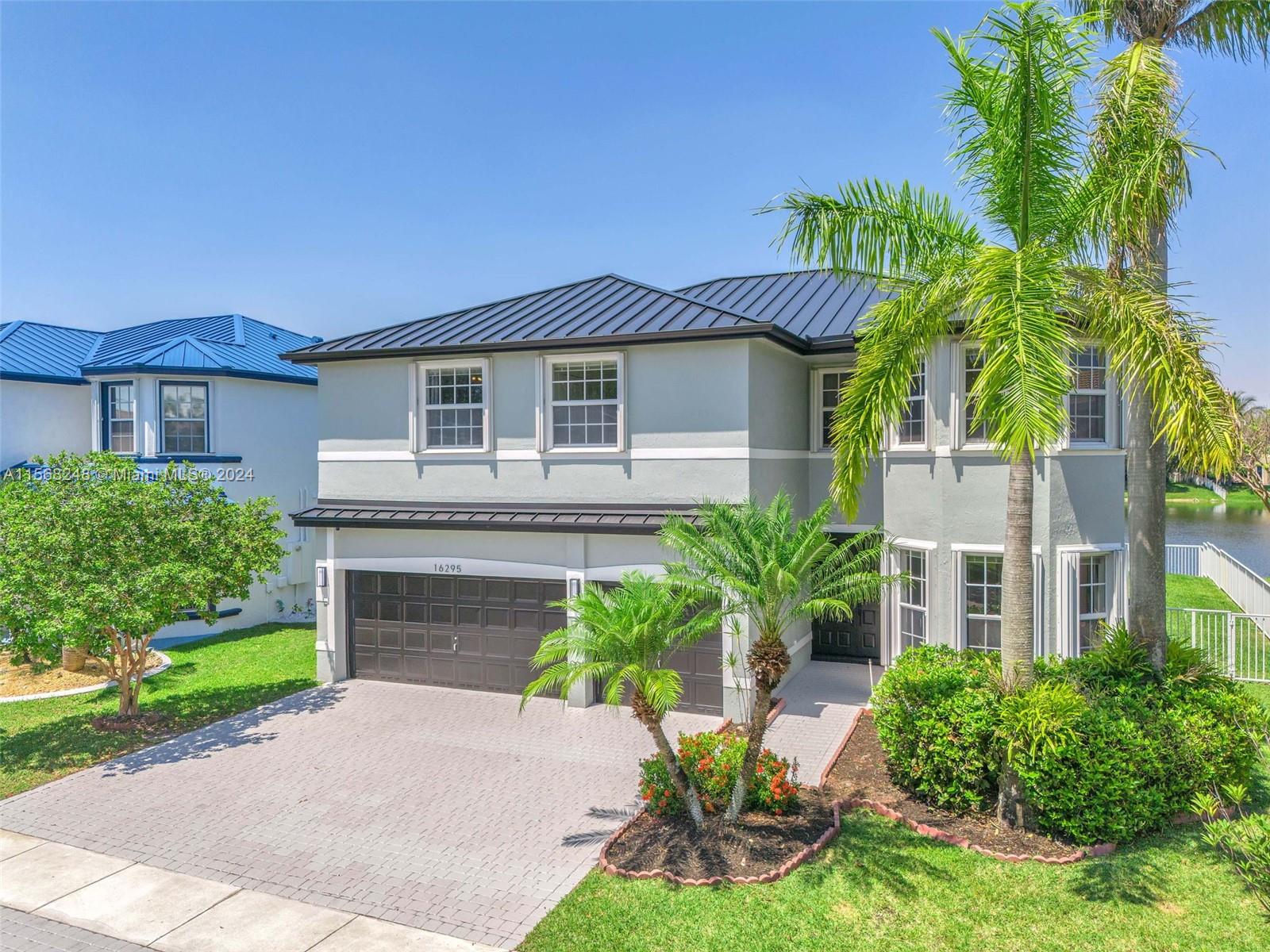 Welcome to your lakefront home. Your home has a brand-new metal roof installed in Jan of 2024! Entertain family and friends in your spacious gathering areas and impress with the soaring 19' living room ceiling. Enjoy relaxing views from the balcony off the primary bedroom and/or under the screened in patio. Snack on your own fruit with established banana, mango, and avocado trees in the oversized backyard with plenty of room for a pool. Additional features include full accordion shutters, 1-full bed/bath downstairs, oversized bedrooms, 2-zone AC units, brick paver driveway and patio, and laundry room with sink. Pembroke Shores is a private gated community located near I-75, parks, golf, restaurants, shopping, and schools.
