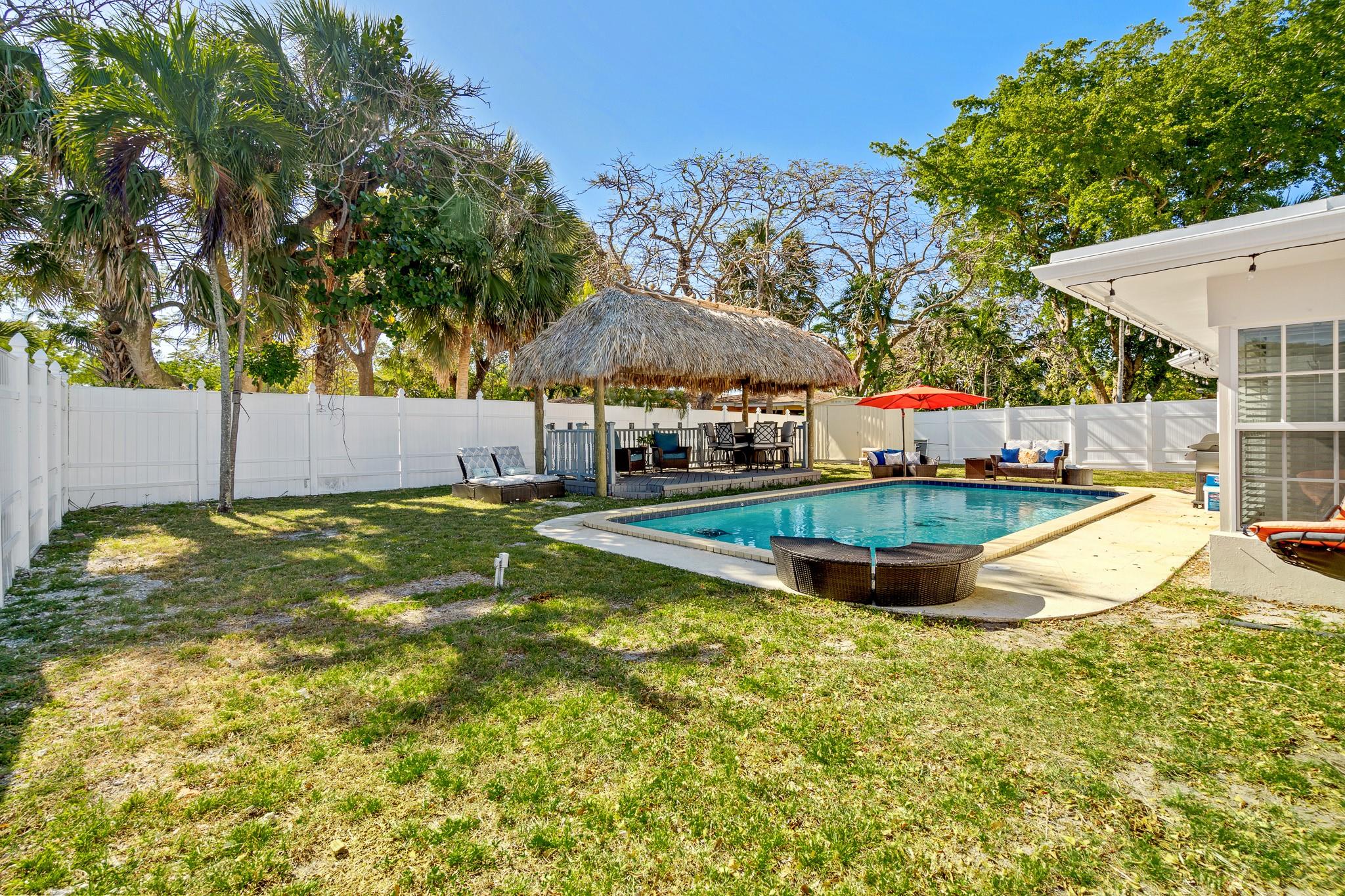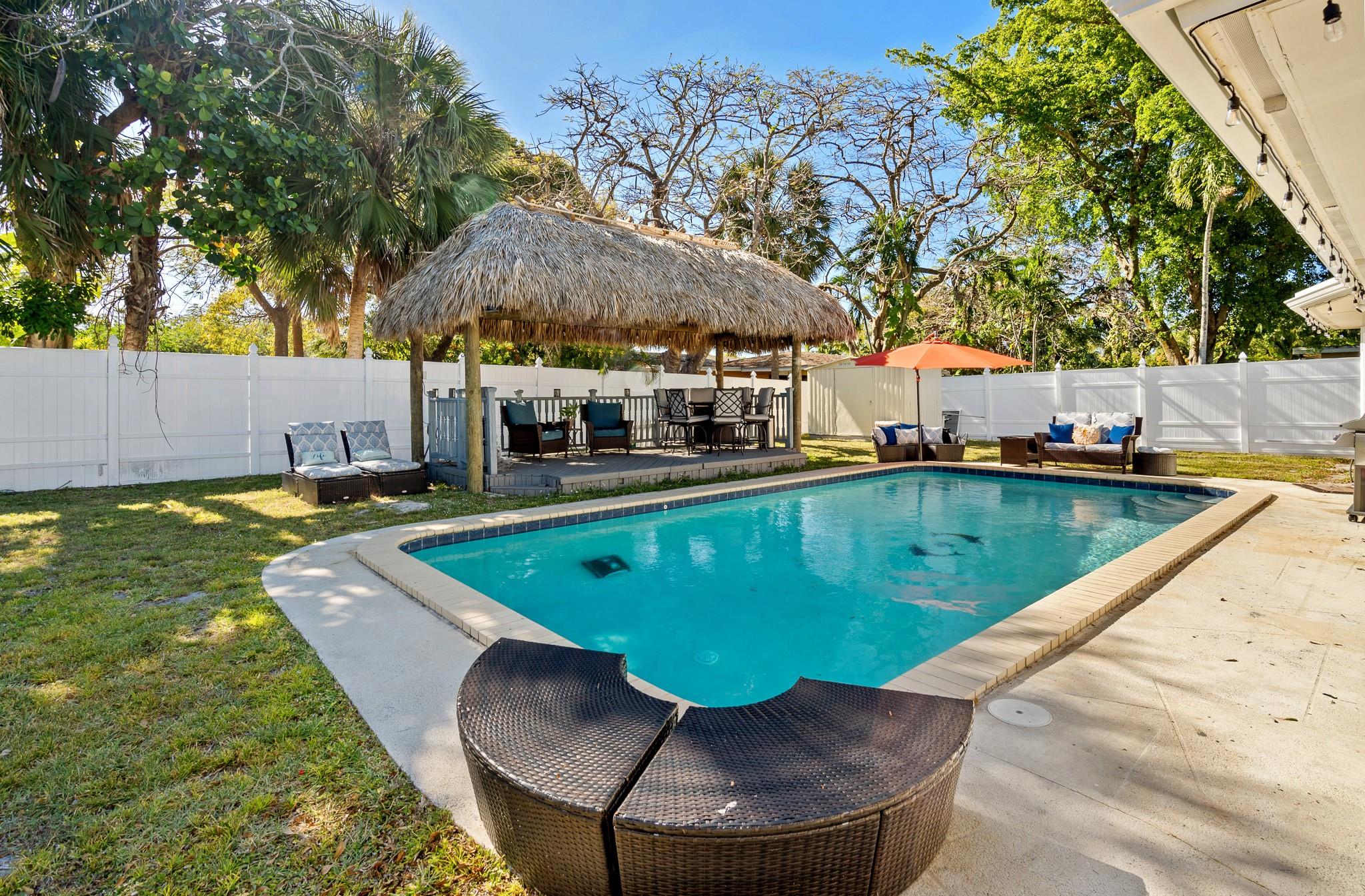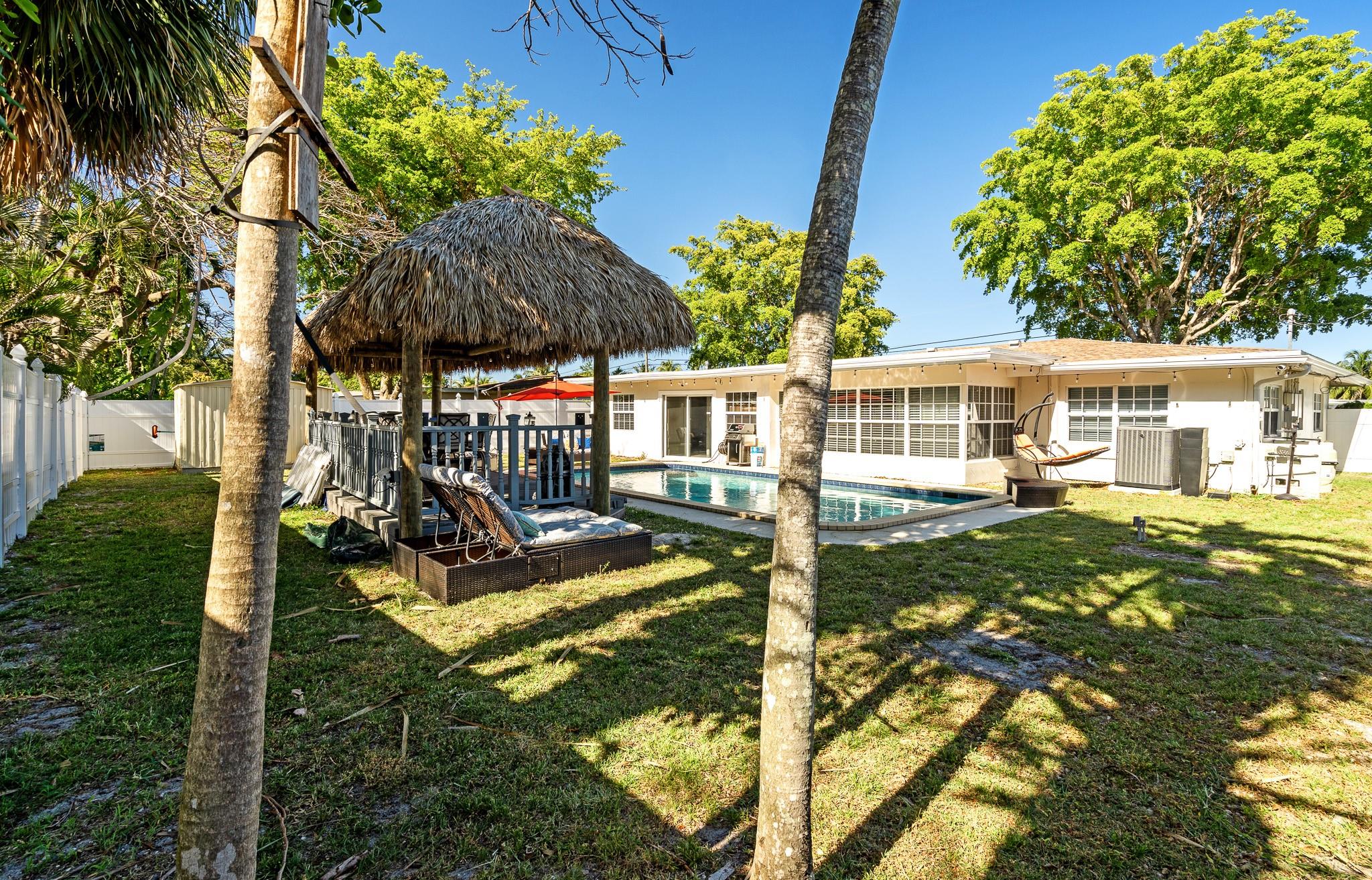 This 4 bed/2 bath pool home is conveniently located off Broward Blvd (ideal for I95 turnpike). The open concept layout flows seamlessly. Windows at the back overlook pool and deck - the perfect space for sipping cocktails on those long summer nights. Converted garage (with AC) can be used as office, TV/media room or as a 5th bedroom. Back yard overlooks a green space, so it's very private. The house has been updated with new blinds, ceramic tile floors, appliances, roof, AC, & hot water heater. Other improvements: fence replaced, gutters installed, master bath/vanity/sink, pool pump, ceiling fans in bedrooms (all 2023). Tiki hut w/power, 55-inch TV/ceiling fan, impact windows & doors, 50 amp outlet for camper van/boat, dryer converted from gas to electric (all 2024). Furniture neg.