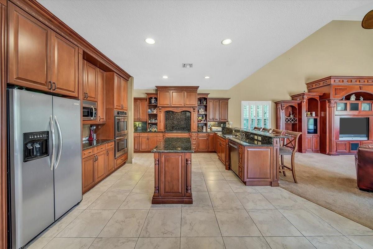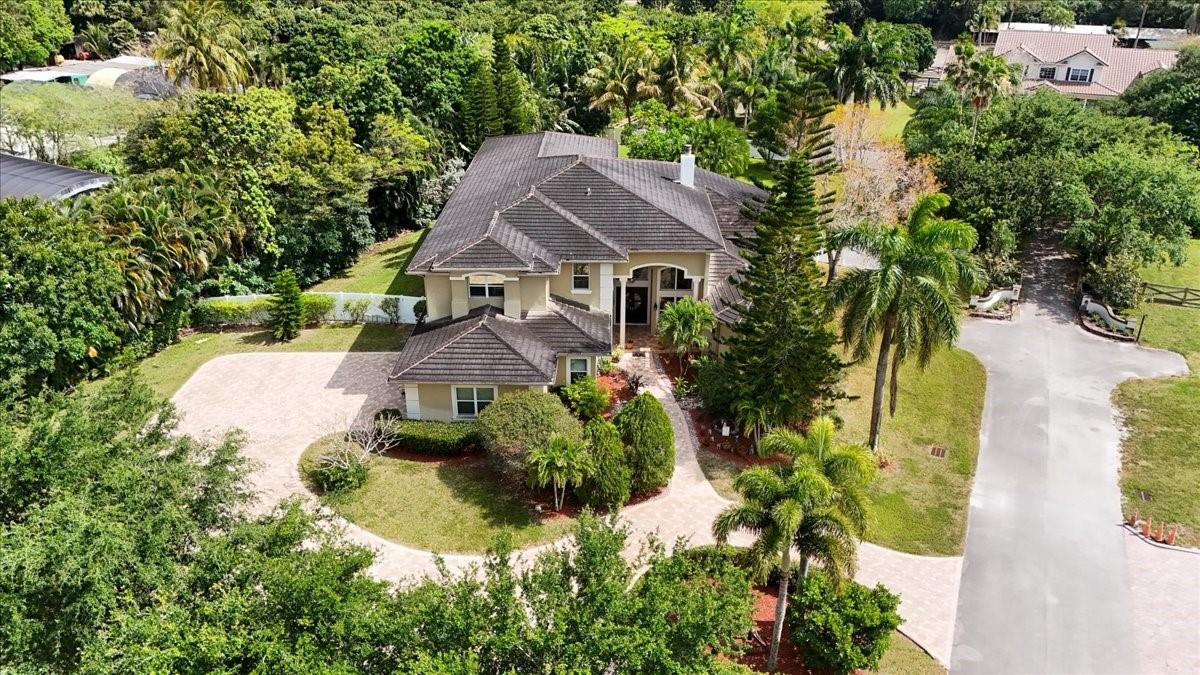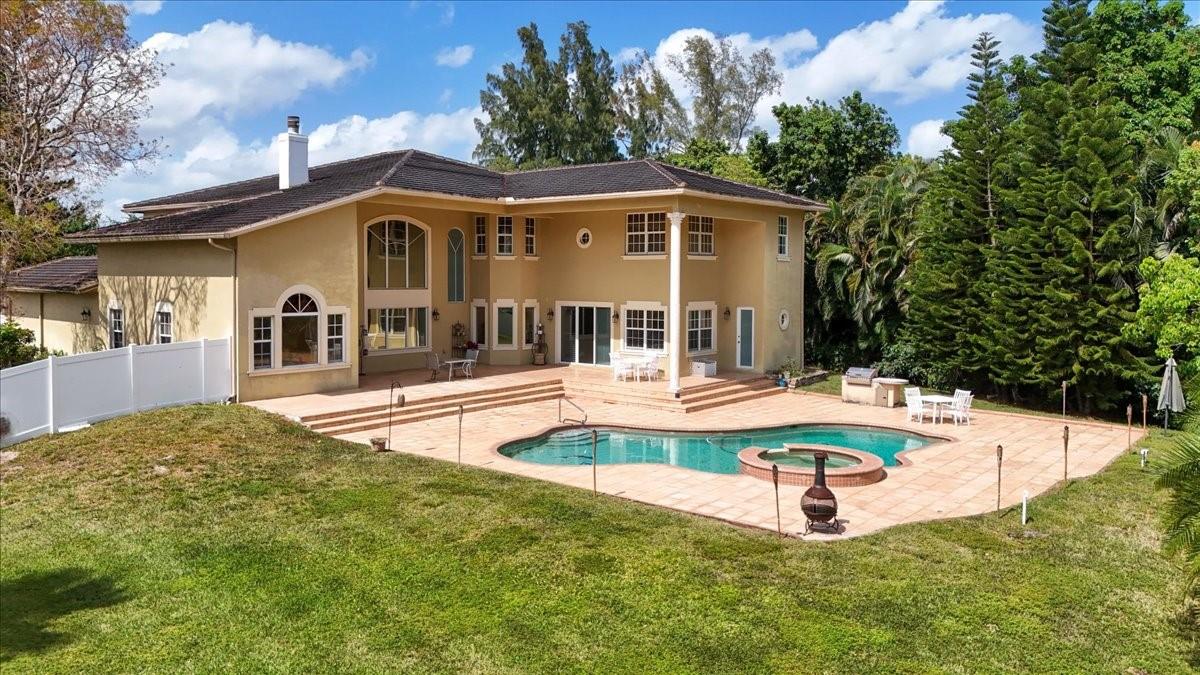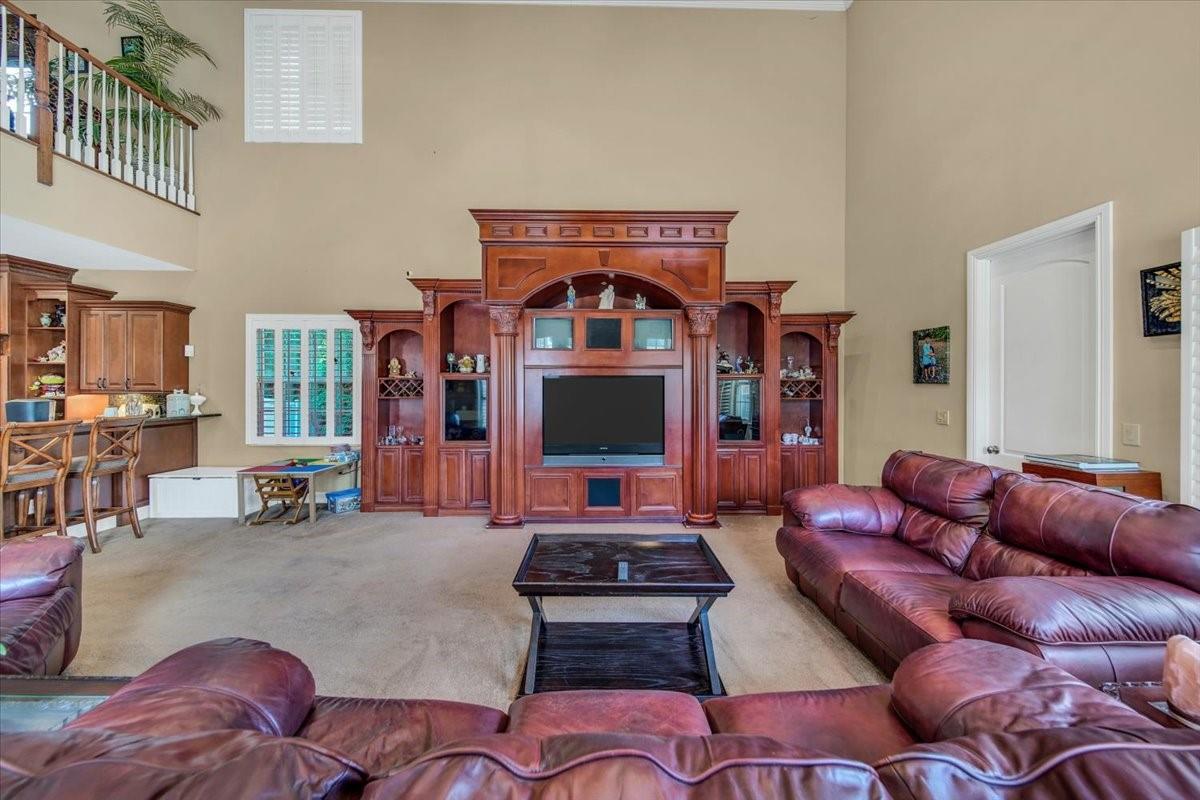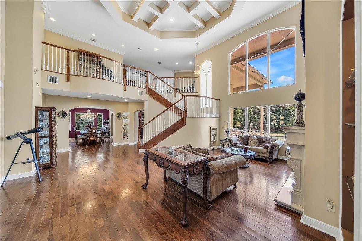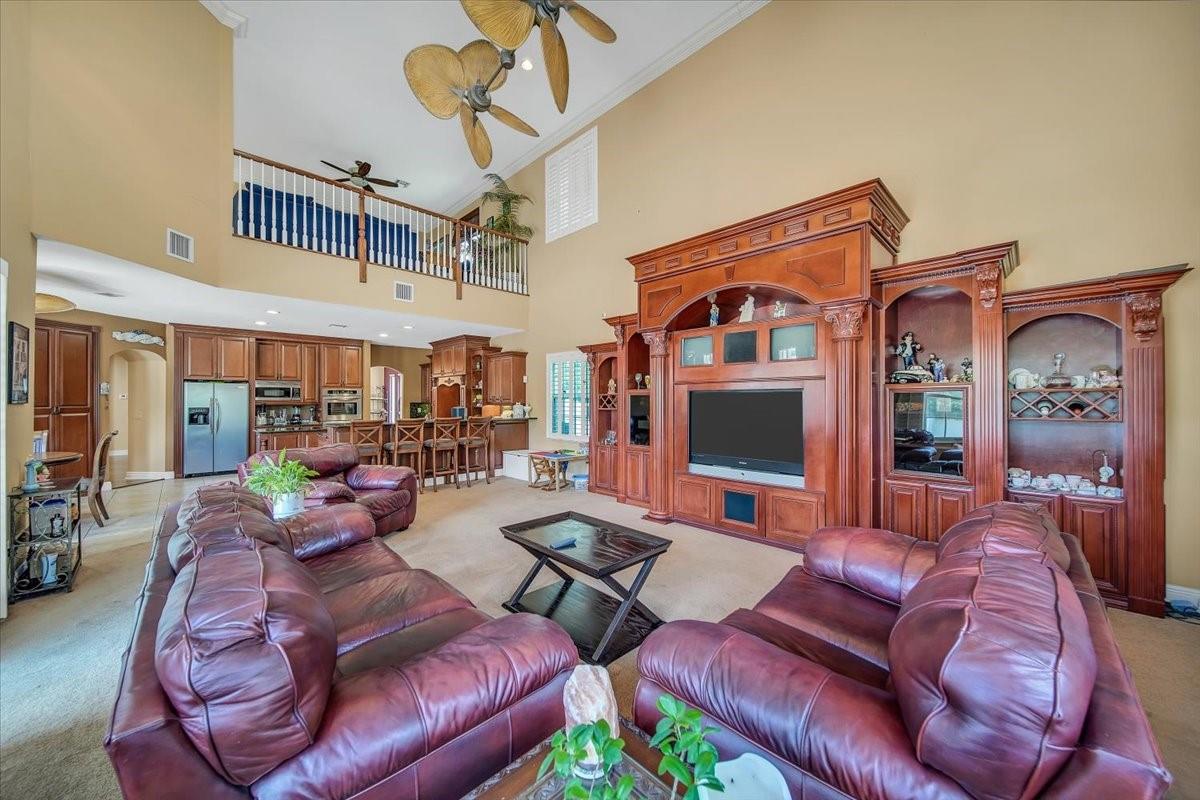 This expansive residence offers approximately 6,300 square feet of living space on over an acre of land with no HOA. Maintained by its original owner, the home features soaring 20-foot ceilings in the living room and family room, with a functional fireplace adding warmth. The spacious kitchen and family room are perfect for entertaining, while the spacious loft offers extra room for relaxation or activities. 5 large bedrooms, each accompanied by its own ensuite bathroom, ensuring comfort and privacy for every member of the household. Master suite is located downstairs with a sitting area, along with 1 other bedroom. Extra large 3-car garage with storage and workshop space, Impact windows, and a large pool with a spa. Home is on a cul-de-sac shared with only 2 other homes on a private road