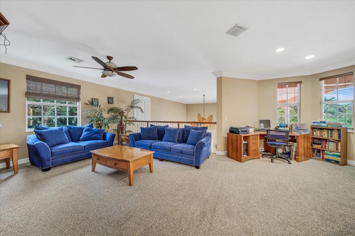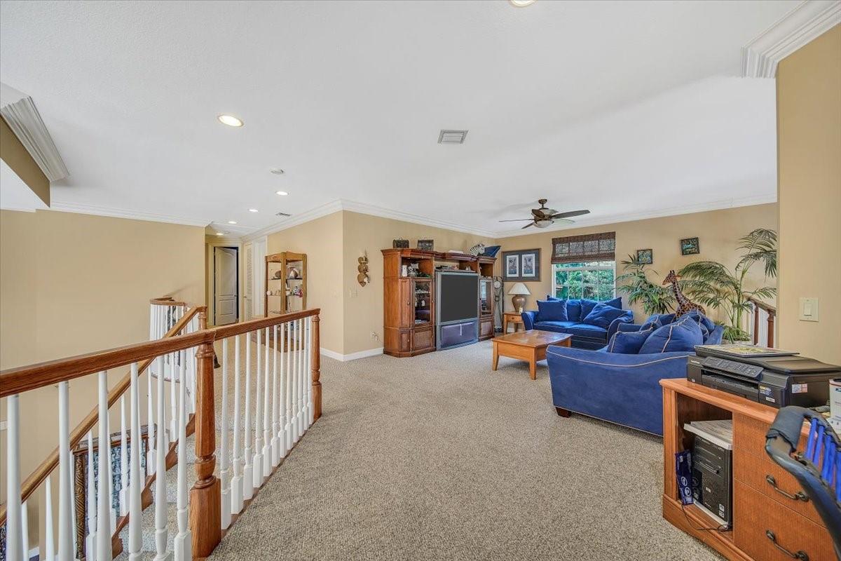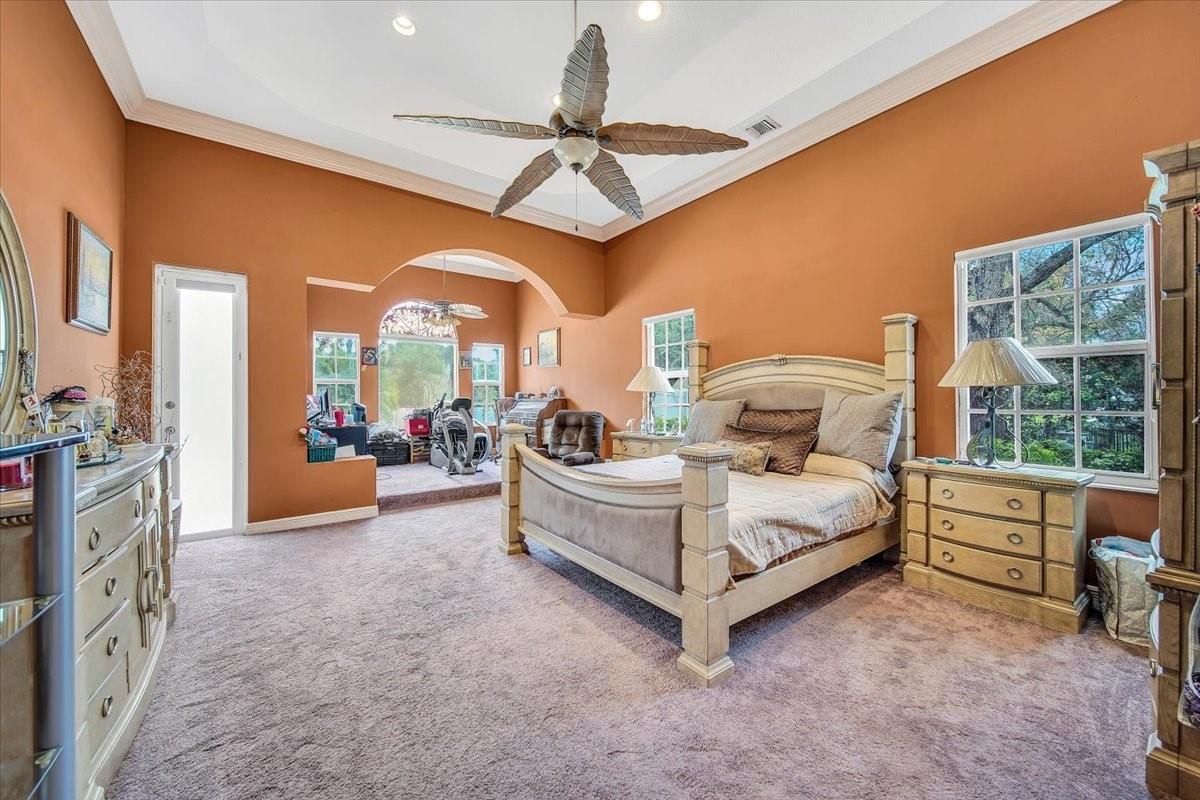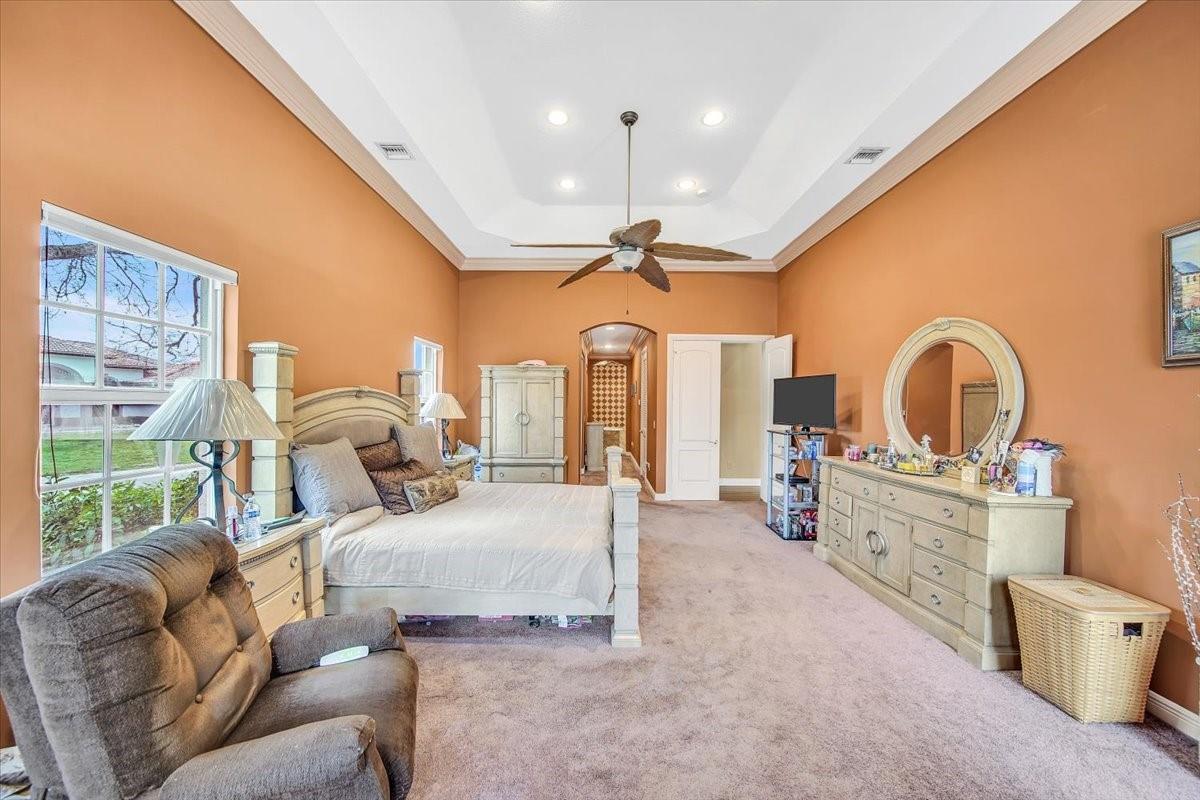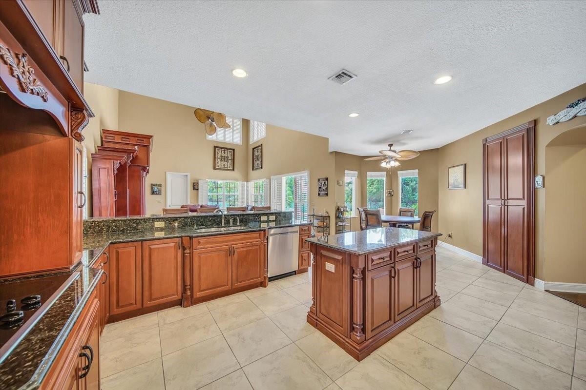 This expansive residence offers approximately 6,300 square feet of living space on over an acre of land with no HOA. Maintained by its original owner, the home features soaring 20-foot ceilings in the living room and family room, with a functional fireplace adding warmth. The spacious kitchen and family room are perfect for entertaining, while the spacious loft offers extra room for relaxation or activities. 5 large bedrooms, each accompanied by its own ensuite bathroom, ensuring comfort and privacy for every member of the household. Master suite is located downstairs with a sitting area, along with 1 other bedroom. Extra large 3-car garage with storage and workshop space, Impact windows, and a large pool with a spa. Home is on a cul-de-sac shared with only 2 other homes on a private road