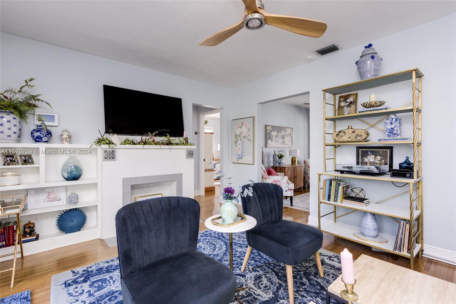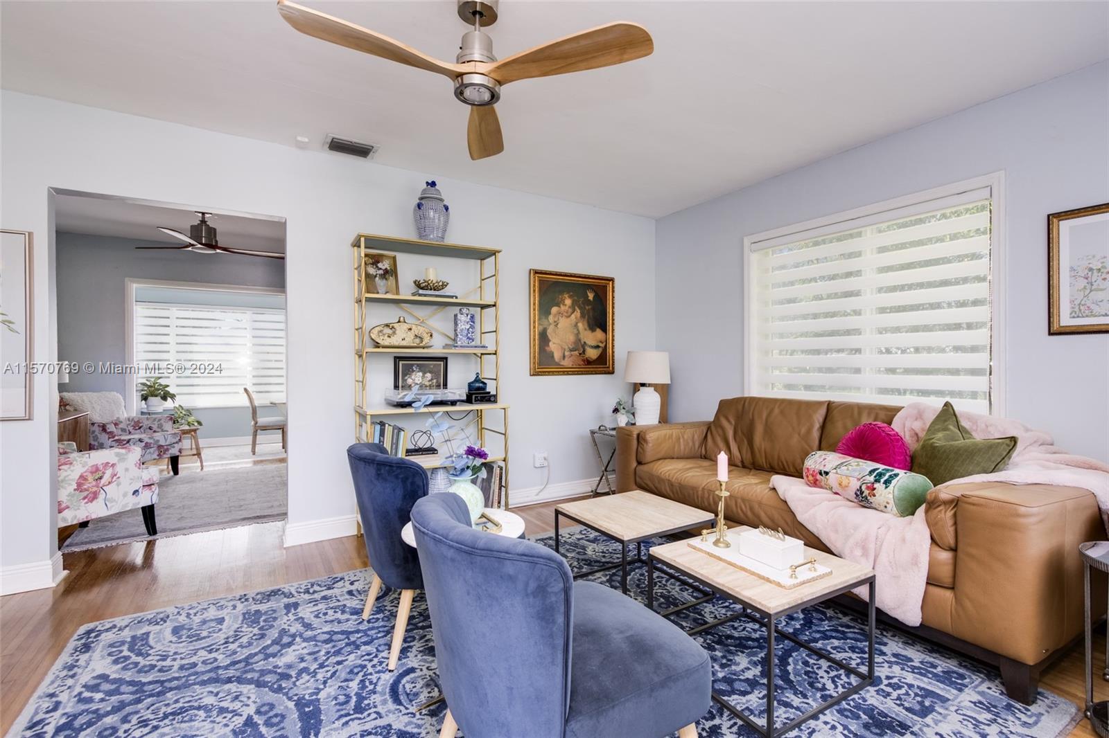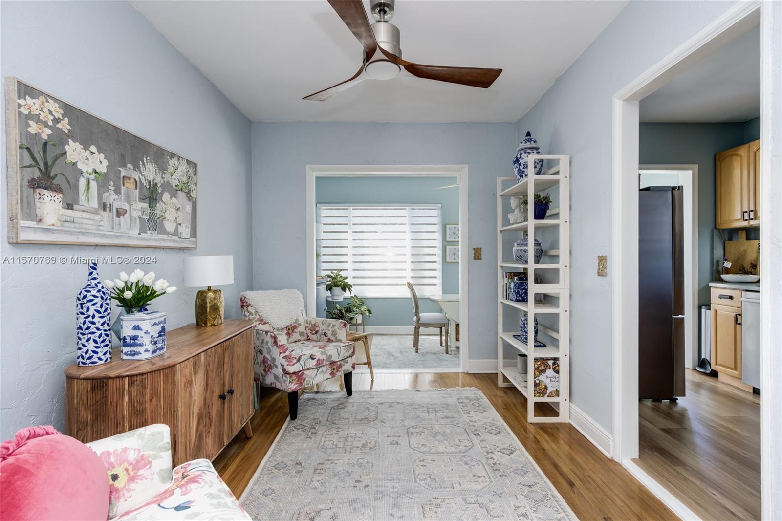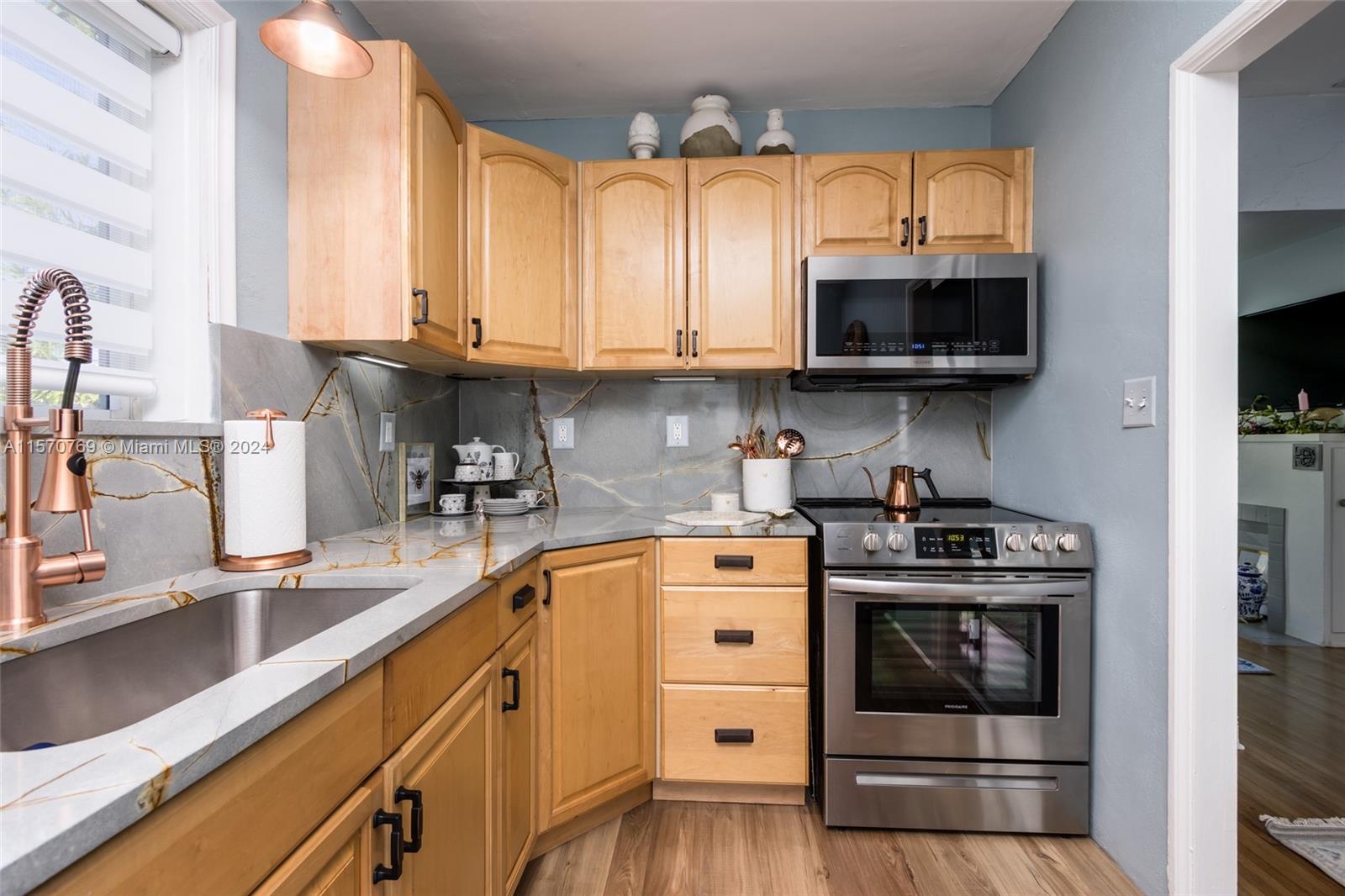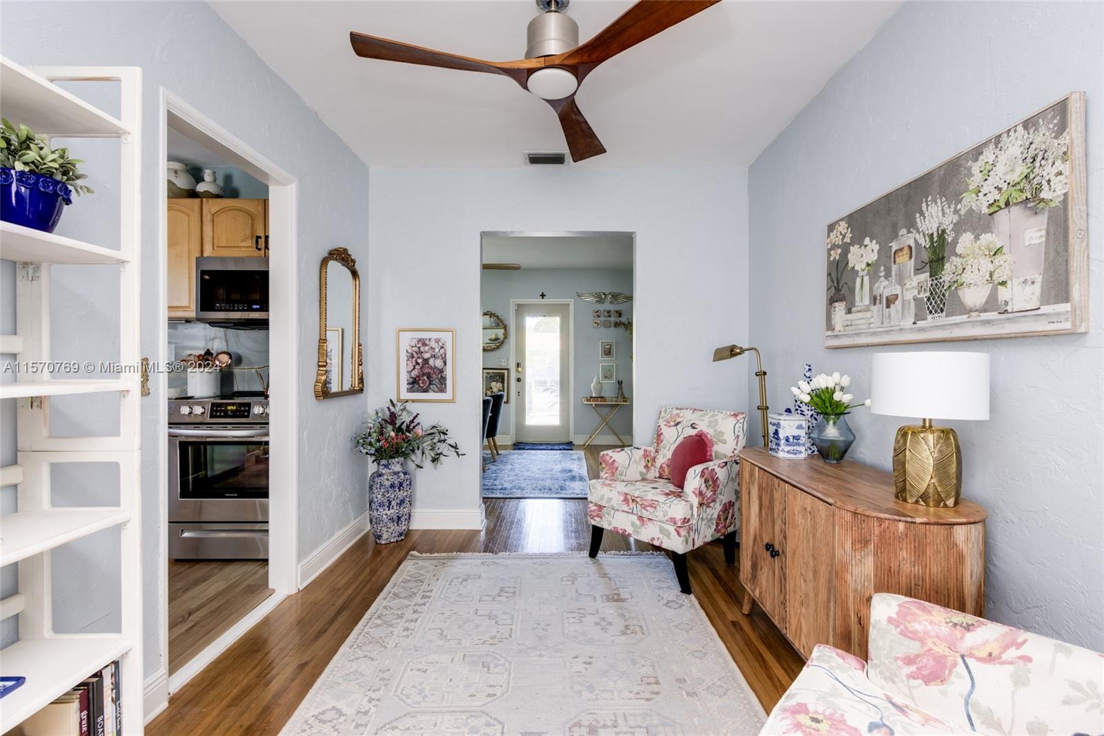 Step into this charming 1956 residence that offers the perfect blend of comfort, style, & convenience! This home is a true gem, with an abundance of natural lighting & original wood floors in the living room, dining room, and both bedrooms. An enclosed private driveway and a spacious fenced-in backyard, you can enjoy the Florida sunshine in peace & privacy. The gallery-styled kitchen is newly updated, featuring a unique polished quartzite countertop & matching backsplash, all new appliances. The stunning copper lighting over the newly installed sink & faucet set adds a touch of elegance. In addition to the polished wood floors, the living room features a wall of shelving that includes a beautiful faux fireplace that is a must-see. This home is truly a dream come true!