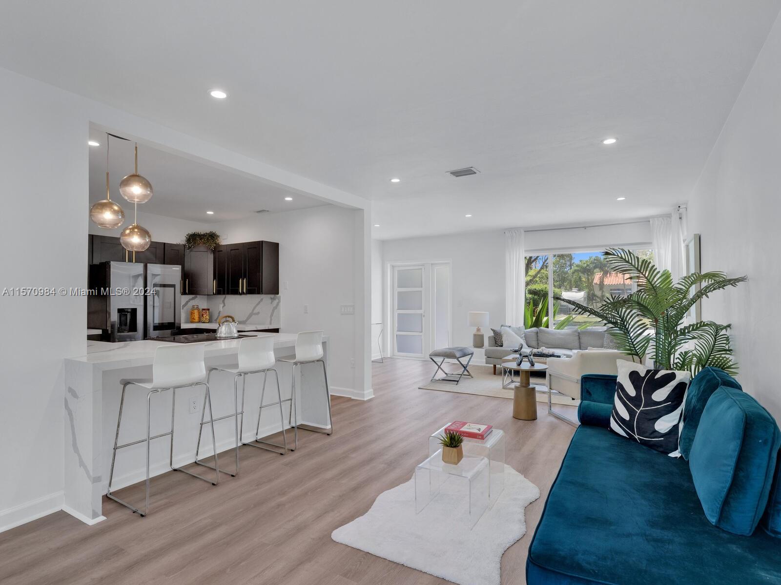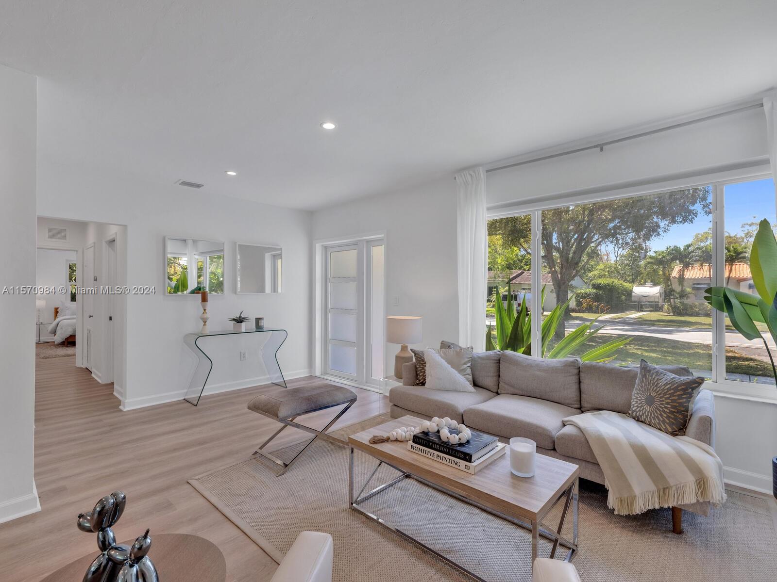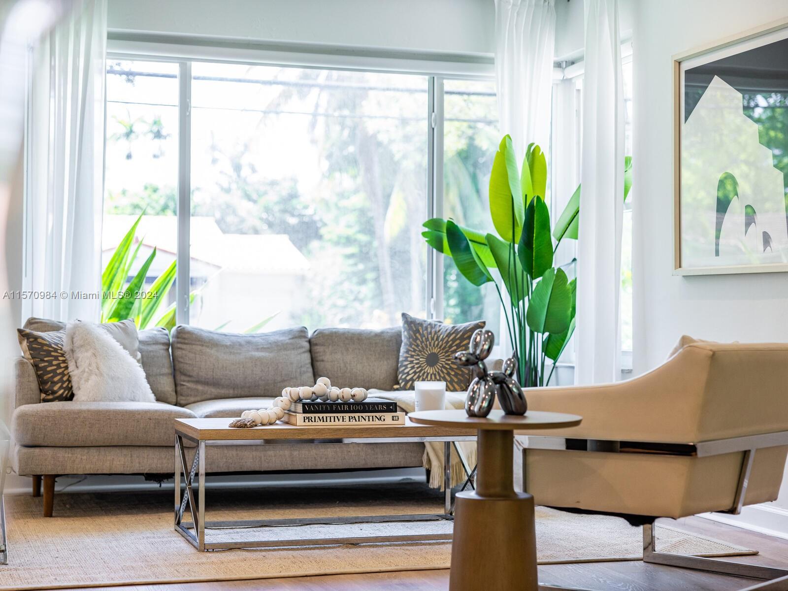 Welcome to the Sunny Modern Ranch! Discover timeless comfortable luxury in this beautifully-updated sun-soaked mid-century modern home. Enter into a fantastic open-flow floor plan with multiple living areas, large updated designer kitchen with breakfast bar, separate dining, and bonus media-sunroom-den flex space with wrap-around windows overlooking the green gardens. Sleep easy in two bright spacious bedrooms with generous closets. Great features: gorgeous brand new “white oak” LVT floors; updated designer double-vanity bathroom; and impact windows-doors. All on a large, non-flood zone corner lot with a private, peaceful two-zone backyard with room for a pool, just a few blocks to downtown Miami Shores shops and restaurants. You’ll agree— it’s always sunny at the Sunny Modern Ranch!