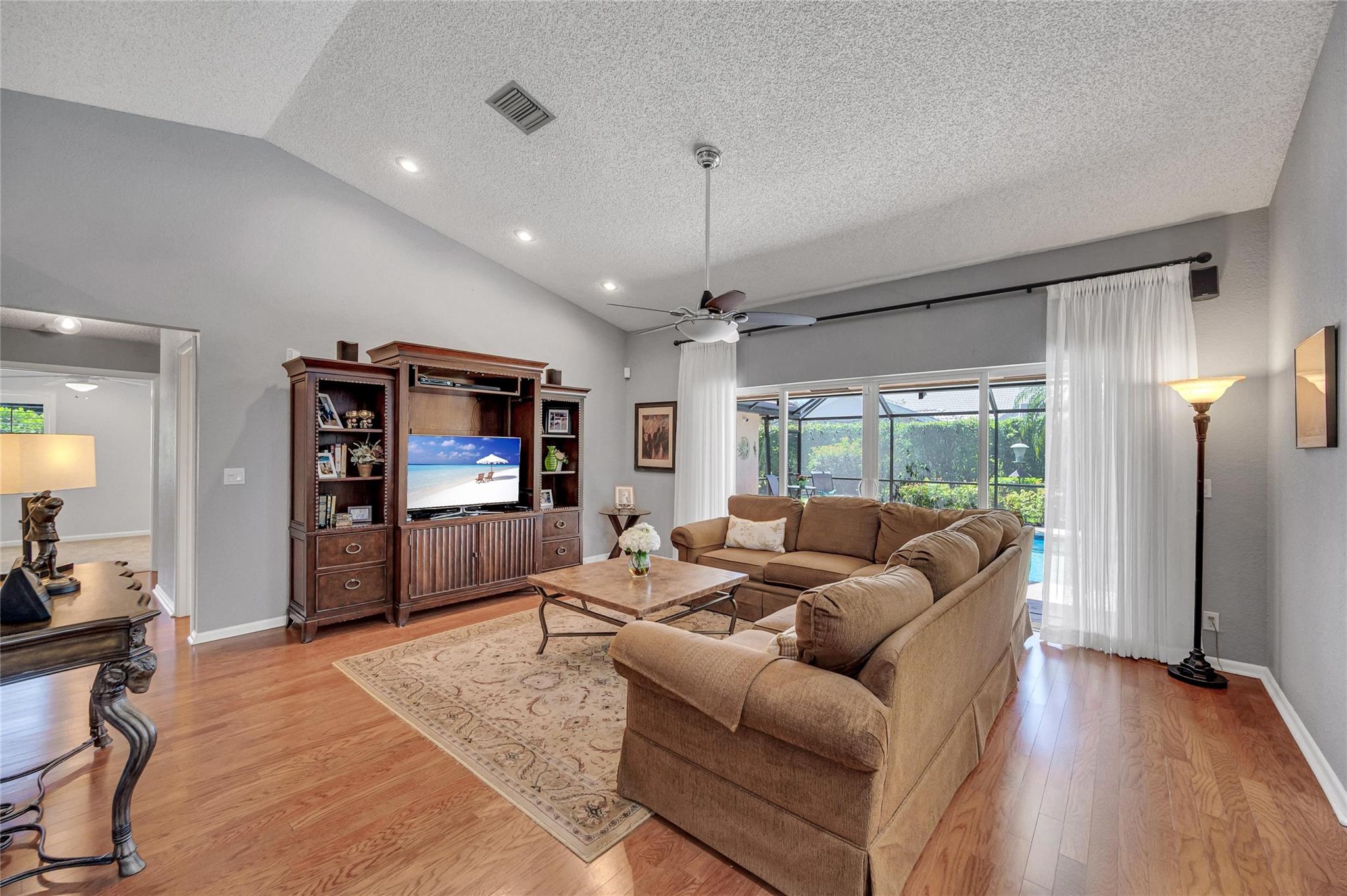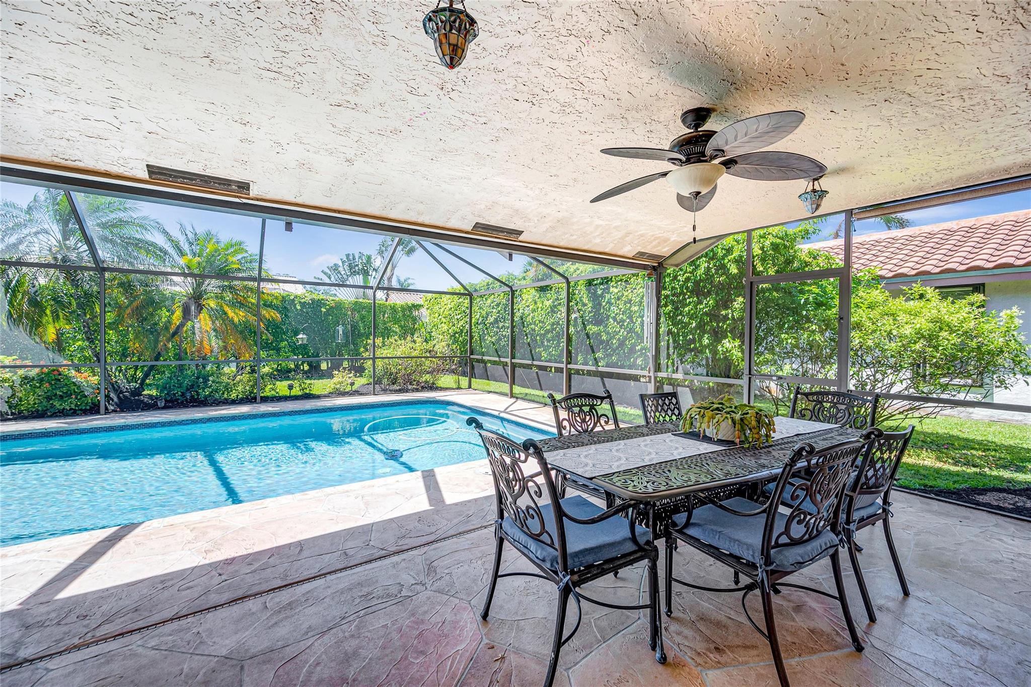 Lovely, well-maintained home in guard-gated Ridgeview. The freshly updated open kitchen, spacious rooms and inviting pool make it perfect for both relaxation and entertainment. Four bedrooms featuring new carpet and ample closet space ensure comfort for all. Retreat to your poolside primary which offers an impeccably updated ensuite bathroom. The screened patio is a peaceful place to enjoy breakfast while taking in serene garden views. Conveniently an in-home utility room and two-car garage are just beyond the kitchen. Impact windows with plantation shutters and impact sliding glass doors are throughout. Updates include 2015 roof, 2020 pool replaster, 2022 A/C, and 2023 water heater. Target, Fresh Market, restaurants, and movie theaters are just around the corner. Welcome Home!