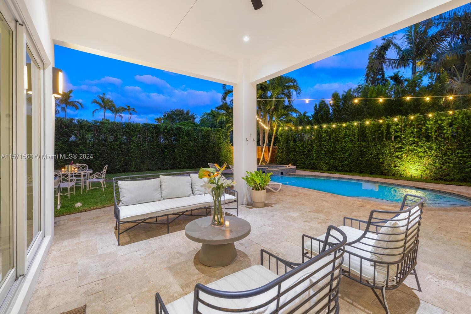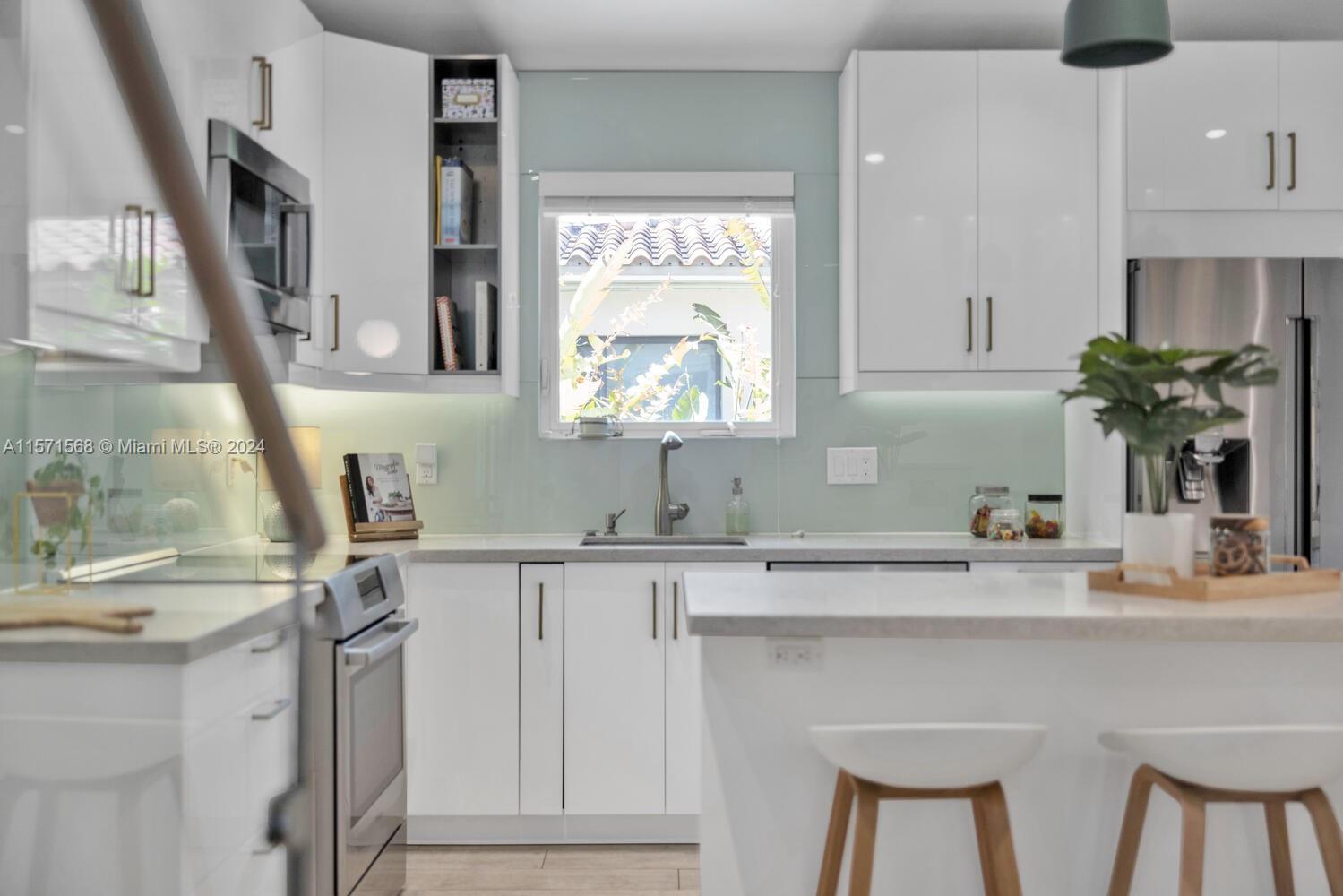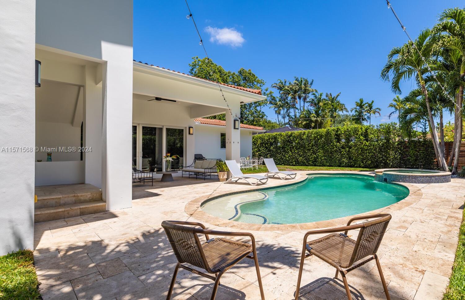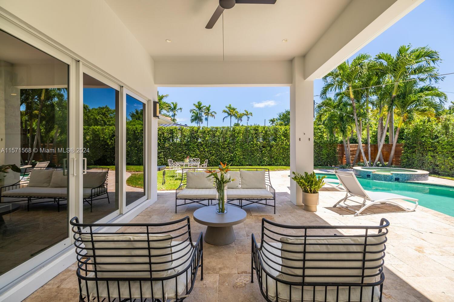 Welcome to Watersong! This magical, rare, five-bedroom secluded East Miami Shores mid-century modern pool home flows like a poem and will be music to your ears! Enter through a welcoming front porch into multiple cascading living areas with high ceilings, a designer eat-in kitchen and dining, opening through sliding doors to a grand vaulted covered terrace, lush fenced private gardens and sparkling pool and spa with soothing fountain feature—perfect for entertaining or relaxing. Great open-flow plan with five split spacious bedrooms (three are full ensuites). Fantastic features: modern designer kitchen and baths; hardwood floors; newer concrete tile roof; impact windows-doors; upgraded electrical-plumbing; and new smart-zoned AC system. All in one of The Shores’ most prestigious locations!