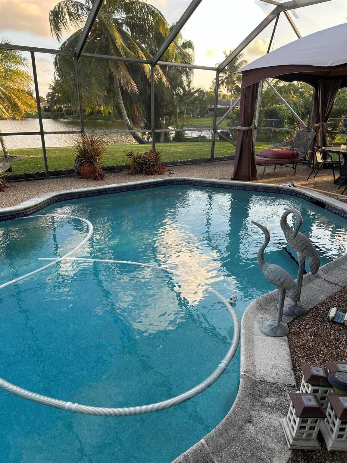BEAUTIFUL LAKEFRONT HOME WITH A SCREENED PATIO AND SALT WATER POOL. SPLIT 3 BEDROOM, 2 BATHROOM HOME, Interior has an open floor concept with 3 sliding glass doors overlooking the lake views creating an open and bright living area. Updated kitchen with stainless steel appliances and granite countertops. Impact windows throughout and retractable hurricane shutters on sliders. New roof completed 2022. Abundant storage space and laundry in 2 car garage. Low HOA fees with a newly renovated community pool area. Call for showings