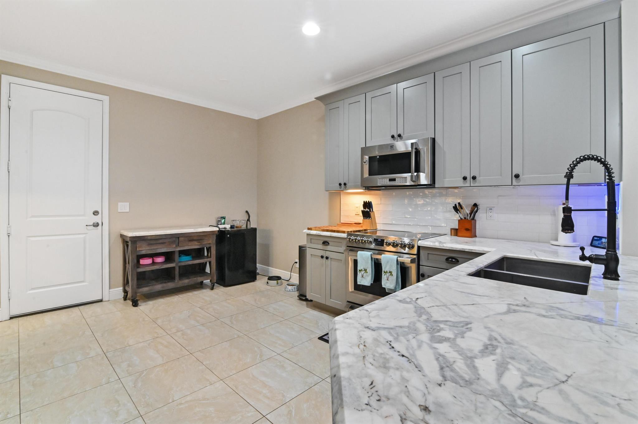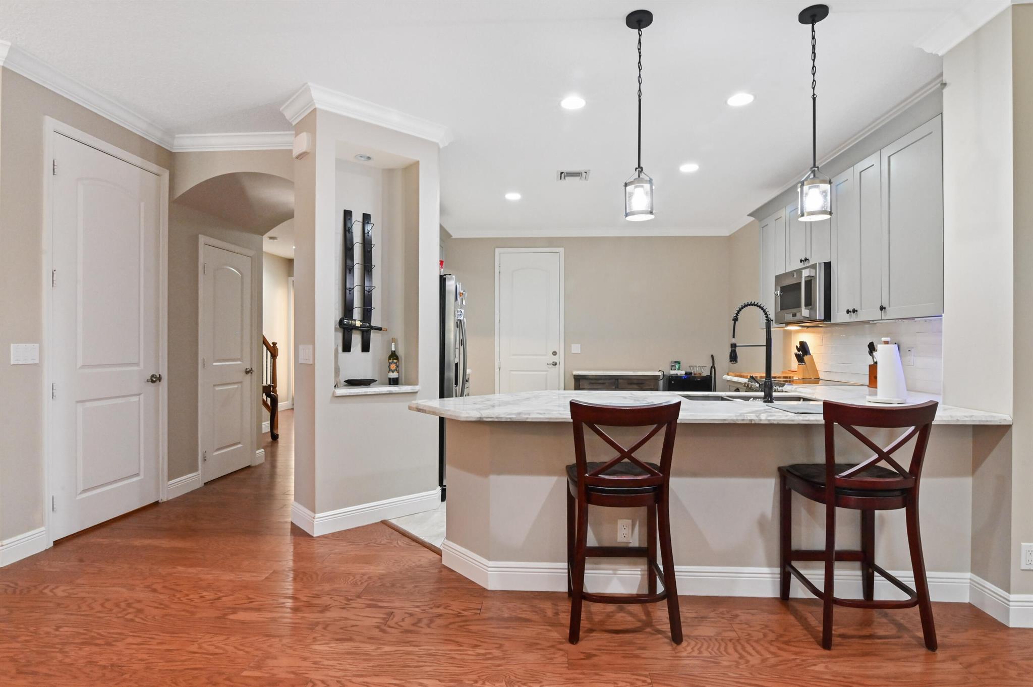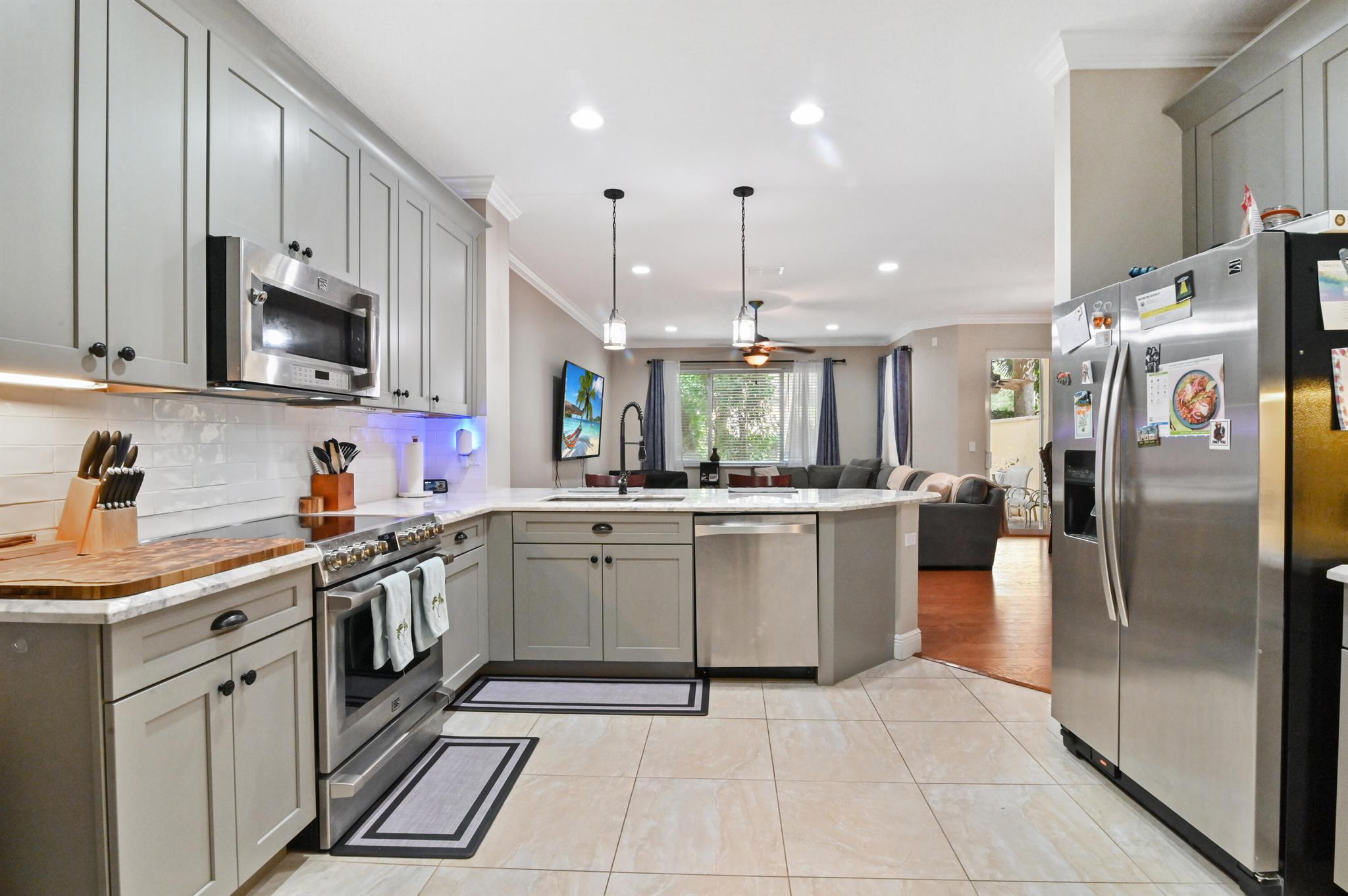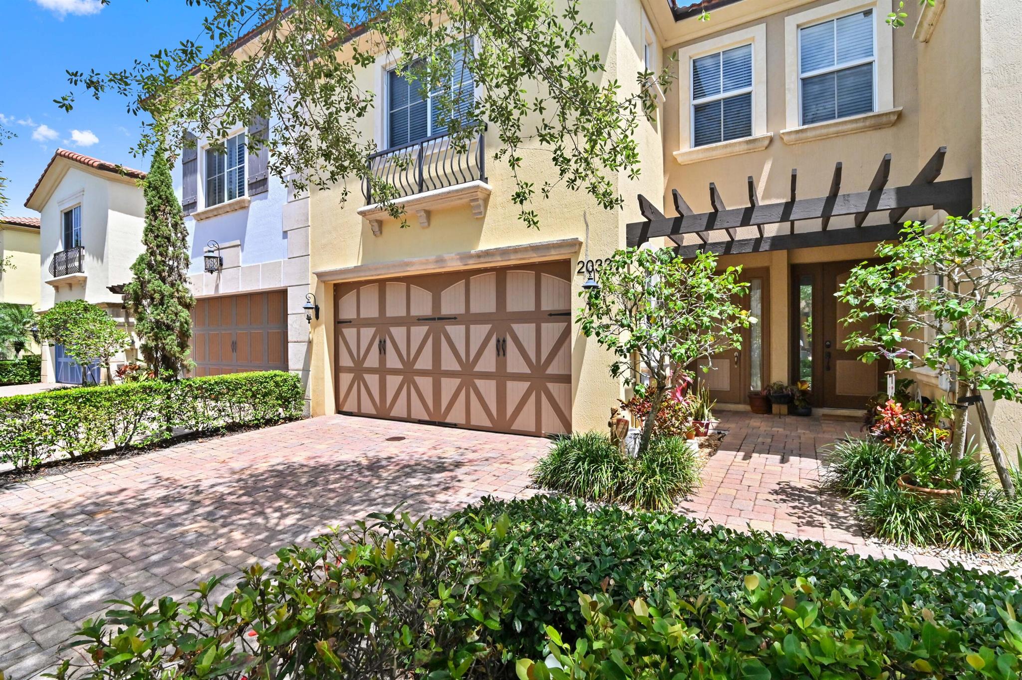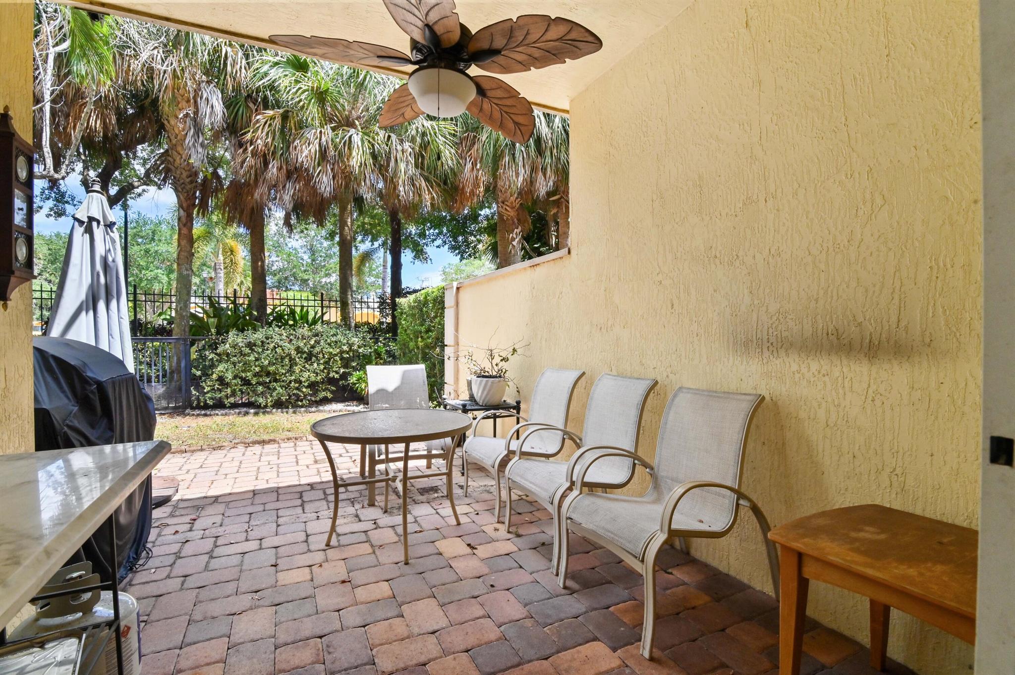 Come live in this beautifully remodeled, spacious, two story townhome w/ impact windows. Custom kitchen w/ Quartzite counters, professional grade stove/oven, matching convection microwave, dual sinks, under cabinet lighting and 42'' cabinets. Crown molding and hardwood floors on lower level with laminate wood adorning the staircase. All bedrooms are nicely sized. Oversized primary w/ two massive walk in closets and tray ceiling. Plenty of storage with cabinetry in the garage. AC done in 2023! Landscaped backyard with private extended patio. Upstairs laundry room with wash basin and front loading washer/dryer. Centrally located close to the Turnpike, I-95, Downtown, Cityplace, airport and the beach. HOA covers insurance, exterior maintenance, clubhouse with game room and heated pool.