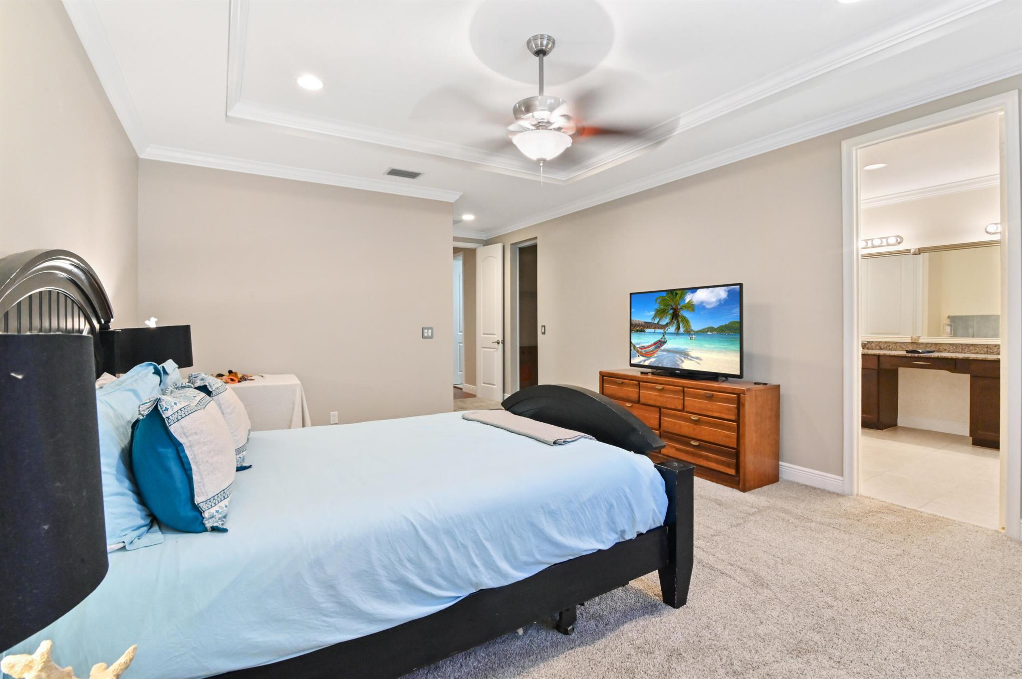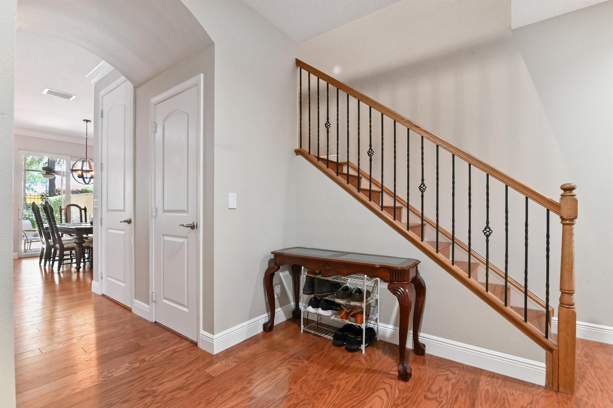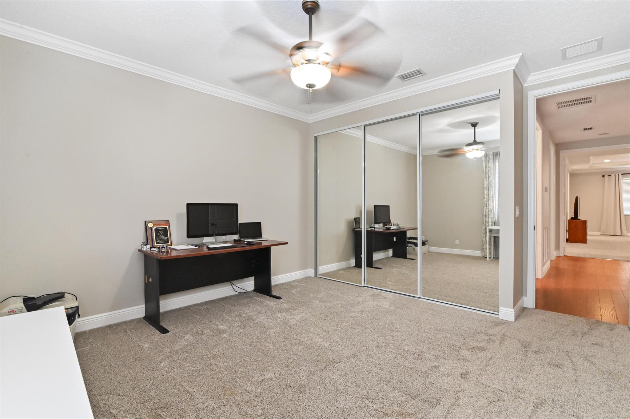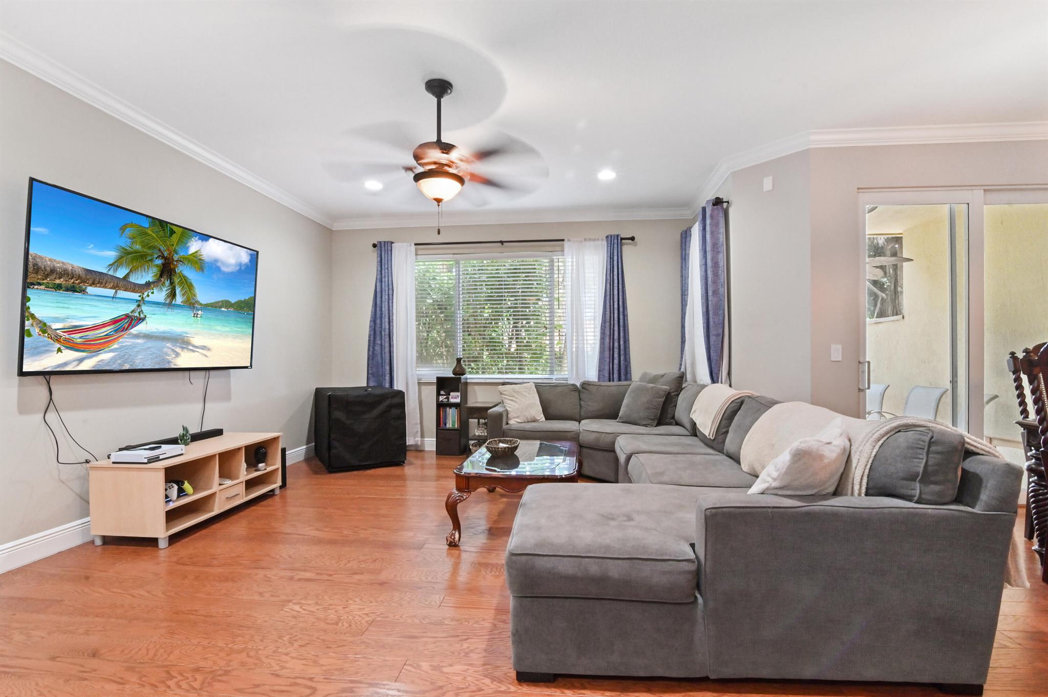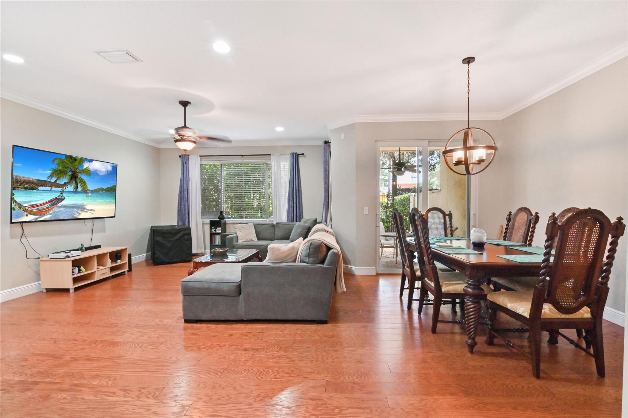 Come live in this beautifully remodeled, spacious, two story townhome w/ impact windows. Custom kitchen w/ Quartzite counters, professional grade stove/oven, matching convection microwave, dual sinks, under cabinet lighting and 42'' cabinets. Crown molding and hardwood floors on lower level with laminate wood adorning the staircase. All bedrooms are nicely sized. Oversized primary w/ two massive walk in closets and tray ceiling. Plenty of storage with cabinetry in the garage. AC done in 2023! Landscaped backyard with private extended patio. Upstairs laundry room with wash basin and front loading washer/dryer. Centrally located close to the Turnpike, I-95, Downtown, Cityplace, airport and the beach. HOA covers insurance, exterior maintenance, clubhouse with game room and heated pool.