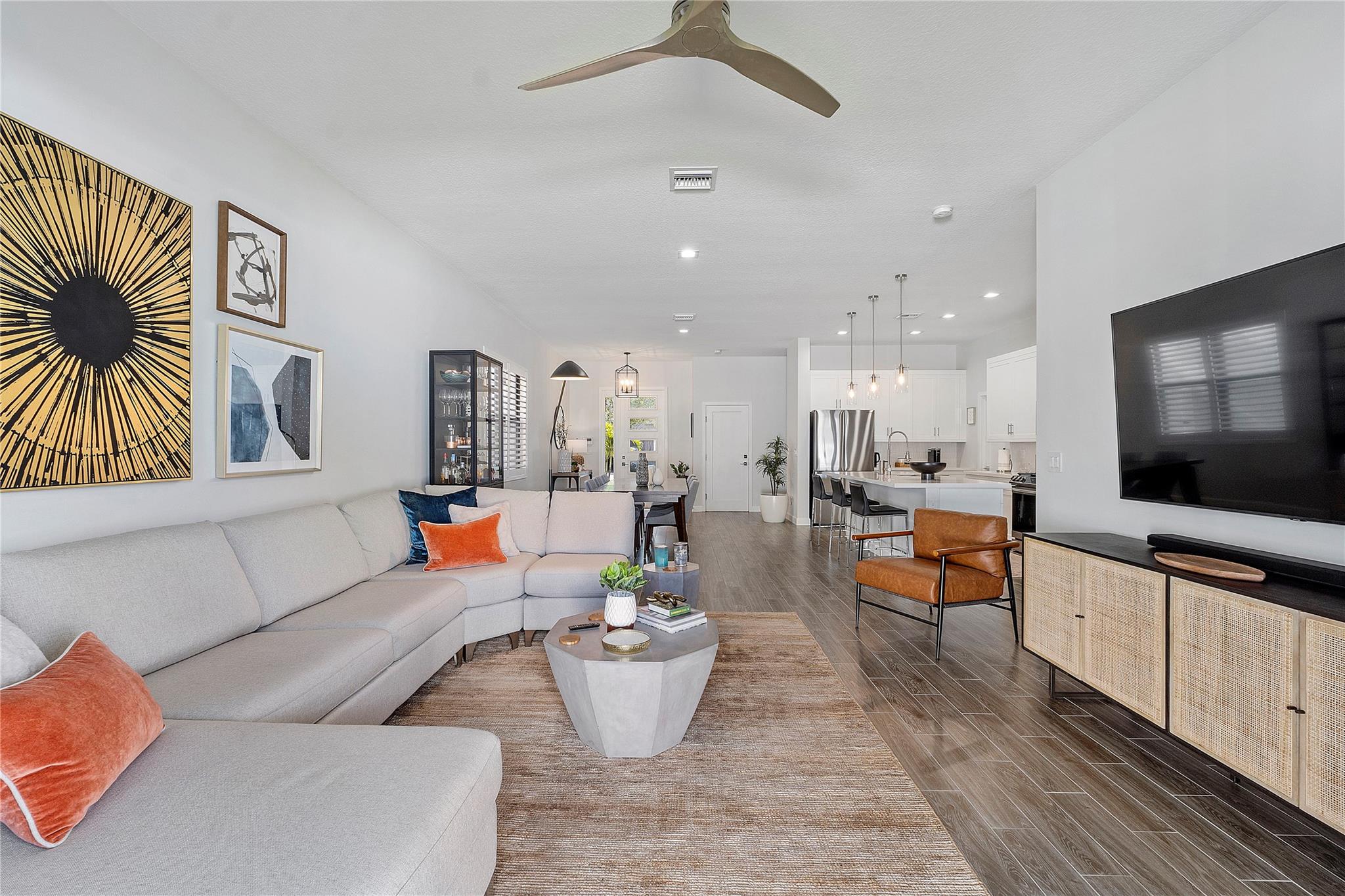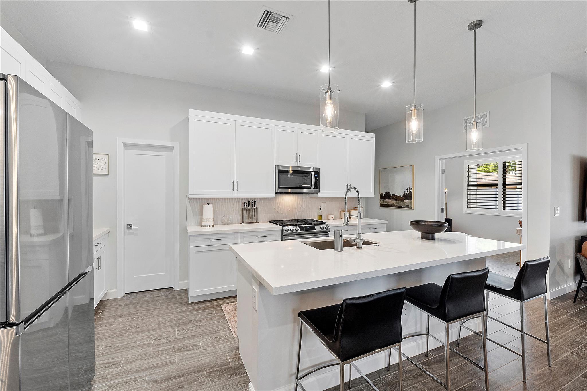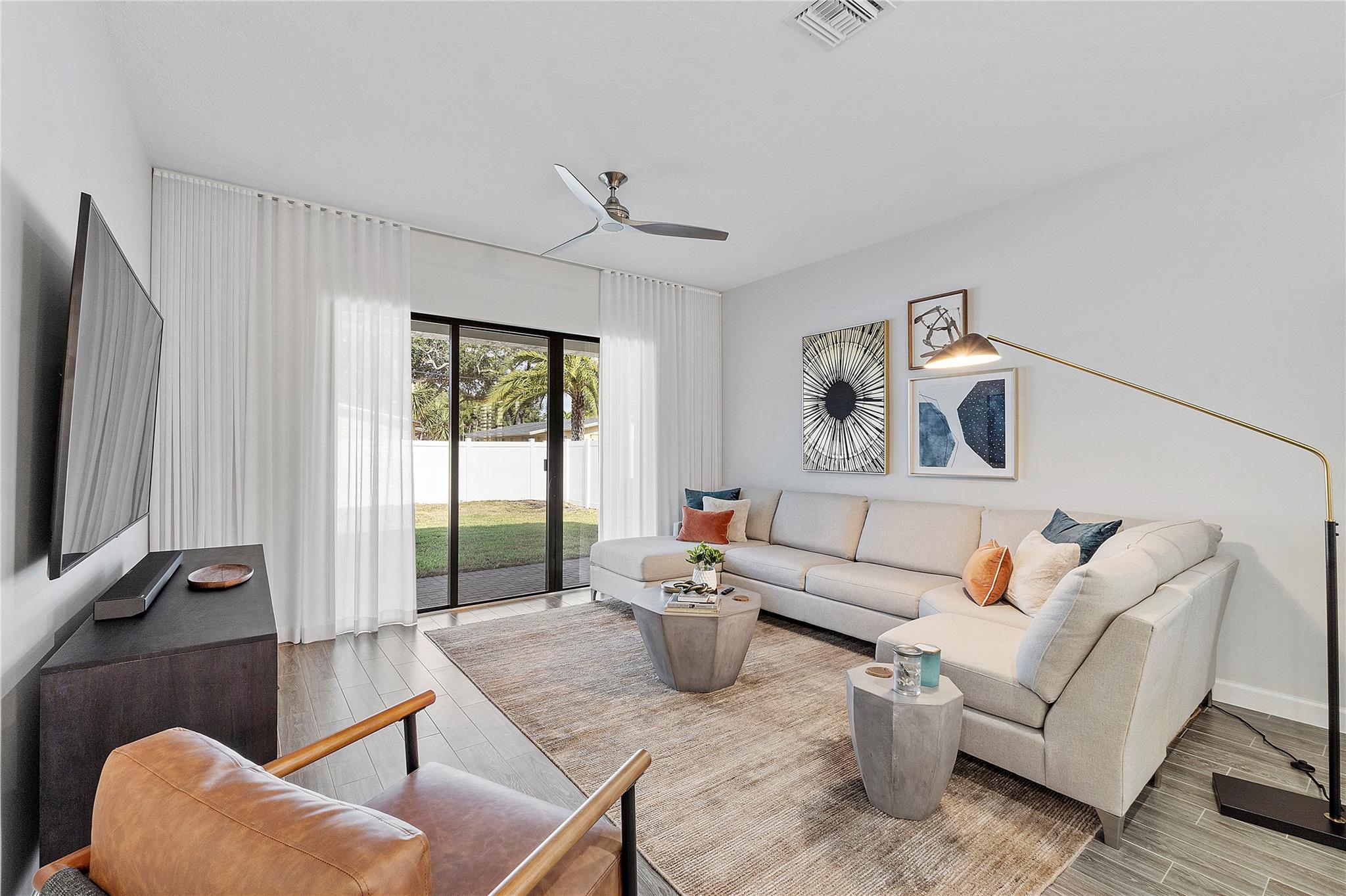Welcome to 4967 Whispering Way, located in beautiful Whispering Oaks in Dania Beach. Step inside this immaculately maintained 3/3 with den/office that could be a 4th BR. This spacious open floor plan home has modern finishes, 10ft ceilings throughout and tons of natural light. The gourmet kitchen features stainless steel appliances, gas stove, quartz countertops and a large island perfect for entertaining. The primary suite is a true retreat boasting custom walk-in closets and a luxurious en-suite bathroom. The home features plantation shutters, custom curtains, frameless shower doors, home automation, upgraded lighting and much more. This private gated community is located minutes from Dania Pointe, I-95, Fort Lauderdale Airport and beaches. Don't miss the opportunity to call this home!