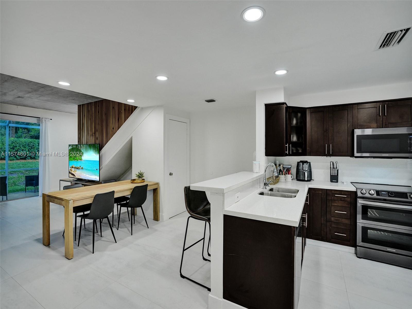 Updated Modern 2-bedroom, 2.5-bathroom townhouse nestled in the esteemed San Remo Gated Community of Weston, FL. The open floor plan boasts sleek tile flooring throughout. The kitchen has undergone a lavish transformation, with quartz countertops, stainless steel appliances, and a dual oven. An upgraded half-bathroom awaits on the first floor for guests. Step onto the screened-in patio, a serene spot for relishing the outdoors. A single-car garage, complete with a washer/dryer, and a tankless water heater. Upstairs, each bedroom boasts its own full bathroom and walk-in closet, ensuring comfort and privacy. Accordion hurricane shutters for added peace of mind. Embrace the gated community lifestyle, complete with amenities such as a pool, basketball court, playground, & ample guest parking.