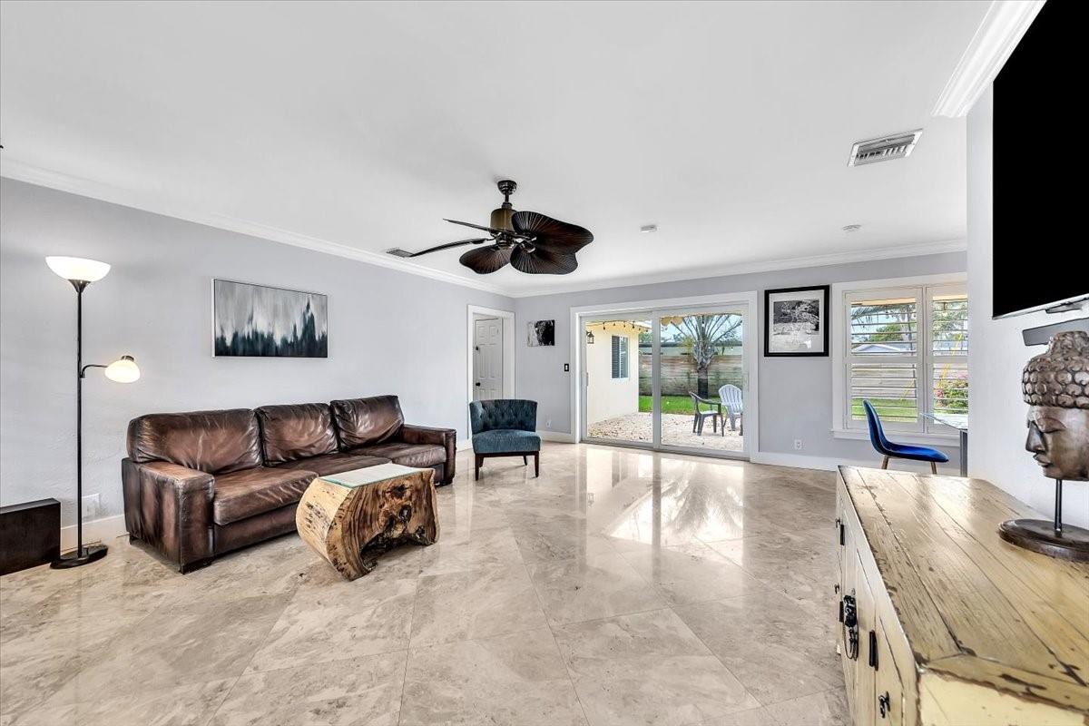 Great home in a great location! One of the last single family areas in hot up and coming Pompano Beach, East of Federal Hwy. Park your boat or RV on this spacious & open 3 bed, 2 bath home with huge fenced in yard on a corner lot featuring many upgrades, such as paved circular driveway, full impact windows, travertine flooring in living area, wood looking tile in bedrooms, classic timeless kitchen design with stainless steel appliances, custom closets, beautiful upgraded baths, large laundry/storage closet and huge peaceful yard with plenty of room for pool & entertainment. Home is just minutes from the beach, boat ramp, municipal park, golf course, restaurants, shops, nightlife and all the redeveloped East Pompano Beach has to offer. Can't miss! Grab your golf cart 7 enjoy East Living!