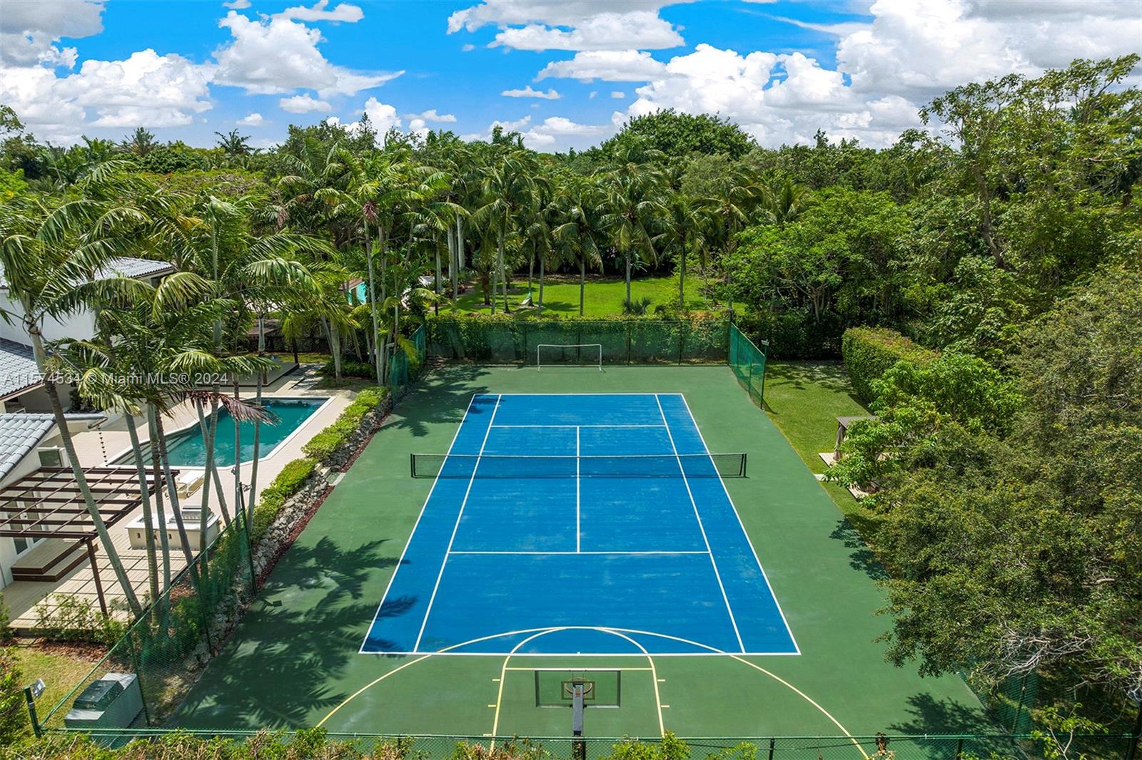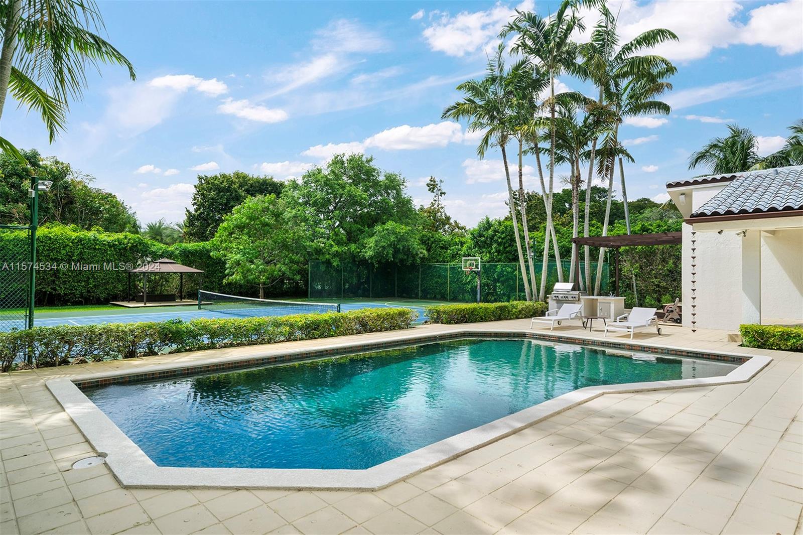 Discover an impressive one-story home in North Pinecrest with a tennis court. Welcomed by a grand foyer leading to a spacious formal living room with high ceilings, creating an inviting atmosphere. Discover spacious entertaining areas: formal dining, cozy breakfast nook, and open-style kitchen connected to a large family room. The family room boasts a convenient built-in bar and enjoy a home theater room on the second level for entertainment. Retreat to the renovated master suite with a spa-like bath and private outdoor deck. The backyard offers a tranquil ambiance with a pool, tennis court, and summer kitchen. Other features include a versatile playroom, impact windows/doors, and proximity to top-rated schools.