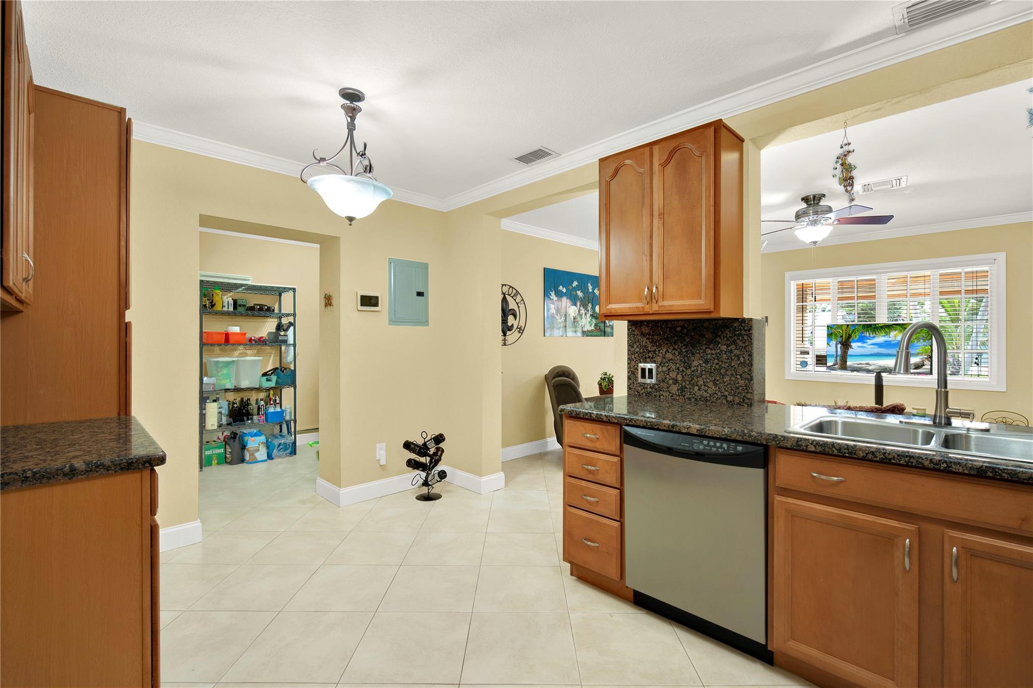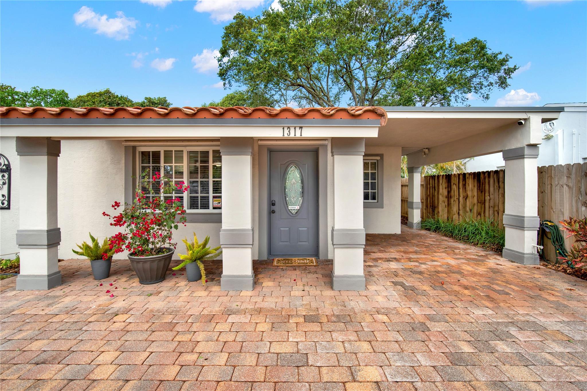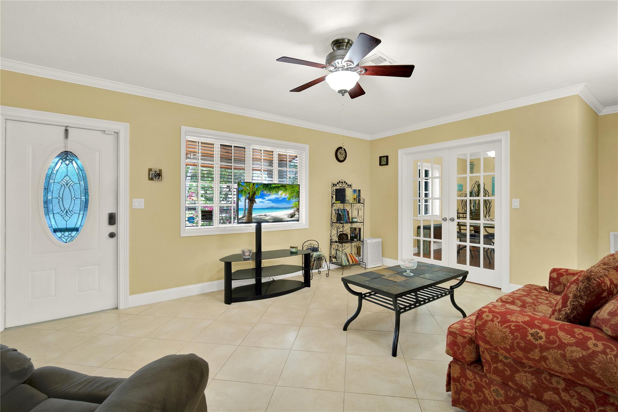 Well-maintained 3 bedroom 2 bath home, built to last with overly spacious rooms that open up with plantation shutter french doors to the large paved back yard, with delightful flowers, fruit trees, and vegetable garden. The home was rebuilt in 2006 with complete new PVC plumbing and updated electrical. Tile Roof replaced in 2016 with custom rain gutters. Pest control insulation in 2023. Master bath has large shower his/hers sinks, kitchen beautifully updated with wood cabinets, granite tops, and walk in pantry/utility with washer and dryer in a closet. The exterior was painted and property fenced in 2022. Property has shutters,motion lighting around the exterior, transferable ADT alarm system, and water irrigation. Perfect blend of modern convenience and cozy charm.