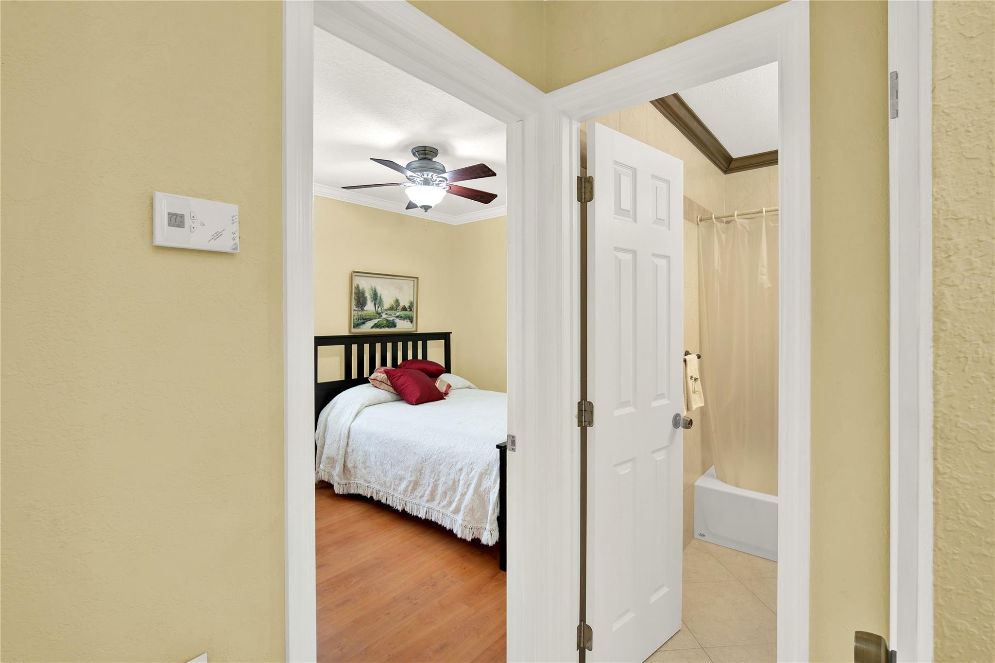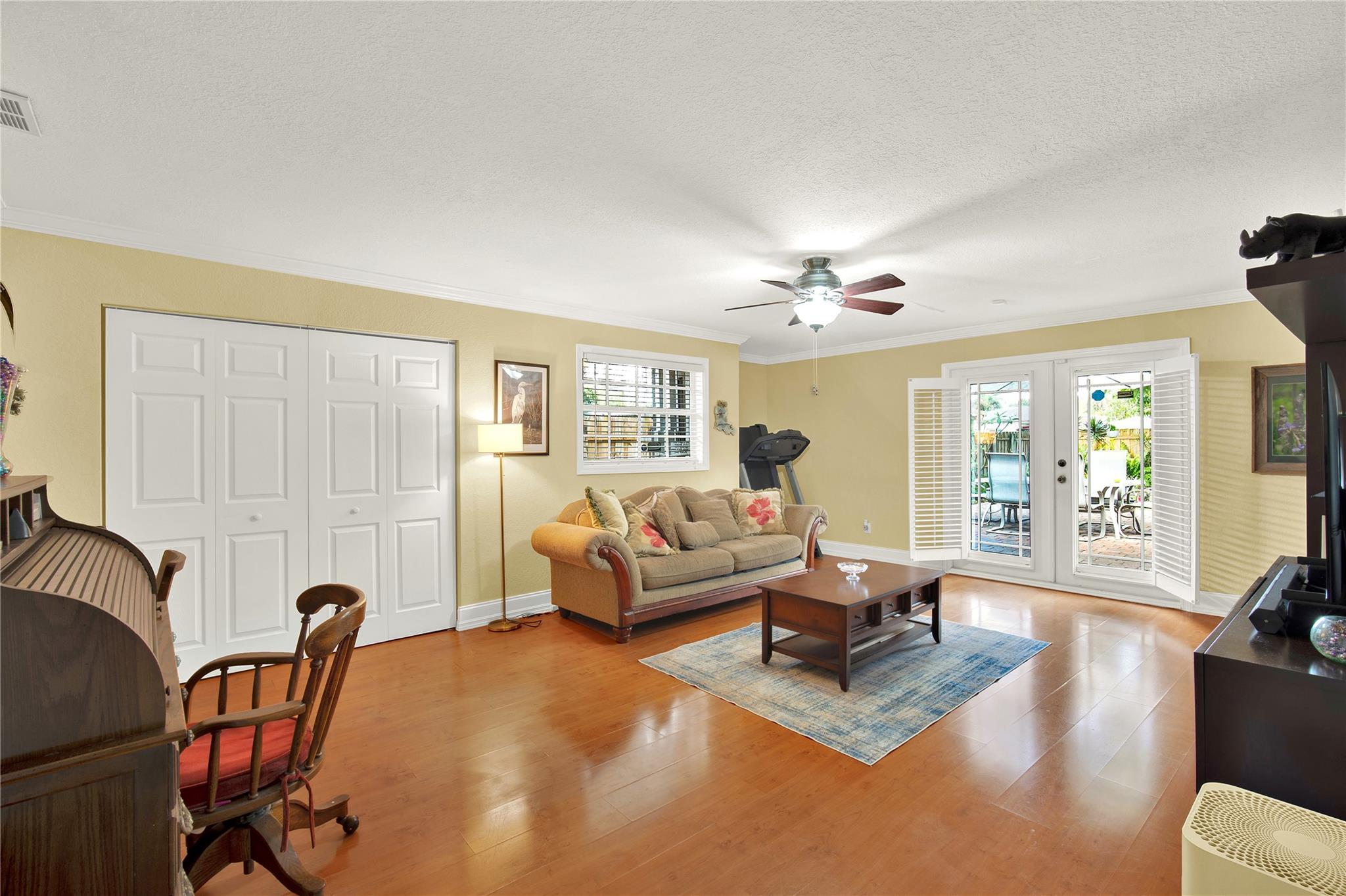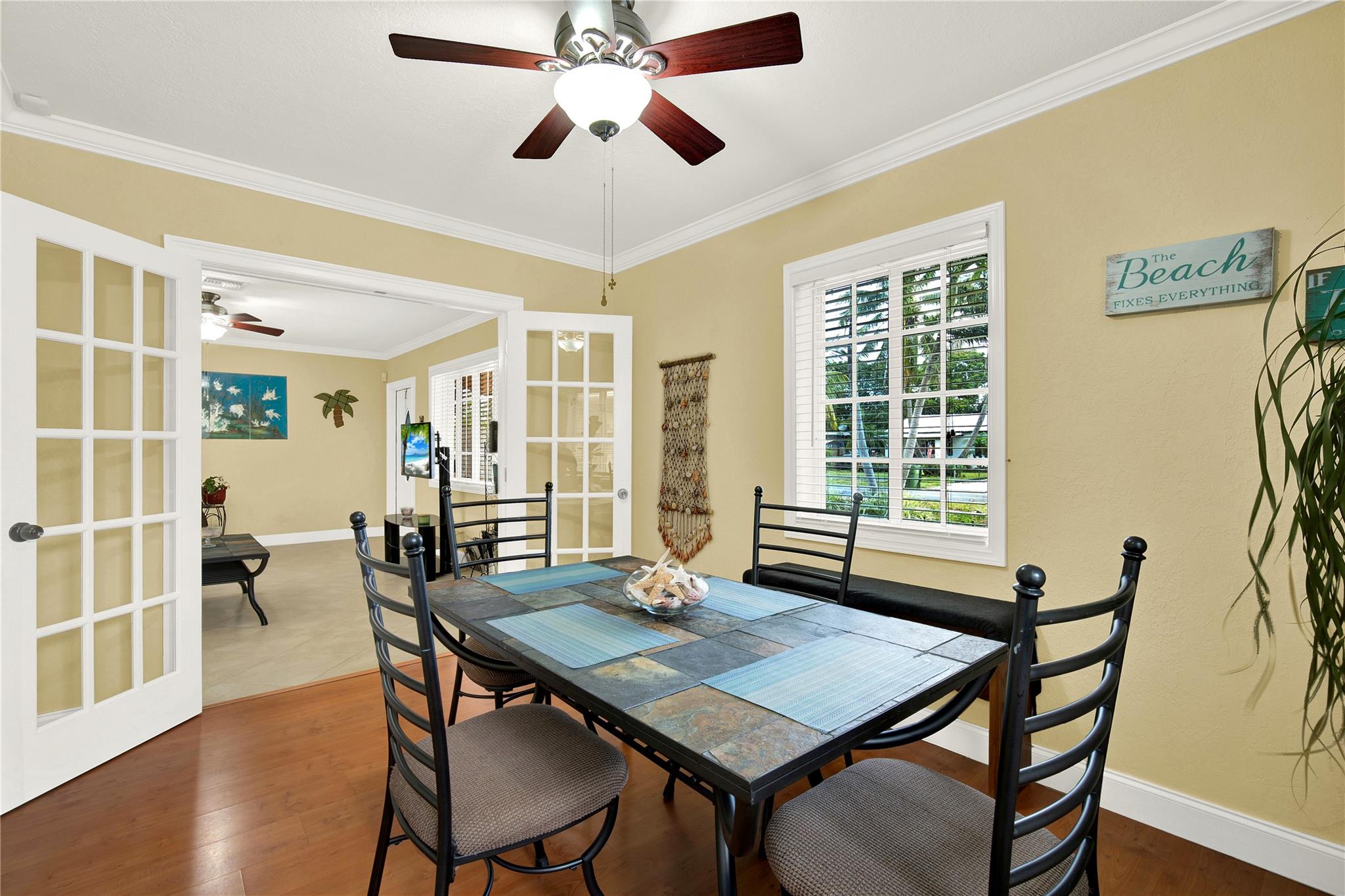 Well-maintained 3 bedroom 2 bath home, built to last with overly spacious rooms that open up with plantation shutter french doors to the large paved back yard, with delightful flowers, fruit trees, and vegetable garden. The home was rebuilt in 2006 with complete new PVC plumbing and updated electrical. Tile Roof replaced in 2016 with custom rain gutters. Pest control insulation in 2023. Master bath has large shower his/hers sinks, kitchen beautifully updated with wood cabinets, granite tops, and walk in pantry/utility with washer and dryer in a closet. The exterior was painted and property fenced in 2022. Property has shutters,motion lighting around the exterior, transferable ADT alarm system, and water irrigation. Perfect blend of modern convenience and cozy charm.