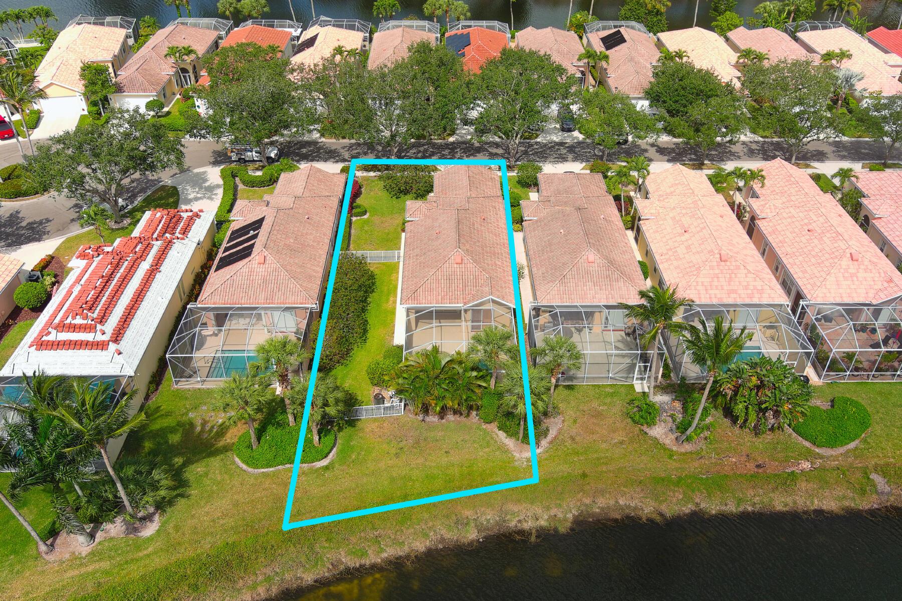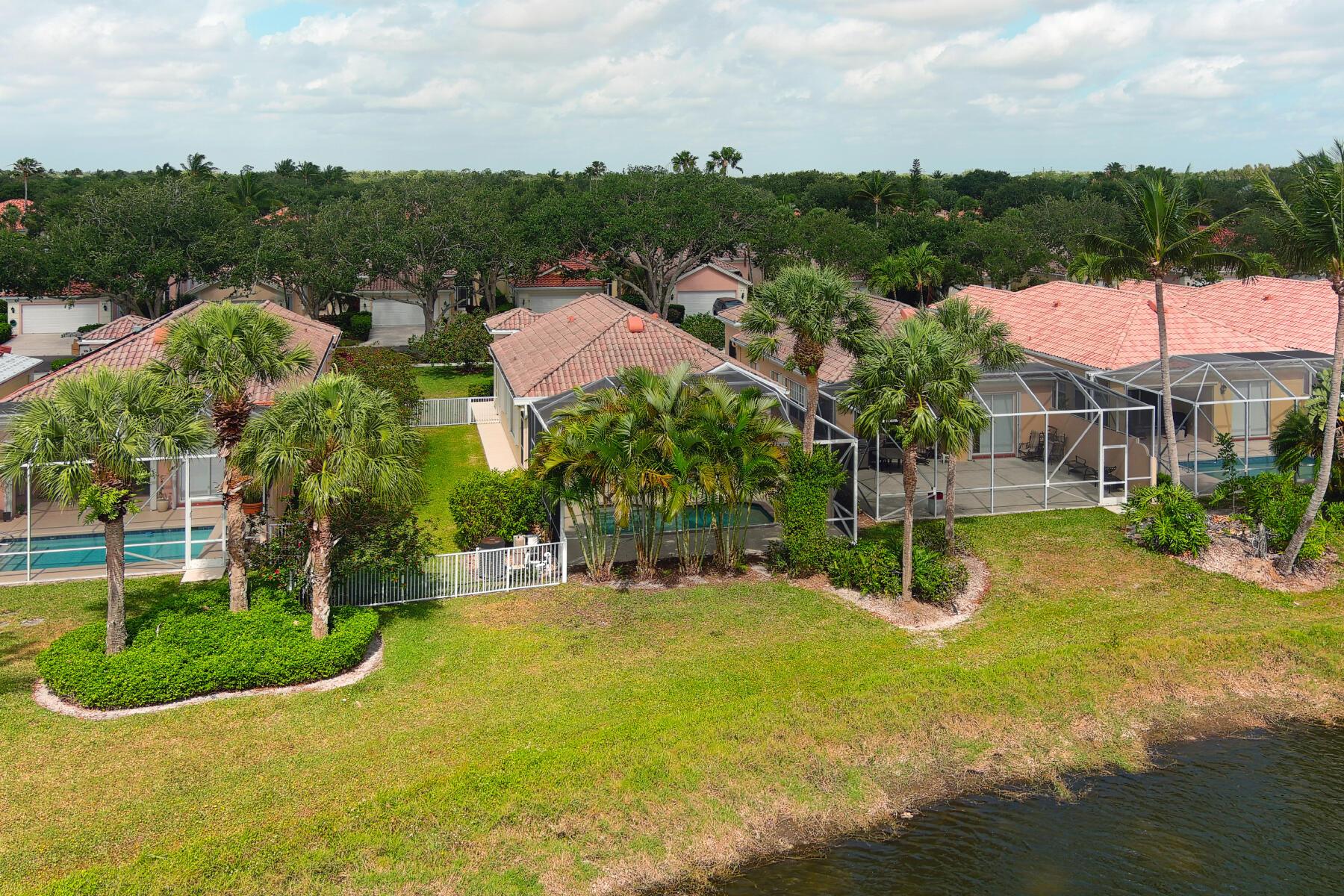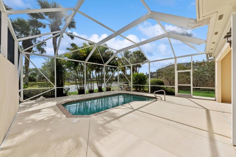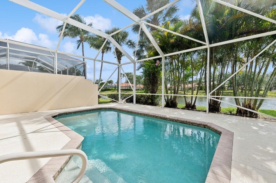 A Rare Opportunity, for One Lucky Buyer, to start with a Blank Canvas & Create a Home that can reflect their Own Personal Taste & Yet have the Foundation be this 3 Bedroom 2 Bath Glenwood Model with a Screened Cage having a Custom Heated Swimming Pool on an Extra Wide Fenced Lakefront Lot (close to 1.5 Times the Normal Size Lot)with Panoramic Views, On a Breathtaking Lakeside Parcel with Unobstructed Views of a Cul de Sac, Common Green Space that borders the Opposite Shoreline; directly behind the Lush Yard, Plus Views, of the Adjoining Lakes with Pedestrian Walkways & Bridges, that go on Forever! There isn't any other home In Riverwalk with these View! The Excitement begins with a Tropically Planted Extra Wide, Broad Lush Lawn leading to an Inviting Screened Entry with a Decorative