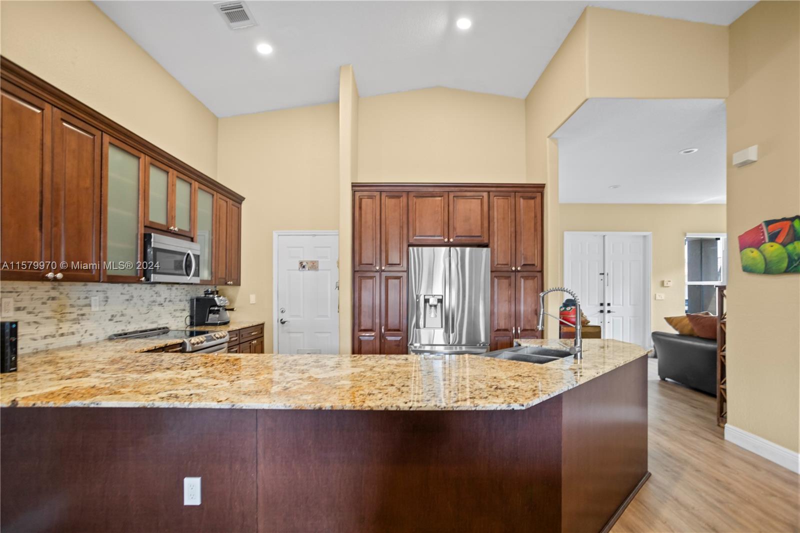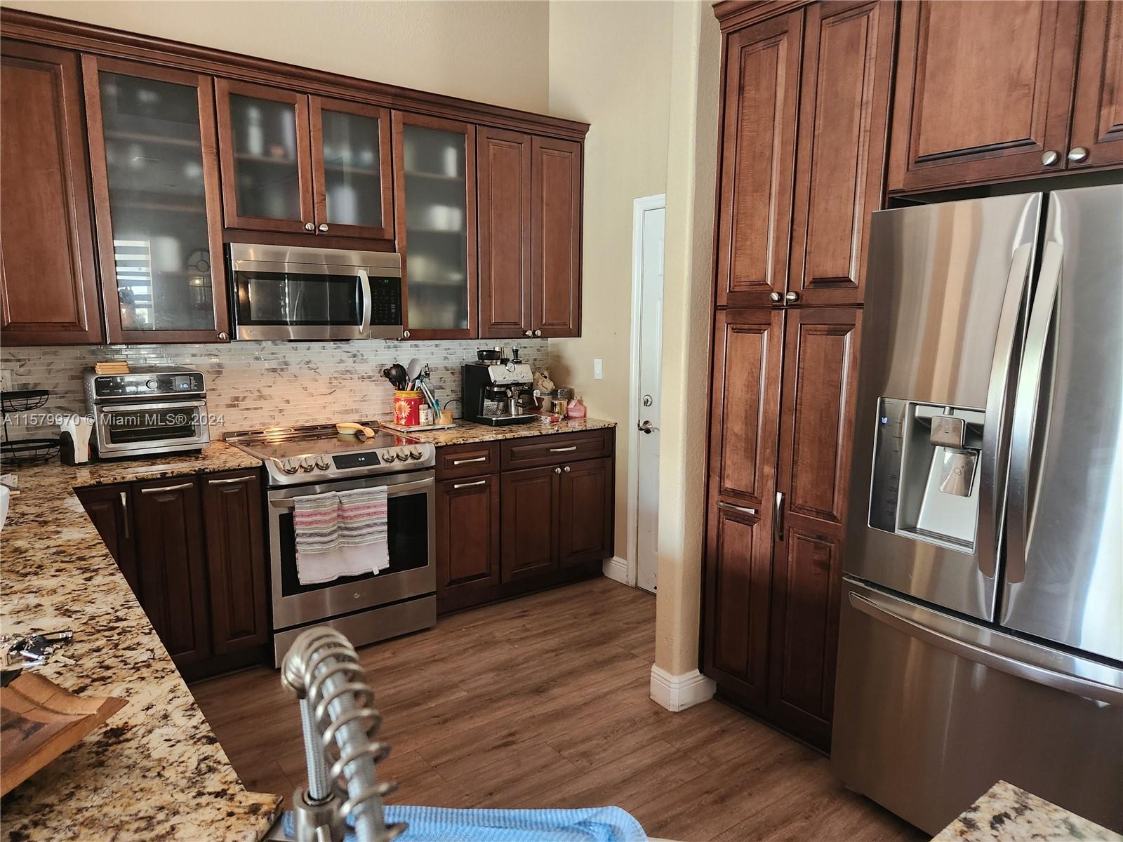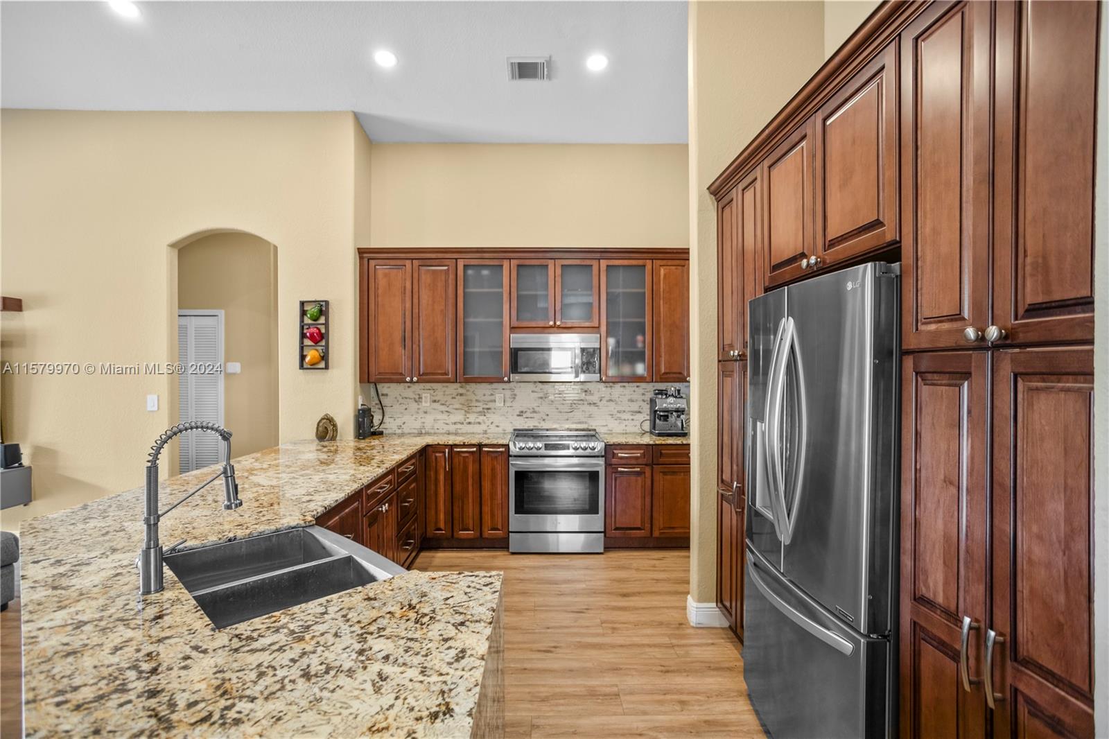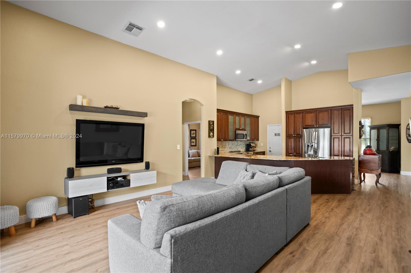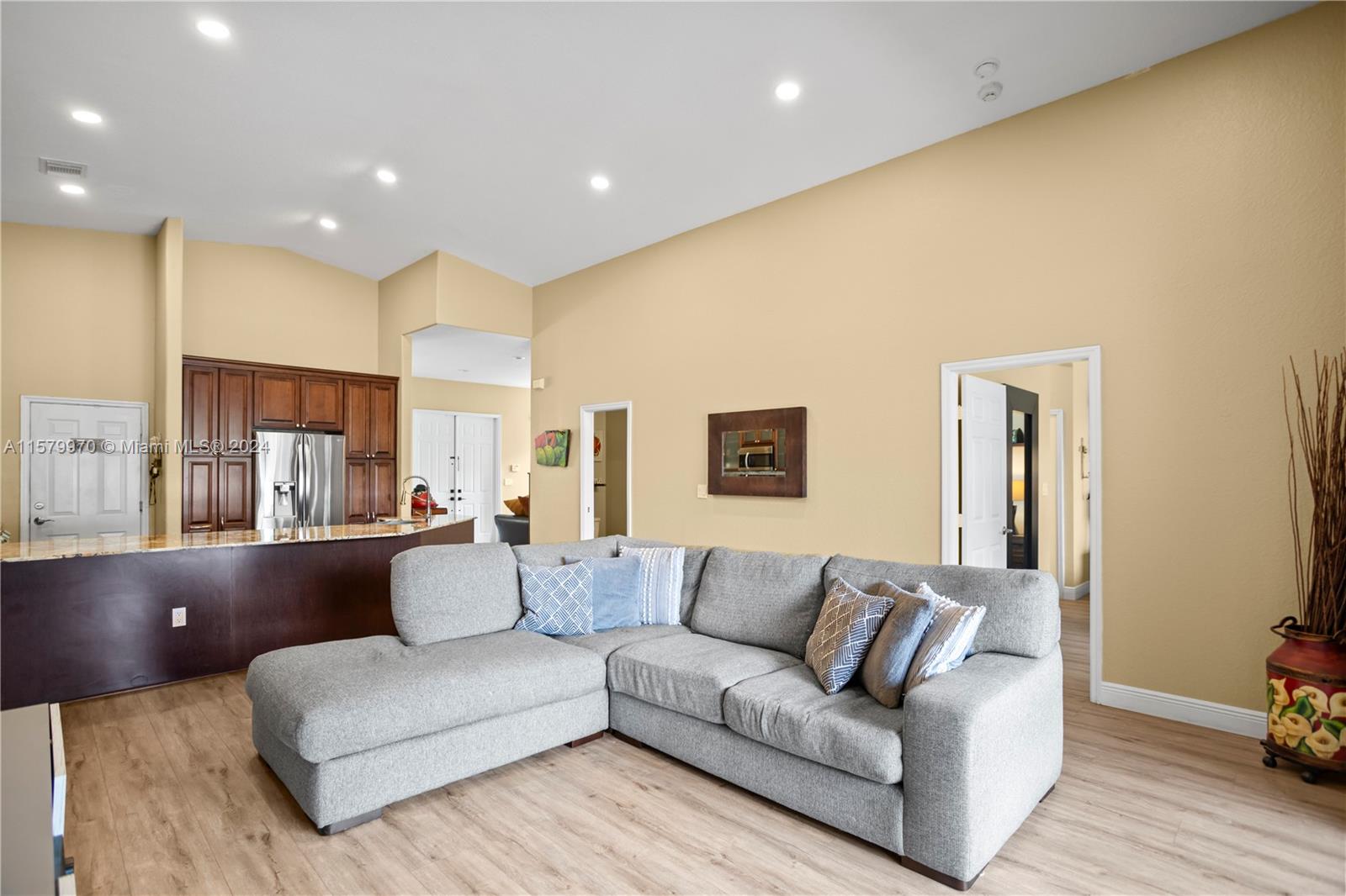 Just bring a toothbrush-move right into this 1 story home in gated community. Open, spacious & completely renovated. Beautiful flooring throughout, gourmet kitchen w/wood cabinets, cabinet pull outs, waterfall countertop & newer stainless appliances- formal living & dining rm & sep large fam room which is great for entertaining. Owners suite w/double closets w/built ins & beautifully upgraded en-suite bath complete w/double sinks, shower & soaking tub. Other home features tankless H2O heater, newer AC, zebra & blackout window treatments, & complete hurricane protection. Enjoy relaxing outside on oversized patio & fully fenced yard w/Avocado tree. Circular paver driveway for extra parking. Gated community, walk to elem school in community, close to shopping and major roads (I-75 & turnpike)