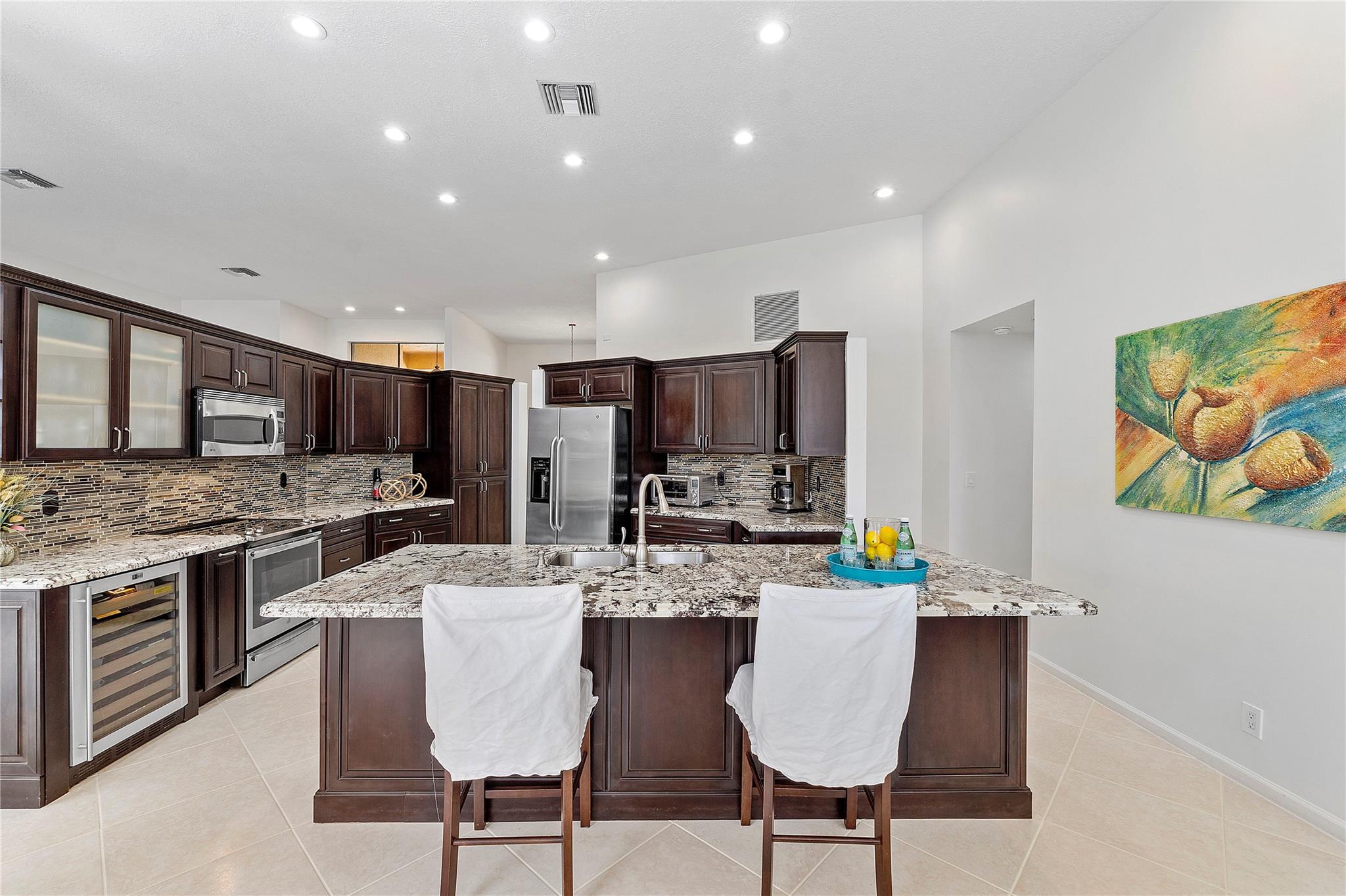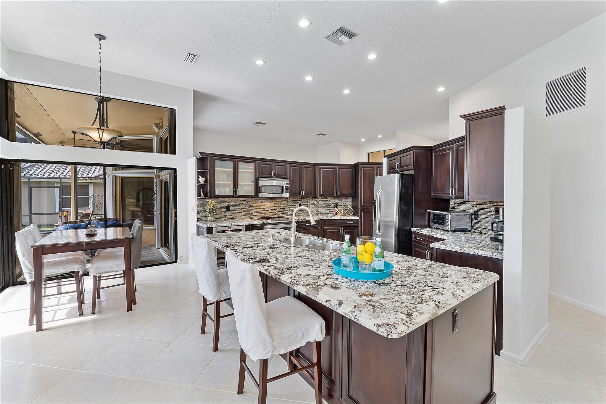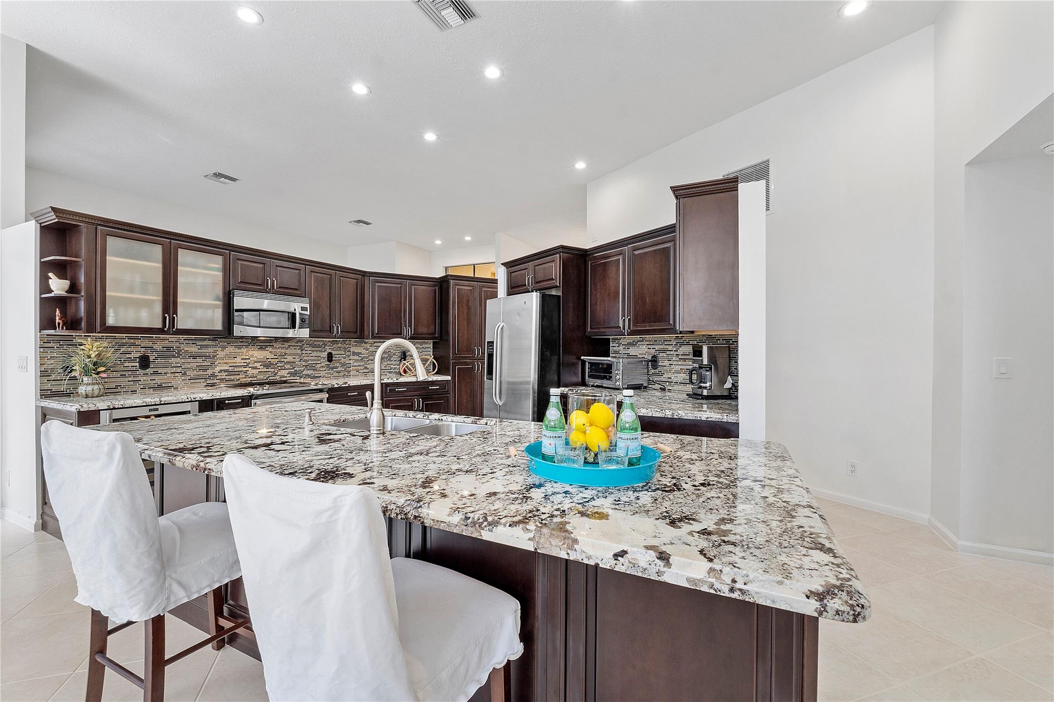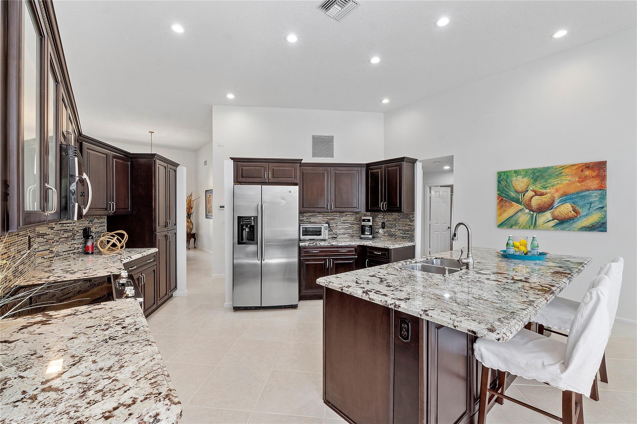 True pride of ownership! Well-maintained, bright, & spacious Brookside Gem! 4-BR, 3-BA, 2-CG, wide-water, screened-pool home w/extended lanai offers an open floor plan w/18 x 18" tile in the living areas & bamboo wood flrs the BRs. Feat: triple-split flr plan, paver DW, accord shut, updated kitch w/built-in wine cooler, SS Appl, Granite count, wood cabinets, & captivating water views from every angle. Updated BAs exude contemporary design. 2024 WH, 2007 S-Tile Roof, no popcorn ceil, 2024 A/C in Primary wing. An abundance of natural light, a large, screened, stamped concrete patio w/a spacious overhang beckons you to savor the breathtaking waterfront & pool views, rain or shine. This home offers the perfect balance of modern luxury & serene outdoor living. A+ Schools!