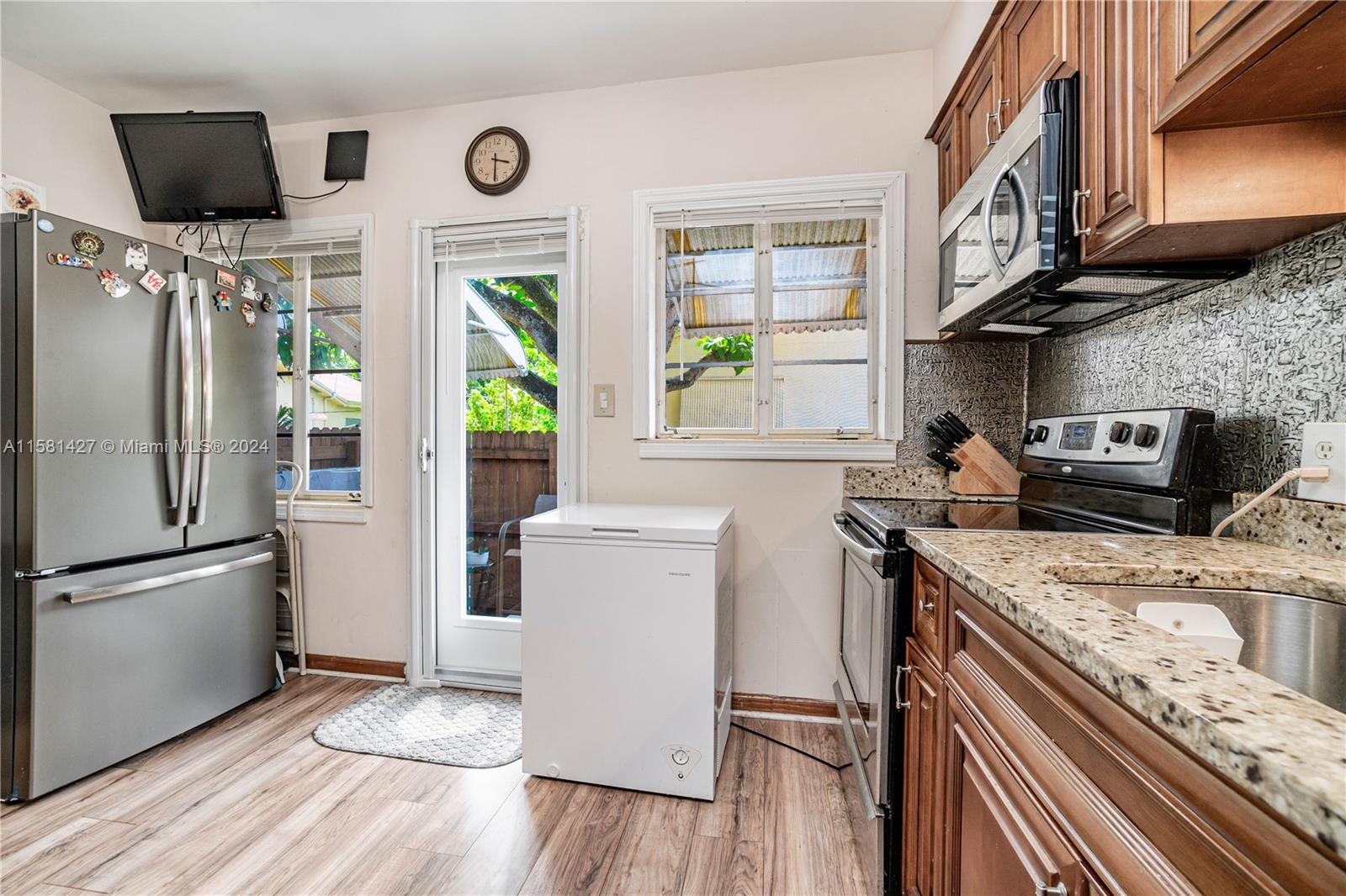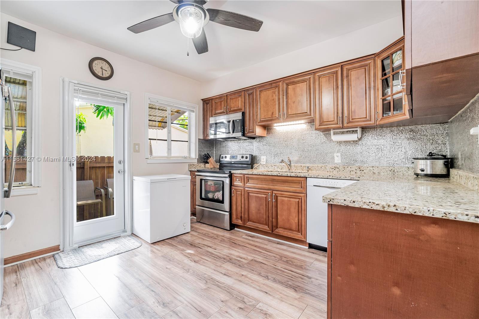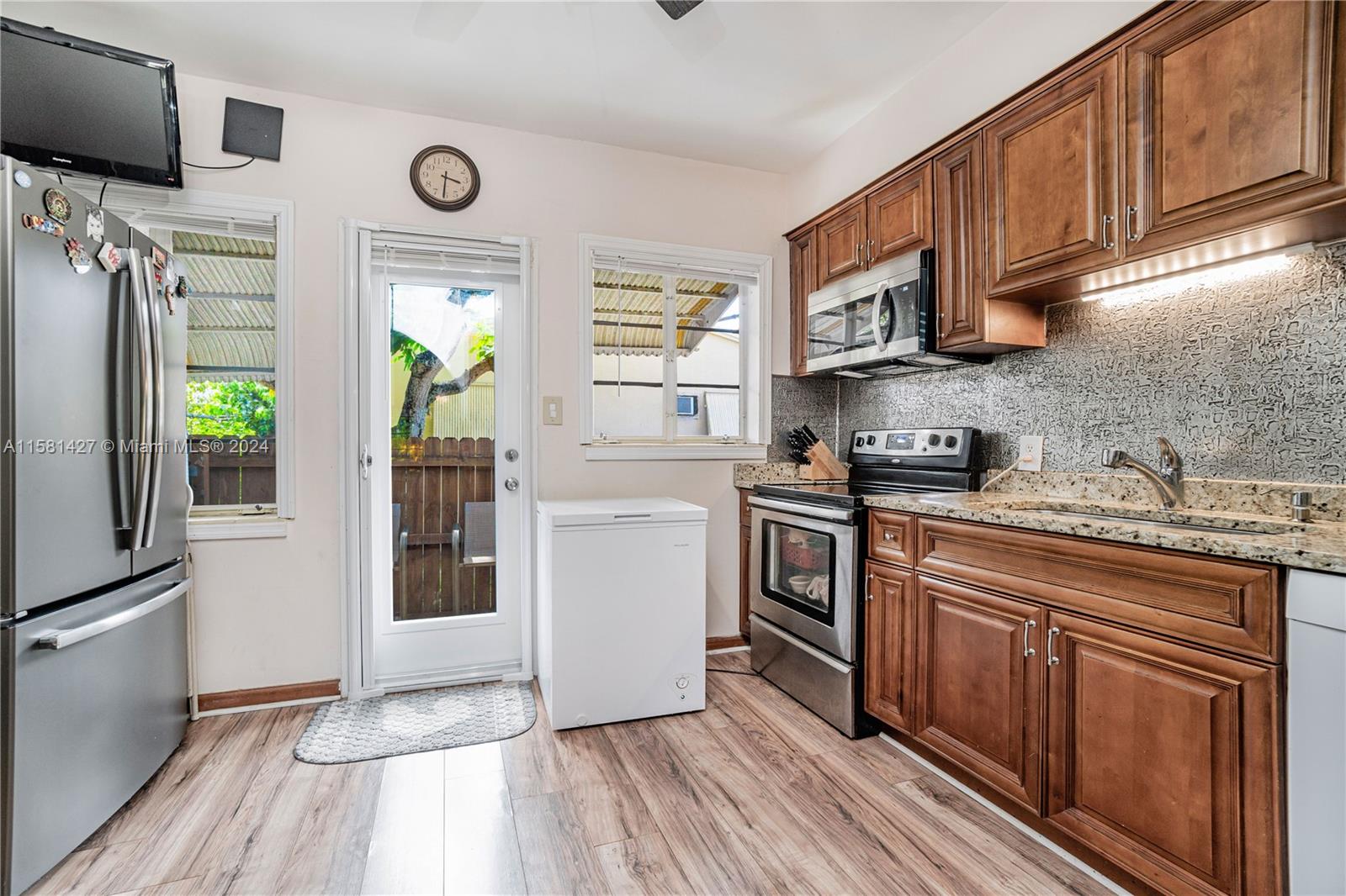 Charming one story half a Duplex featuring 2 BD, 1.5 BA and 960 sq ft of living area sitting in a 3,522 Sq. Ft corner lot and nice size exterior yard. This home has many upgrades including new roof and stone patio in front, fine laminate floors and new vinyl waterproof flooring in kitchen & crown molding in living room, recently painted, spacious and nicely upgraded kitchen with wood cabinets, backsplash and granite counters, new appliances, tankless water heater, upgraded baths with tile floors, new vanities, shower panel in the full bath, LG Washer & Dryer and an outdoor patio. Parking for 2 cars, Water & Sewer are City (no septic). Very well maintained home, it will go fast in a short inventory area with high demand. Great location, close to downtown Hollywood and easy access to I-95.