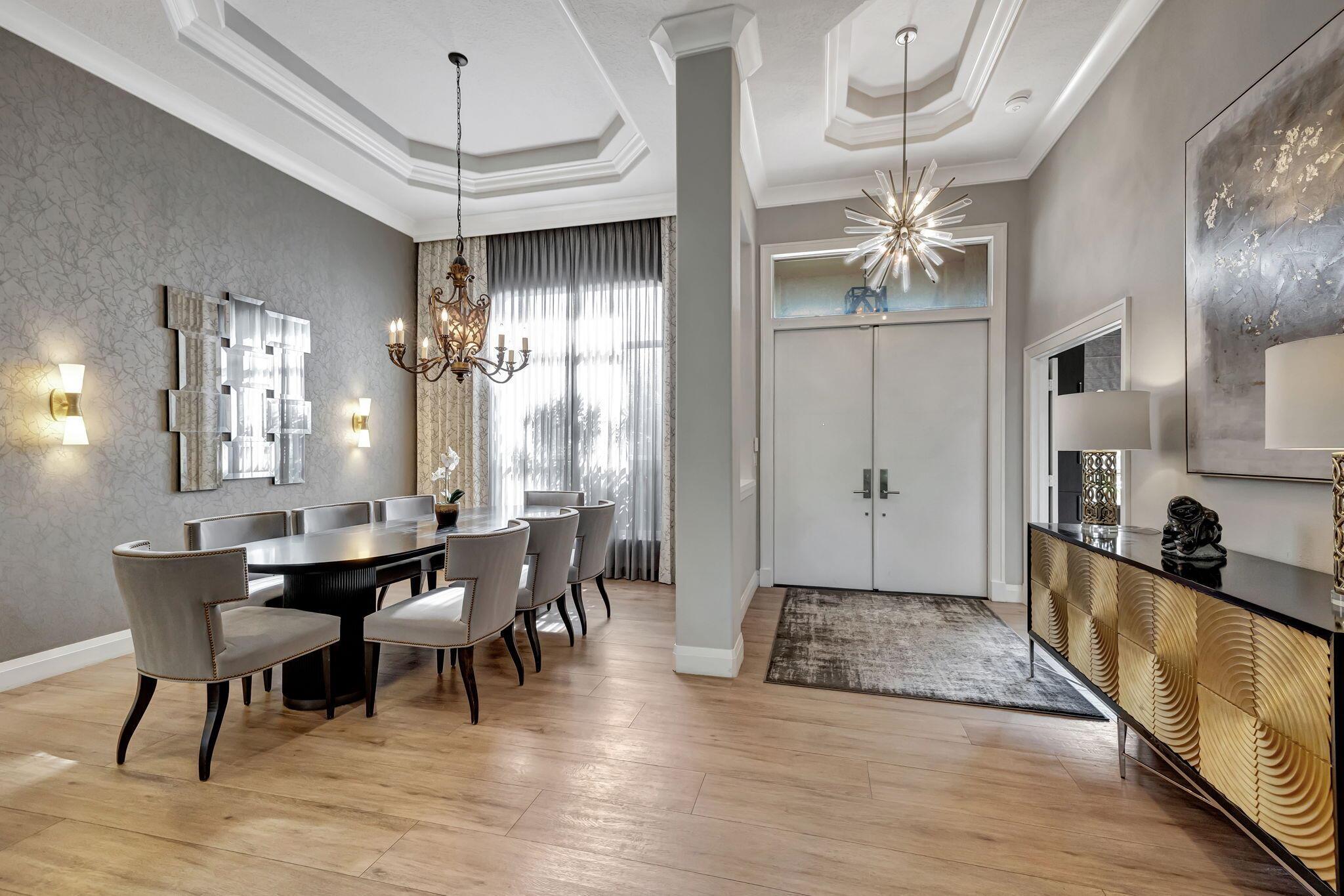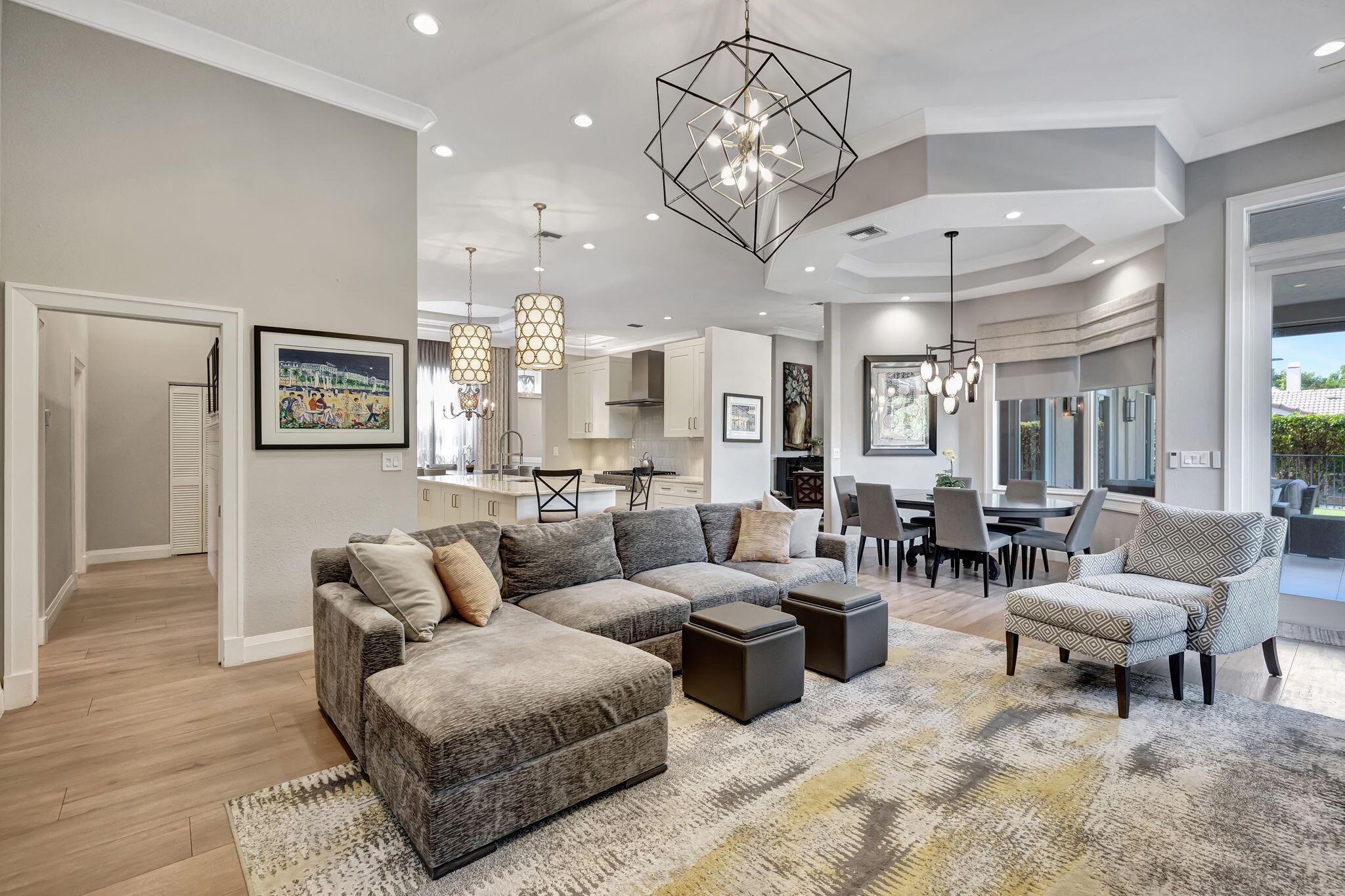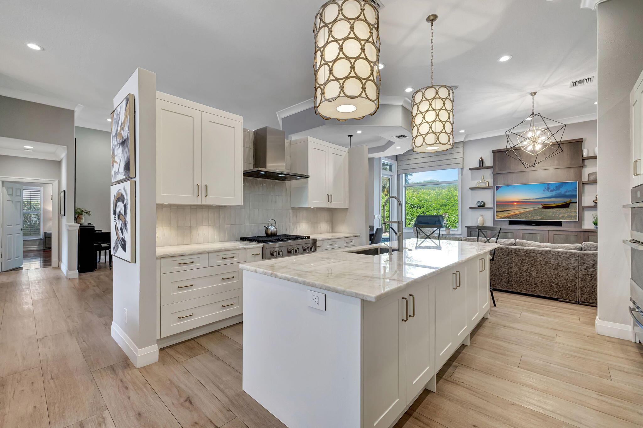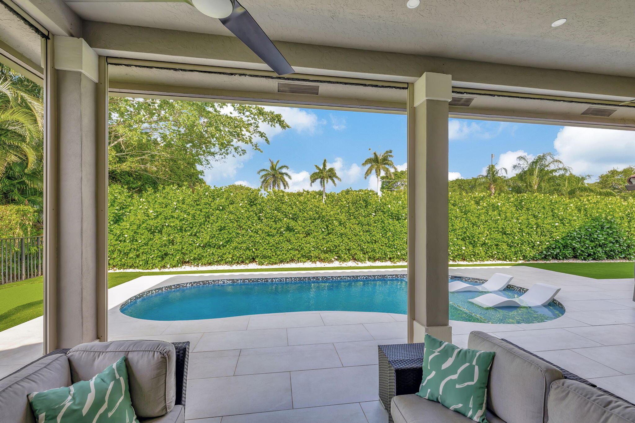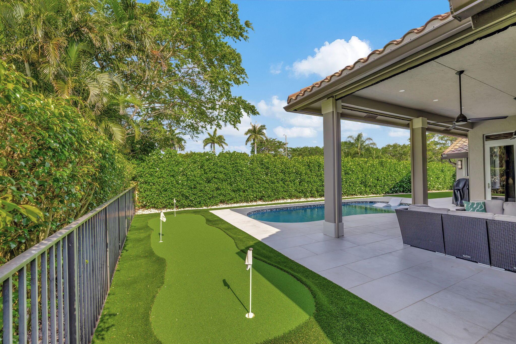 Sophisticated elegance awaits you in the pristine and serene development of Colonnade, perfectly situated in the heart of Boca Raton. This sprawling 5 bedroom, 3.5 bath split floor plan home with 2975 Sq FT is lavishly renovated with porcelain floors, an opulent chef's dream kitchen with Cristallo Premium Natural quartzite counter tops, solid oak self-closing cabinets, top of the line Jenn-Air appliances, and a chic backsplash gives the most visual appeal. The backyard is a relaxing paradise with new pool, porcelain tile, motorized screens, new landscaping, and a putting green for a outdoor entertaining. The primary bedroom is spacious with two walk-in closets and large primary bath with separate shower and spa tub with gorgeous solid oak cabinets.