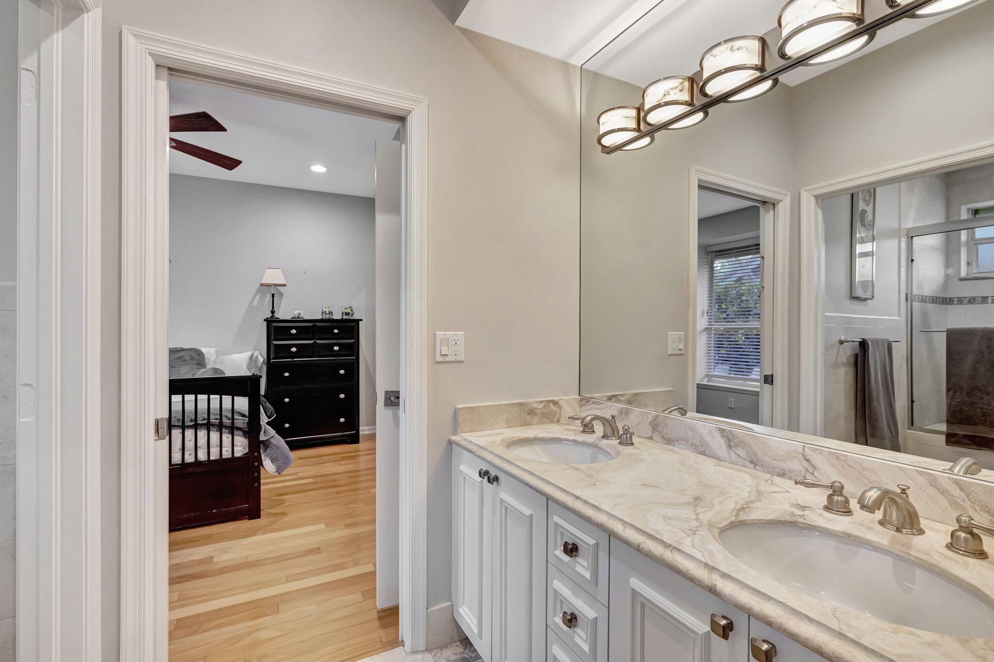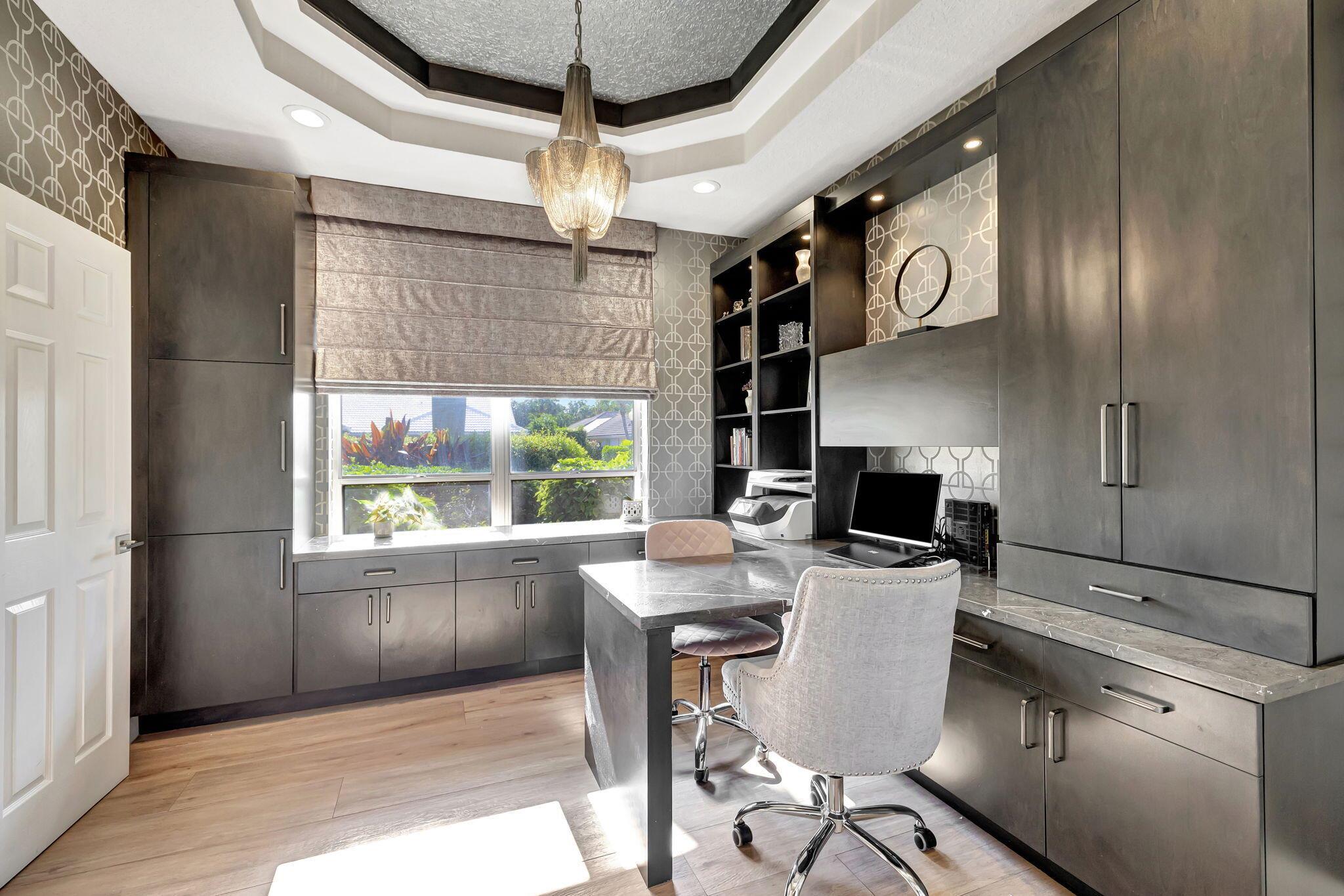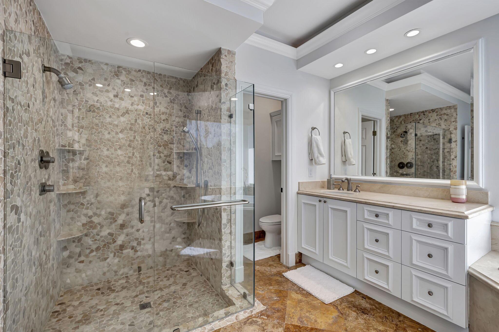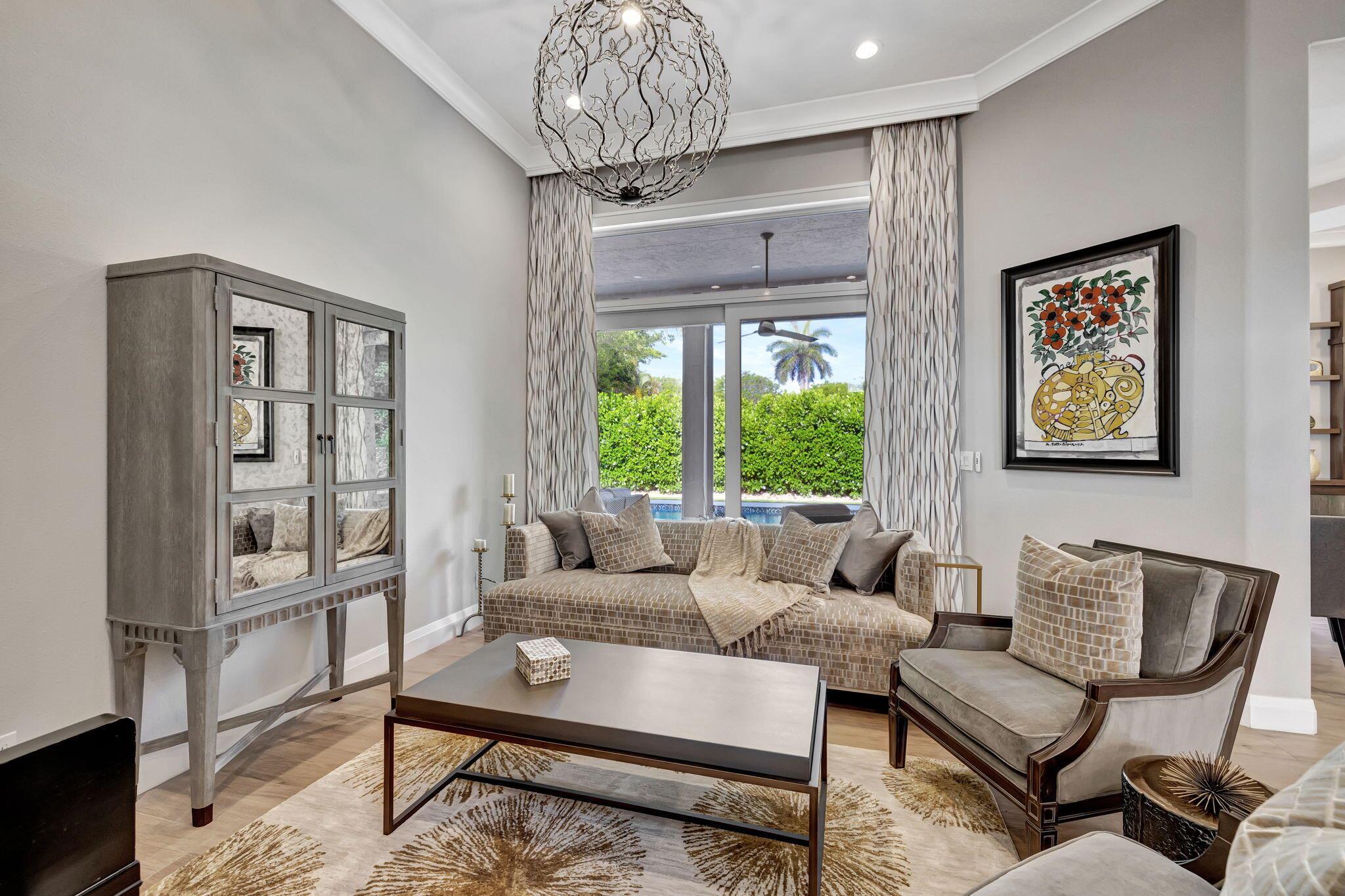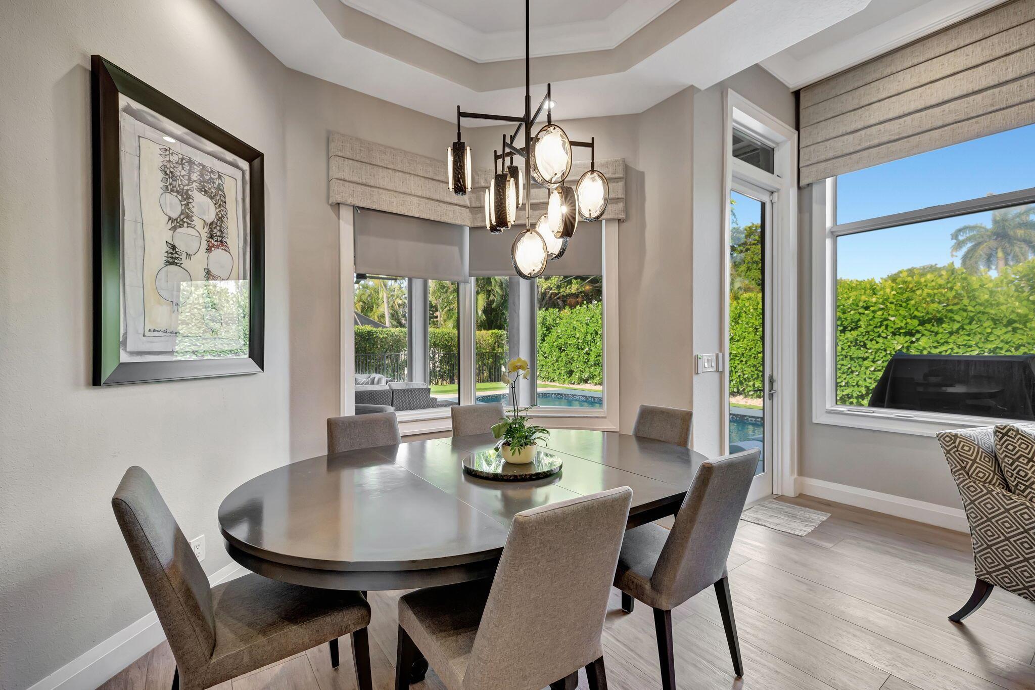 Sophisticated elegance awaits you in the pristine and serene development of Colonnade, perfectly situated in the heart of Boca Raton. This sprawling 5 bedroom, 3.5 bath split floor plan home with 2975 Sq FT is lavishly renovated with porcelain floors, an opulent chef's dream kitchen with Cristallo Premium Natural quartzite counter tops, solid oak self-closing cabinets, top of the line Jenn-Air appliances, and a chic backsplash gives the most visual appeal. The backyard is a relaxing paradise with new pool, porcelain tile, motorized screens, new landscaping, and a putting green for a outdoor entertaining. The primary bedroom is spacious with two walk-in closets and large primary bath with separate shower and spa tub with gorgeous solid oak cabinets.