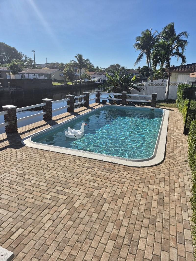 3bed 2bath split-floor plan house, waterfront with pool, large screened-in real roof patio for entertaining. High elevation at 8.17ft, very low risk of flooding. Clopay Canyon Ridge insulated 17ft garage door, with new tracks and liftmaster wall motor. Solid glued-down bamboo flooring in all bedrooms The kitchen and bathrooms need updating, but you get to install what you want. My Save Florida home program is available for hurricane windows.