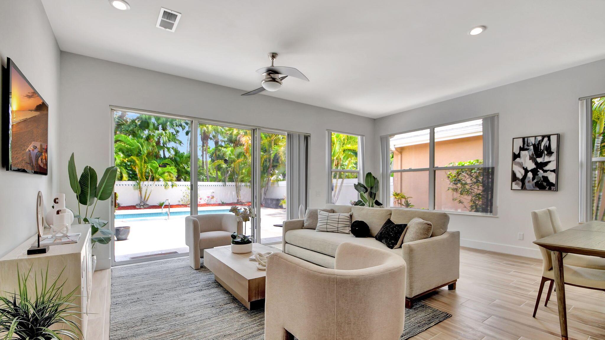 Elegant remodeled single-story home with PRIVATE POOL and impeccable craftsmanship throughout! This stunning residence is ideal for today's contemporary lifestyle and features 3 bedrooms, including a beautiful master suite, 2 full bathrooms, 2 car garage, gourmet kitchen, brand new impact windows and doors to be installed . Designed and decorated to perfection, this expansive open floor plan is adorned with tons of natural light, stunning Woodville tile floors, sparkling modern fixtures and built-in LED lighting. Breathtaking gourmet kitchen reimagined and suitable for a culinary chef! Perfectly equipped with an abundance of custom cabinetry that extends to breakfast area, waterfall design Ibiza Quartz counter tops, top-of-the-line stainless steel appliances include oversized refrigerat