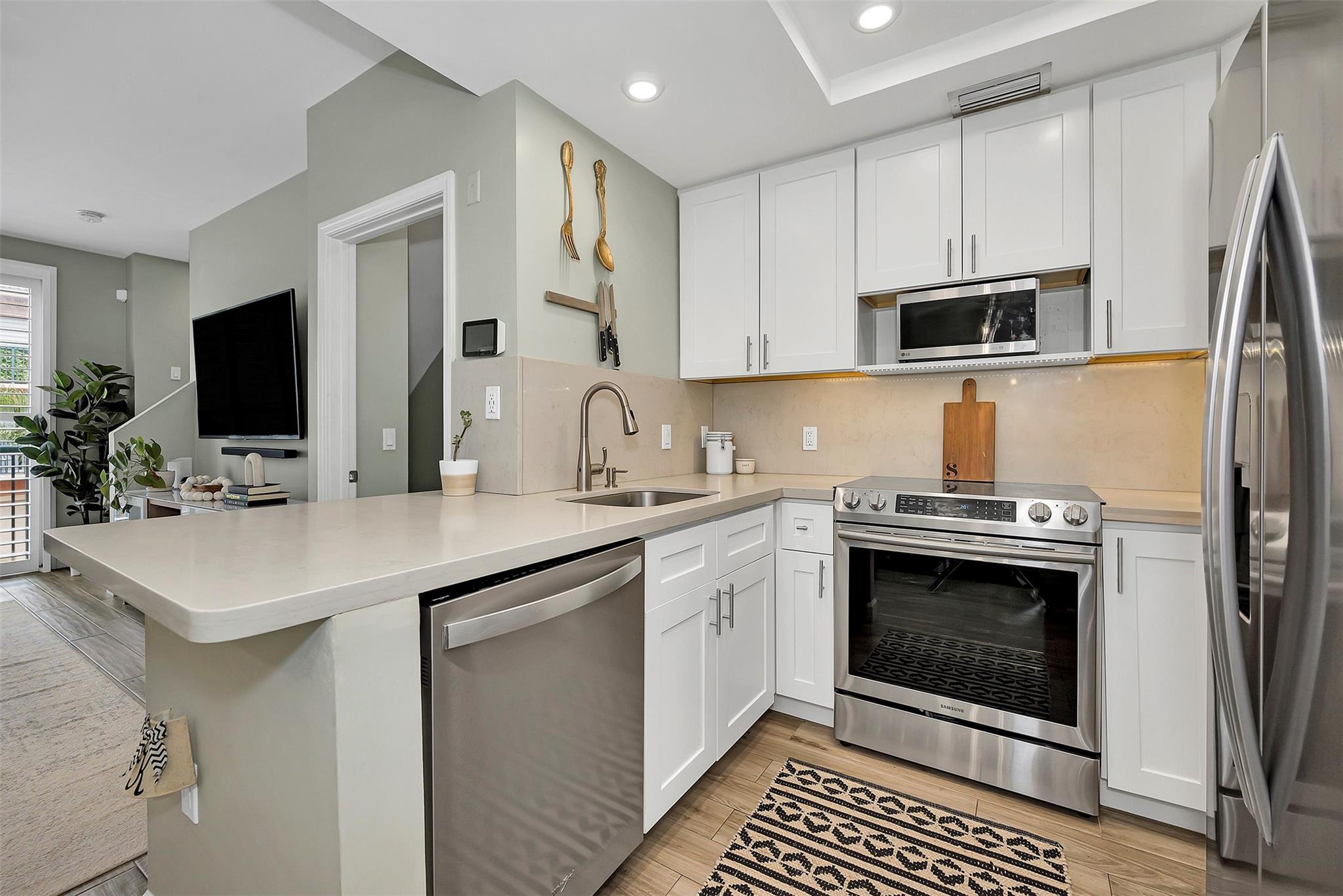Nestled in the secure Village East community, this fully renovated 1BR/1BA tri-level townhouse is a must-see. Featuring stylish plantation shutters, the open main floor includes a contemporary kitchen with quartz countertops and high-end stainless steel appliances. The expansive third-floor primary suite boasts a newly updated bathroom with marble floors and shower, as well as quartz countertops and a generous walk-in closet. For your convenience, the home comes with a new washer, dryer, and water heater. Enjoy the added benefit of a private garage. Walking distance to grocery stores, restaurants, and shops, and just a short drive to Las Olas, the beach, and FLL airport. Community features include a pool, gym, and business center. Available furnished.