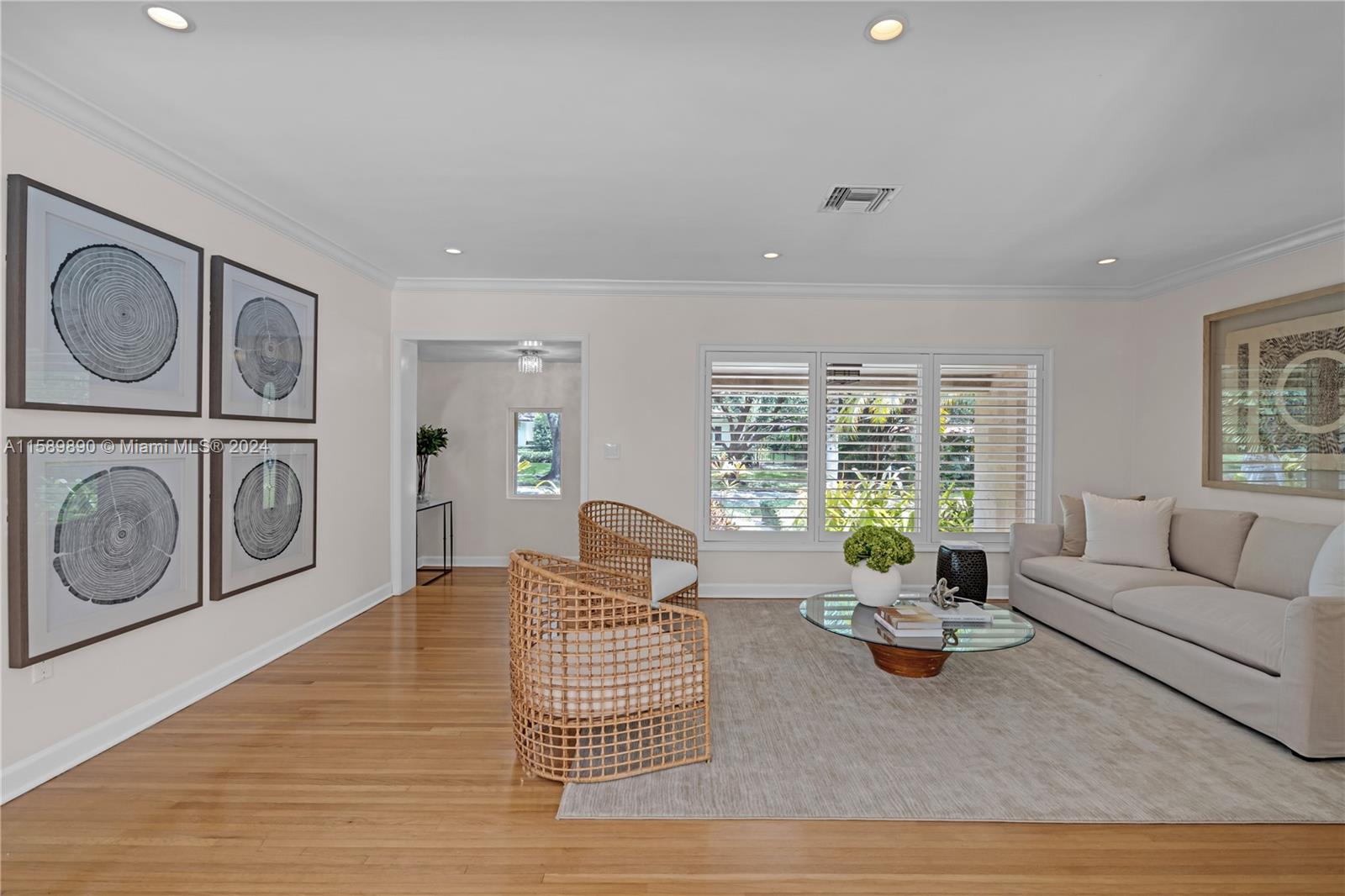 Located on a lovely tree lined street, this home invites you to enjoy a blend of formality and functionality. Formal foyer entry, large living and dining rooms with views of the pool and patio. Beautifully finished hardwood floors throughout the living areas and bedrooms. Well-designed open kitchen with granite counters, white wood cabinetry, and kitchen Aid appliances opens to the oversized family room with access to the pool and terrace. Each of the spacious bedrooms offers beautifully built-out closets. The primary bedroom has two large built-out closets, updated bathroom and shower. A second bedroom has newly updated bath-en-suite. New roof, insulated & air-conditioned 2 car garage, impact windows & doors and security system all enhance this very special Coral Gables home.