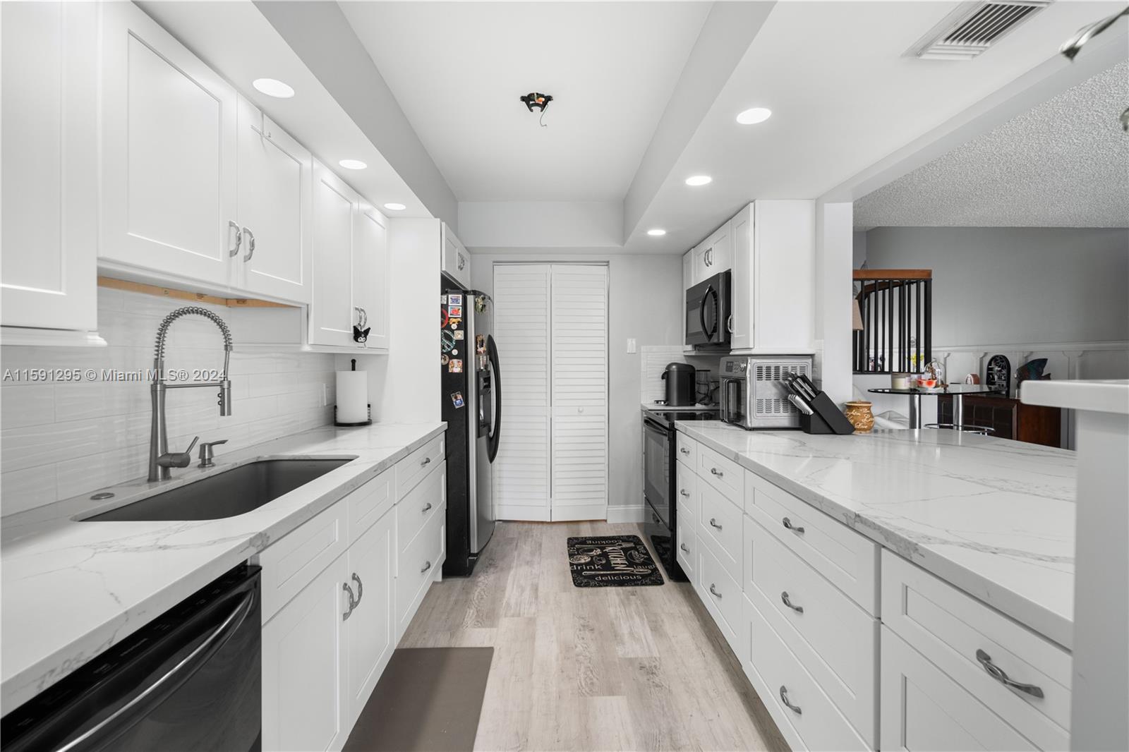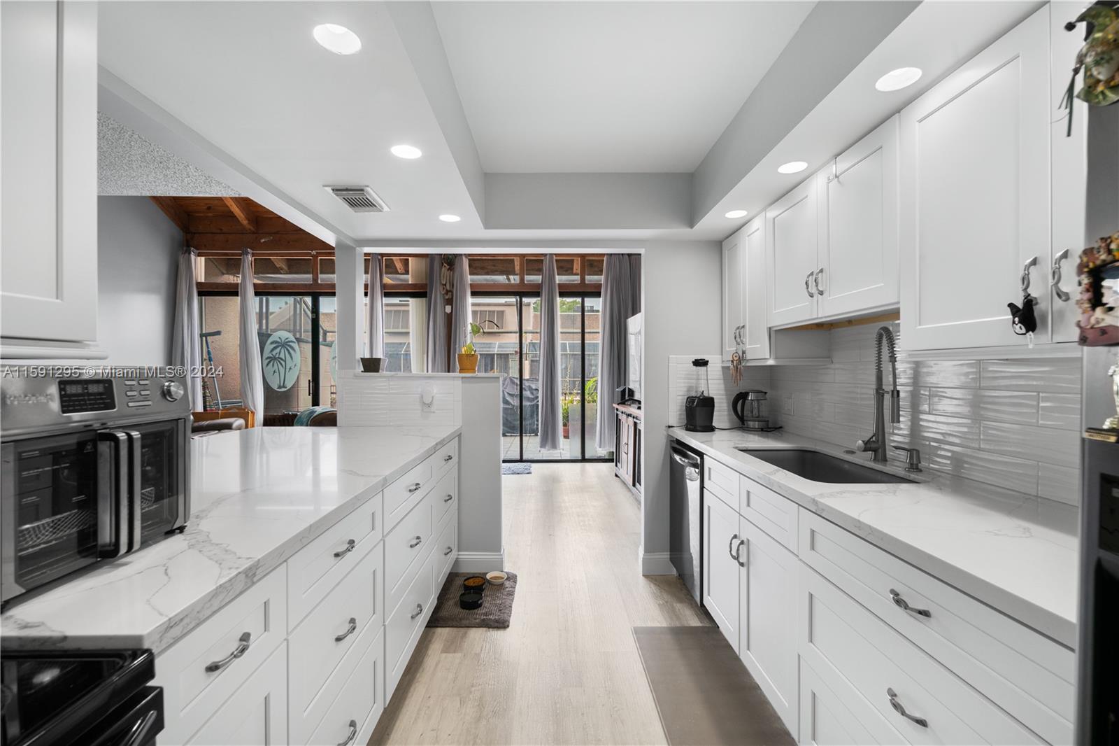 COME TOUR THIS BEAUTIFULLY RENOVATED CORNER TOWNHOME on the canal in the gated community of Flamingo Villas! Brand new white kitchen with quartz counter tops and stainless steel appliances. 3 bed 3 full bath. Large walk in pantry next to the kitchen. 2 assigned parking spots. Vaulted ceilings! Plenty of guest parking. You can rent right away one time a year. 2 pets allowed per unit. No min credit score. Easy to show. Call listing agent. No application fee or approvals. New plumbing, new floors, 3 new bathrooms, new front door, new fans, new dishwasher Open House Sunday 5/26 10:00am-12:00pm. RSVP to LA for gate access. All information is deemed to be correct but no guarantees. Buyer and/or buyer's agent to verify.