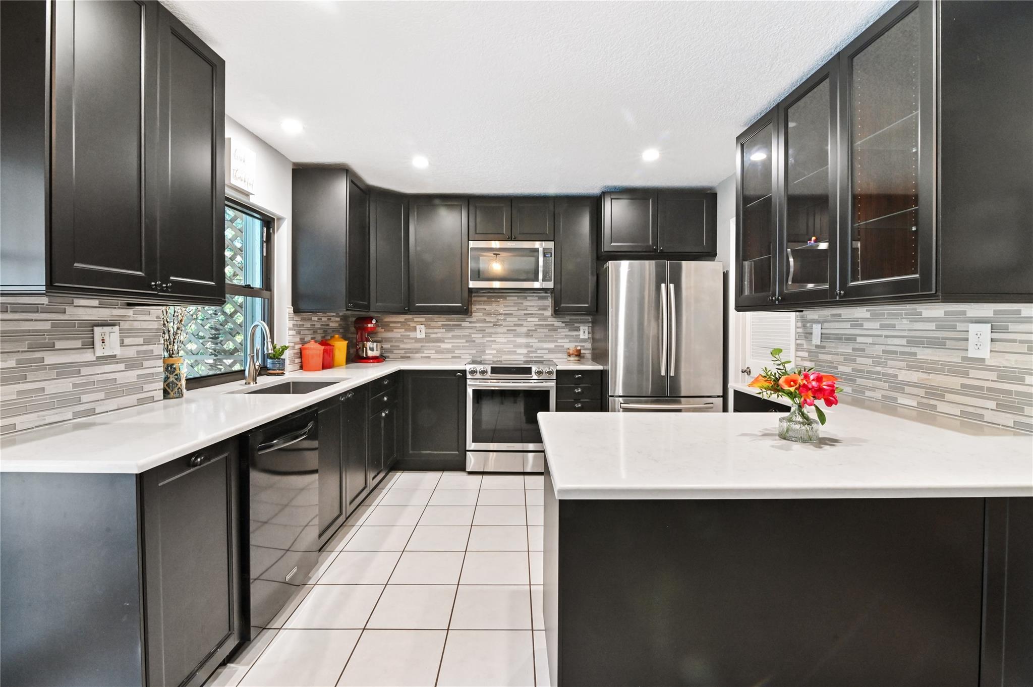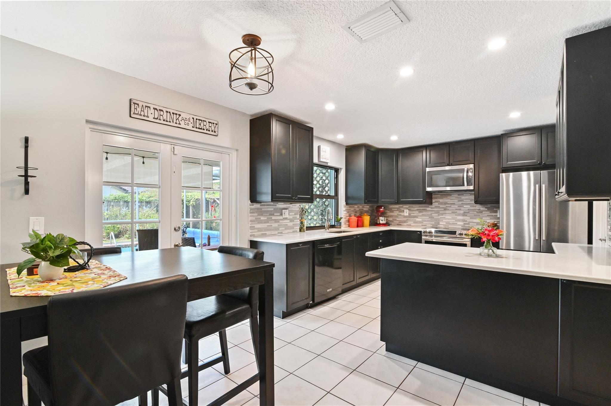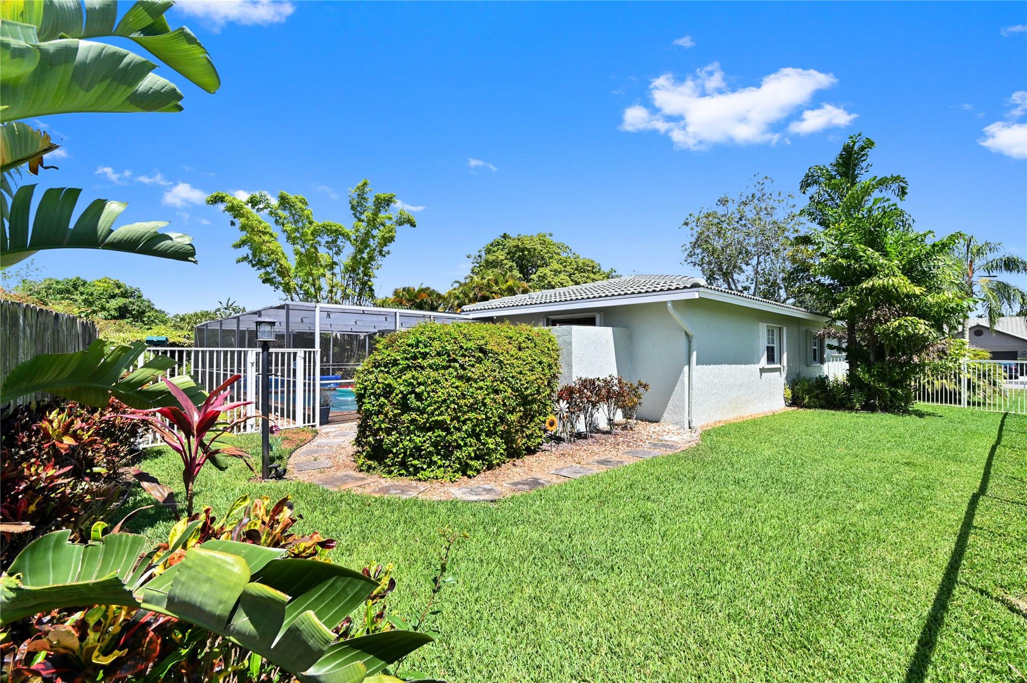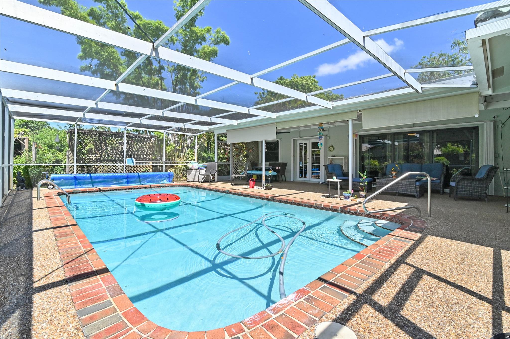Brand new roof being installed on this beautiful 3 bdrm 2 bath sparkling pool and patio oasis fully screened with 2 car garage! This move-in ready gem offers wood kitchen cabinets,quartz counters,s/s appliances, smooth top range, built in micro,High Hat lighting,indoor utility rm w/pantry. Family room flows out to pool/patio with impact sliding glass doors. Fenced in dog run area off pool. Large primary suite w/walk-in closet impact sliding glass door. Primary cabana bath has shower only and impact door & window. Two generous secondary bedrooms with good size closets. Knockdown ceilings thru-out. Impact entry door and hurricane shutters thru-out. Located on over a quarter acre lot. Freshly painted exterior. Don't miss your chance to make this dream home yours! No HOA!