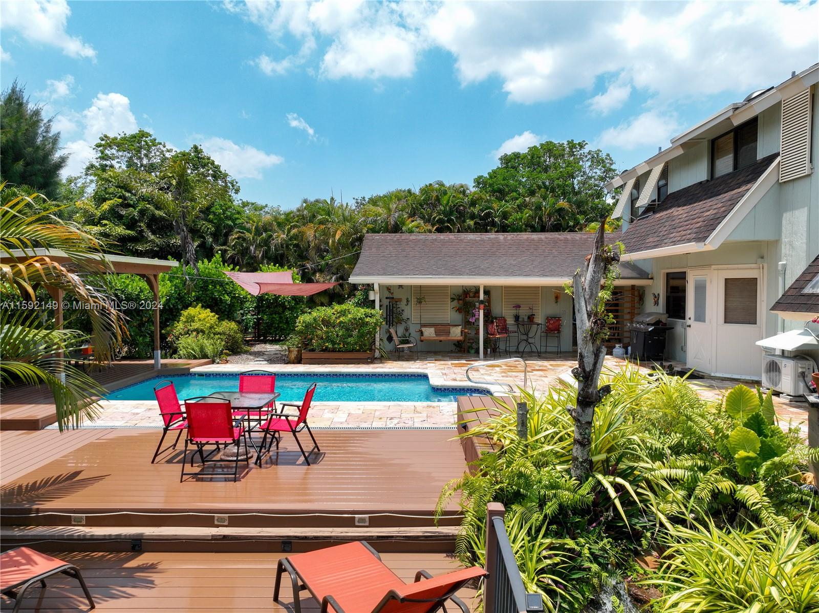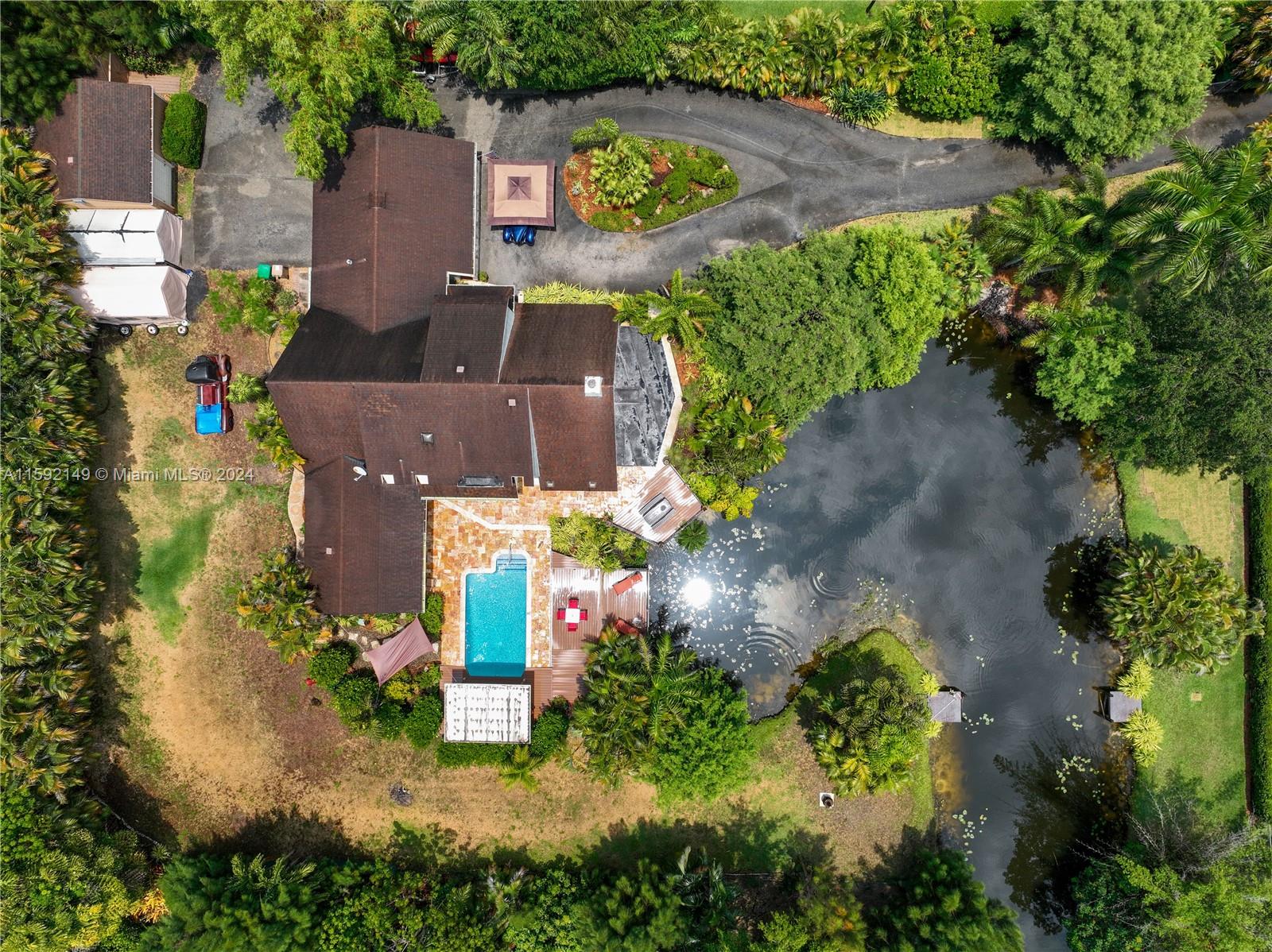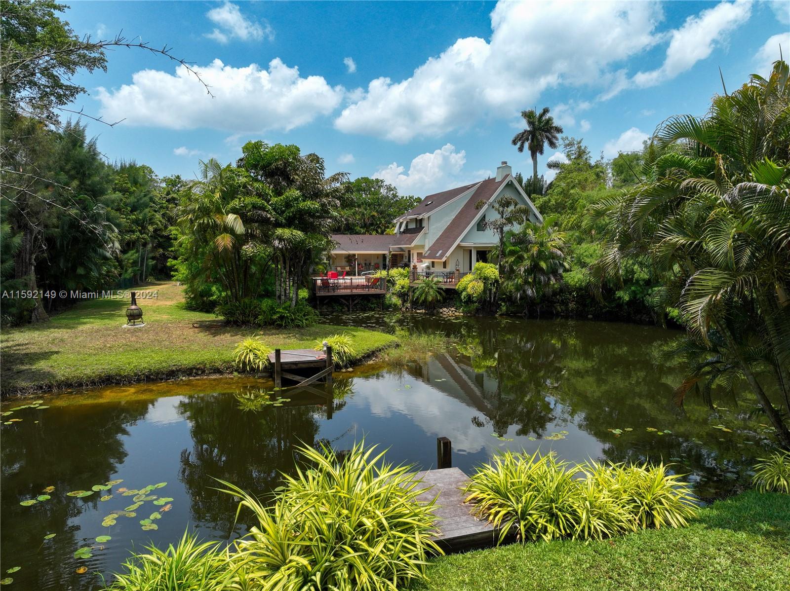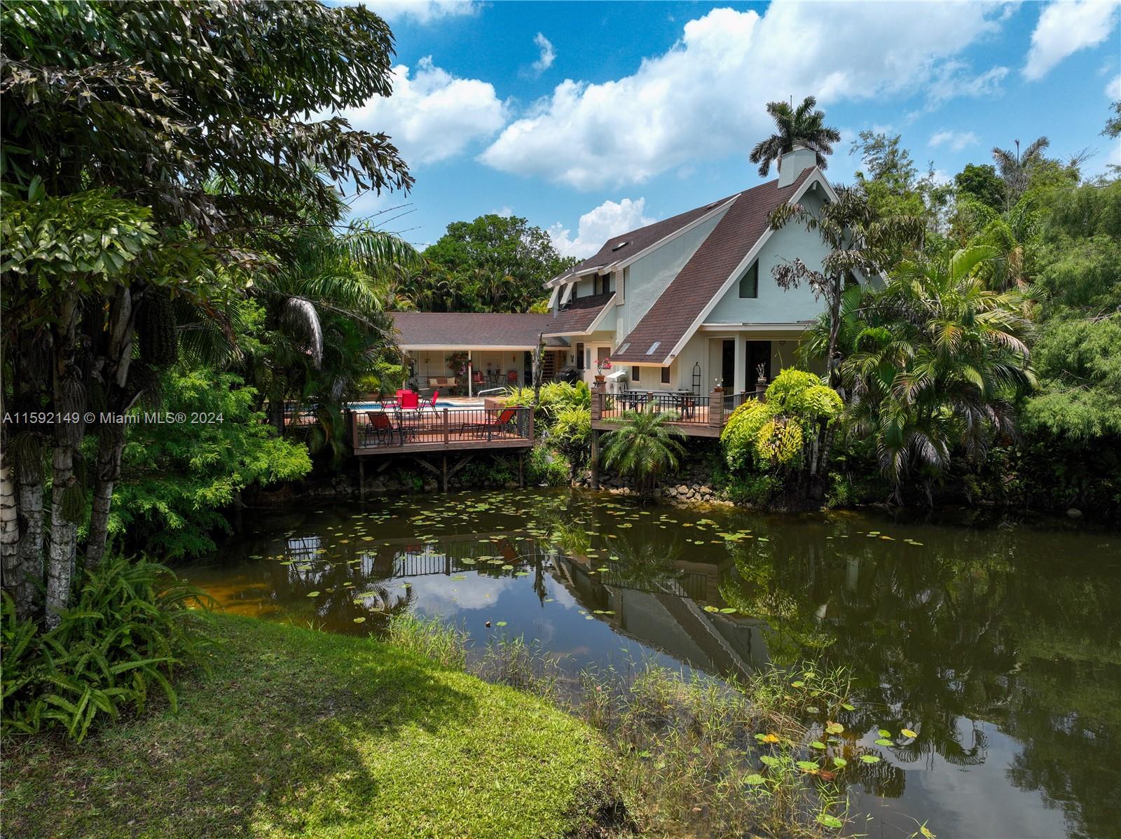 Welcome to your dream home! This beautiful custom-built 2-story, 4-bedroom, 2.5-bath home is nestled in a secluded neighborhood of custom homes on acre-plus lots with NO HOA. Move-in ready and located on a quiet dead-end street, the property boasts lush landscaping, a private pond, a pool, patio, and decks. A bonus cabana building by the pool could serve as a future in-law suite. Remodeled in 2005 with high-end finishes like custom wood cabinetry, granite countertops, and quality tile, the home offers an open living/dining area with vaulted ceilings, a fireplace, and custom shutters. The master suite includes a spa-like bathroom with a large shower. Recent upgrades include a new washer, dryer, water heater, sprinkler pump, cooktop, and exterior paint. This home is a must-see!