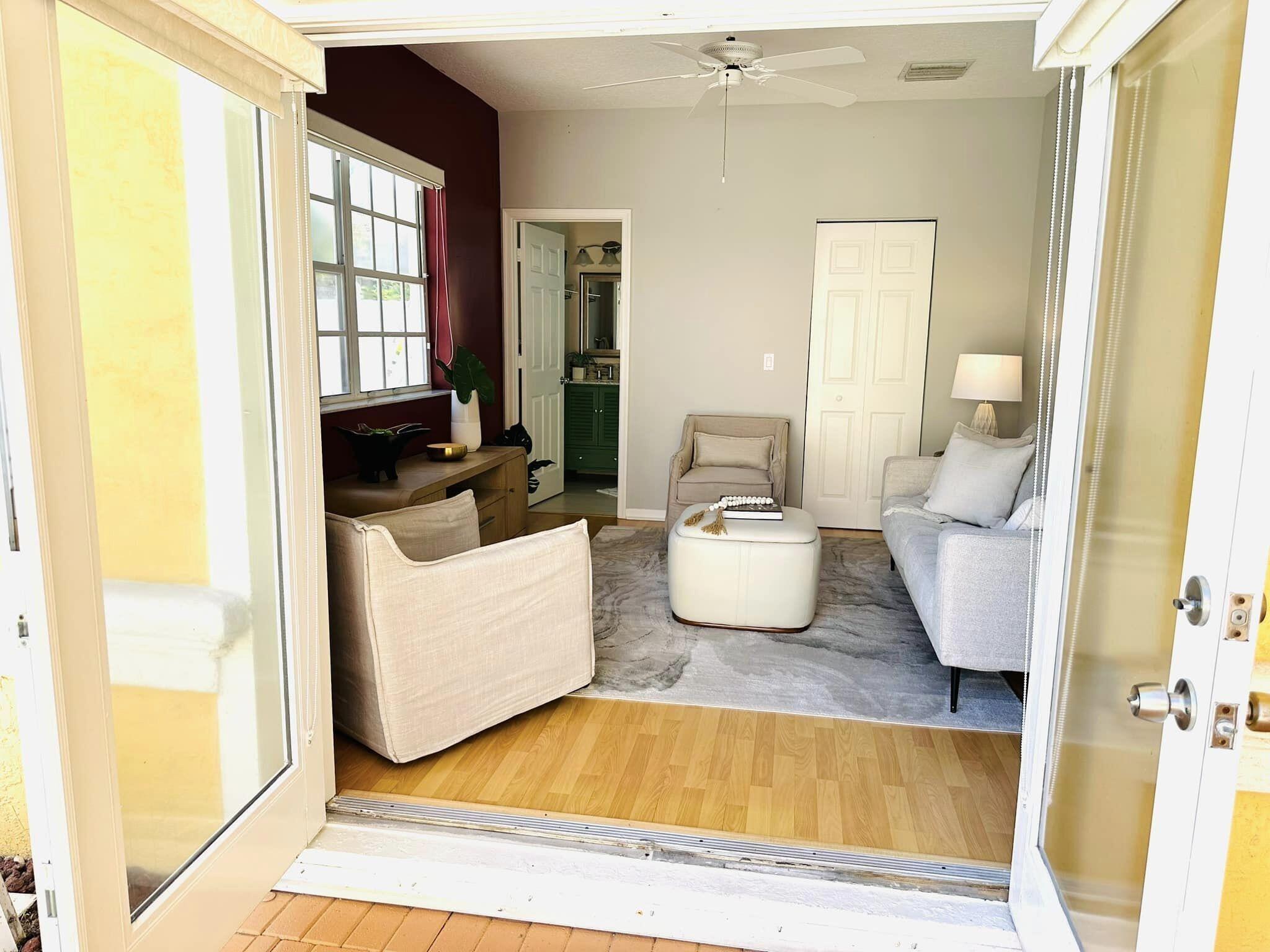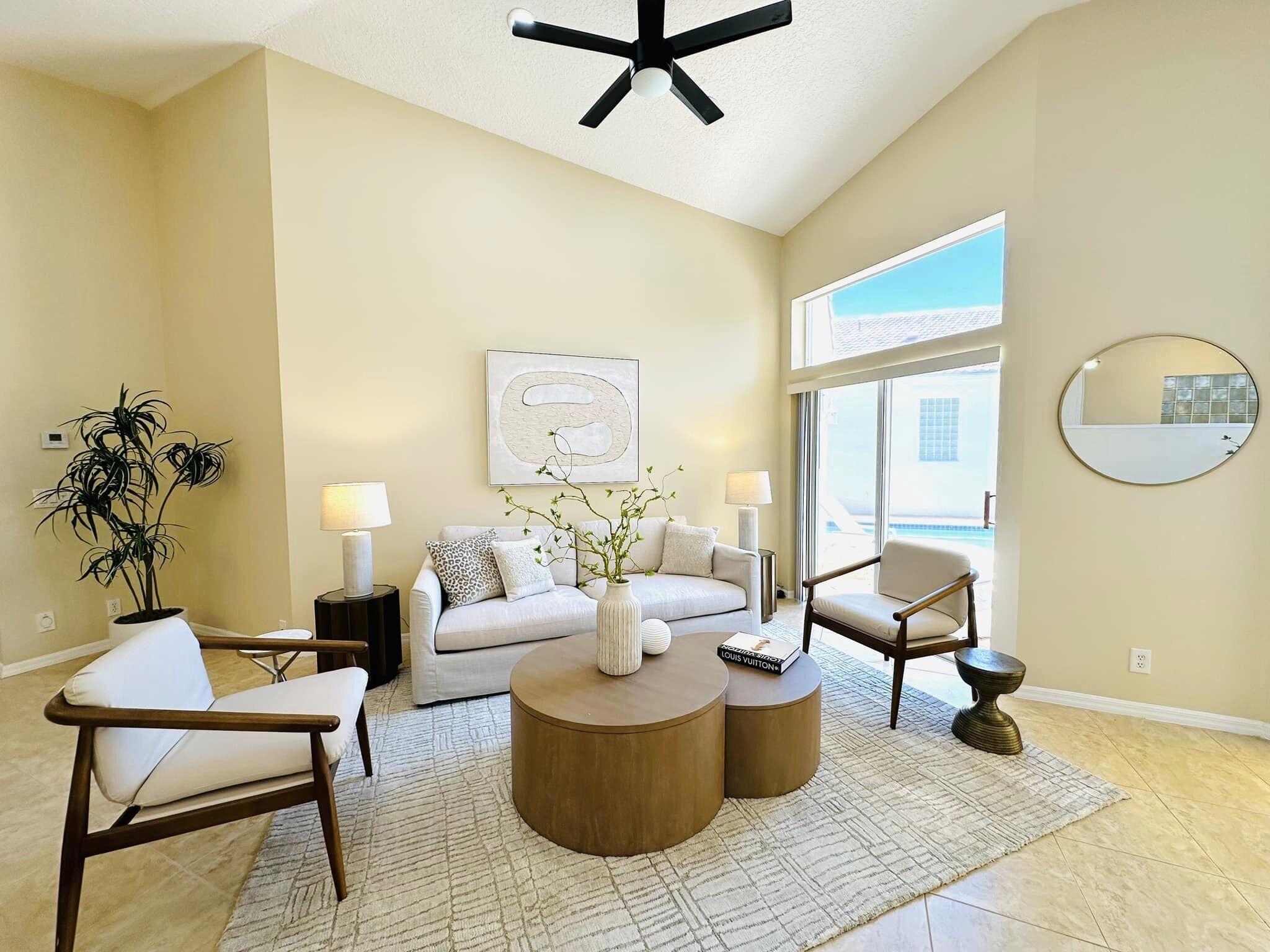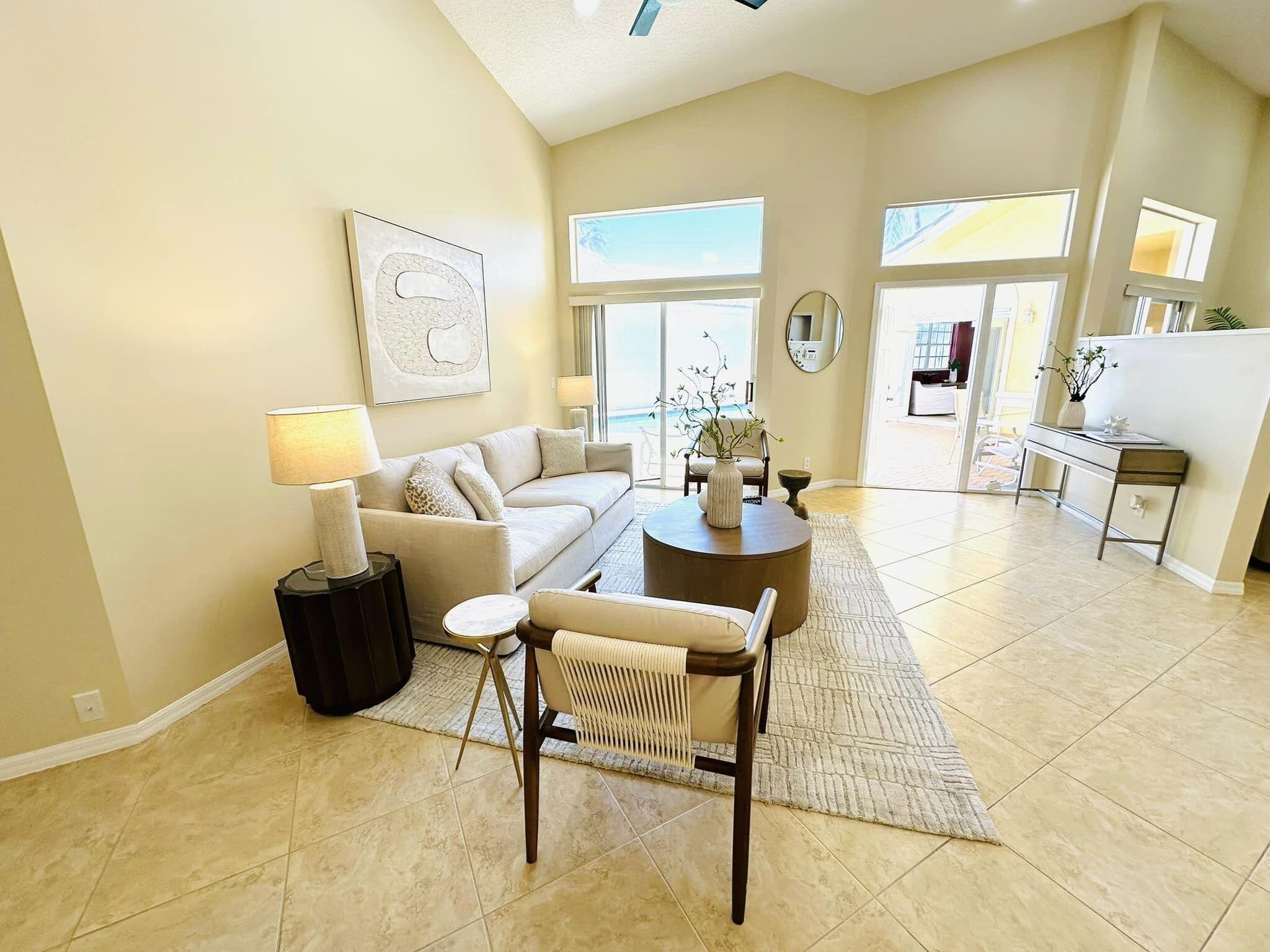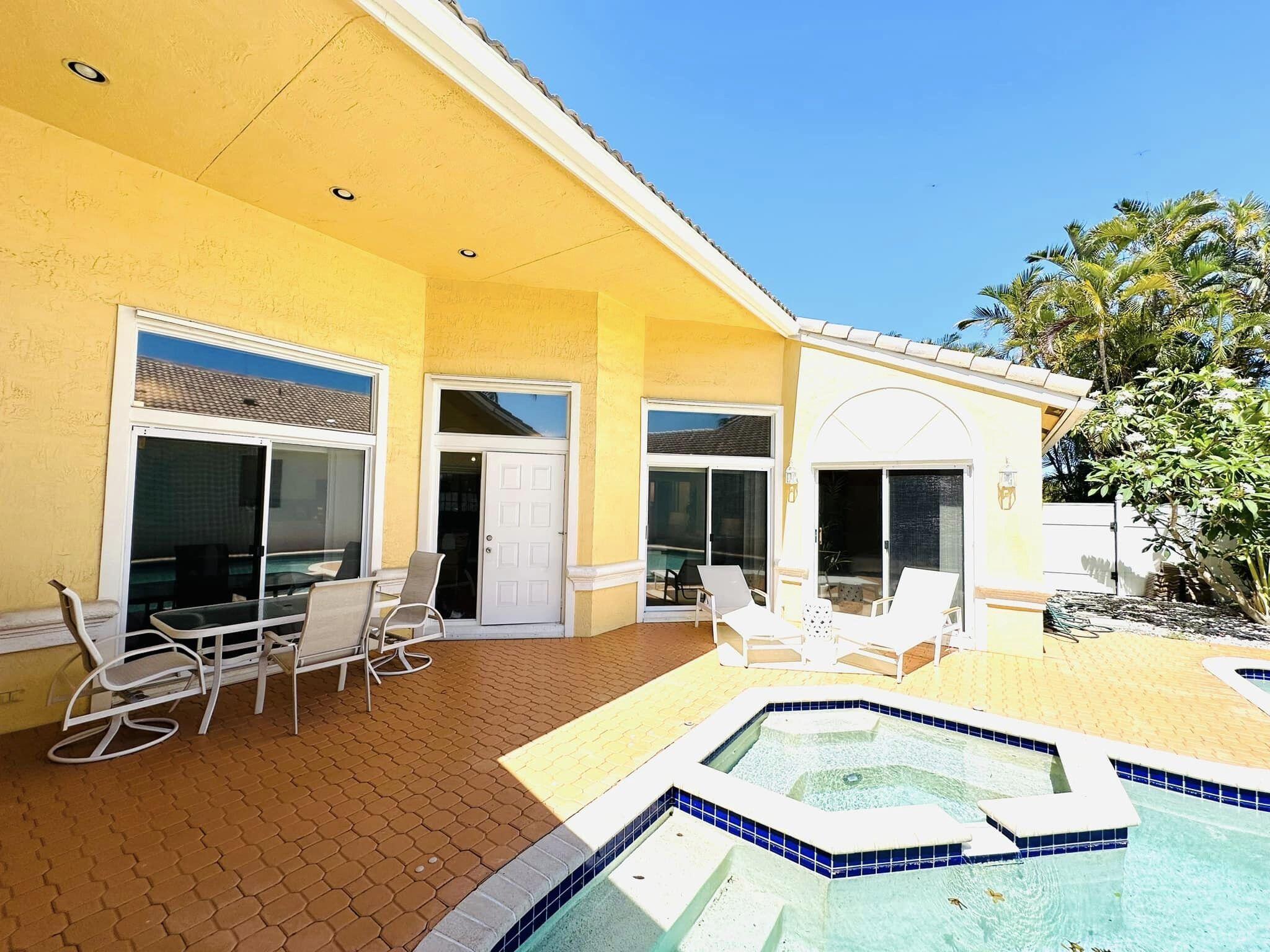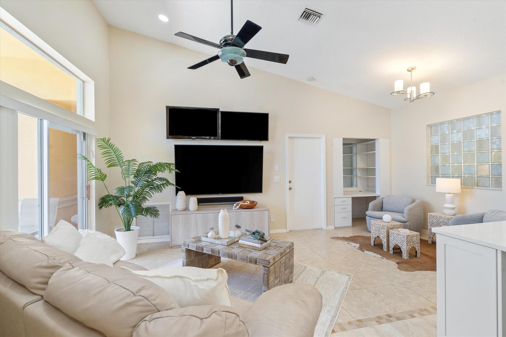 3 bedroom 3 bath courtyard pool home includes a mother in law suite. NEW roof May 2024, updated kitchen, and bathrooms within the last 4 years. Single-story home, gated community of only 41 homes, saltwater lap pool and low HOA dues. Newer AC and a newer hot water heater. Surrounded by a privacy fence, and offers a tranquil outdoor space. Inside, the open concept floor plan coupled with vaulted ceilings and Brazilian hardwood, tile, and laminate flooring that enhance the spacious living area. The sale includes the three TVs and additional surround sound speaker located in the dining room area.
